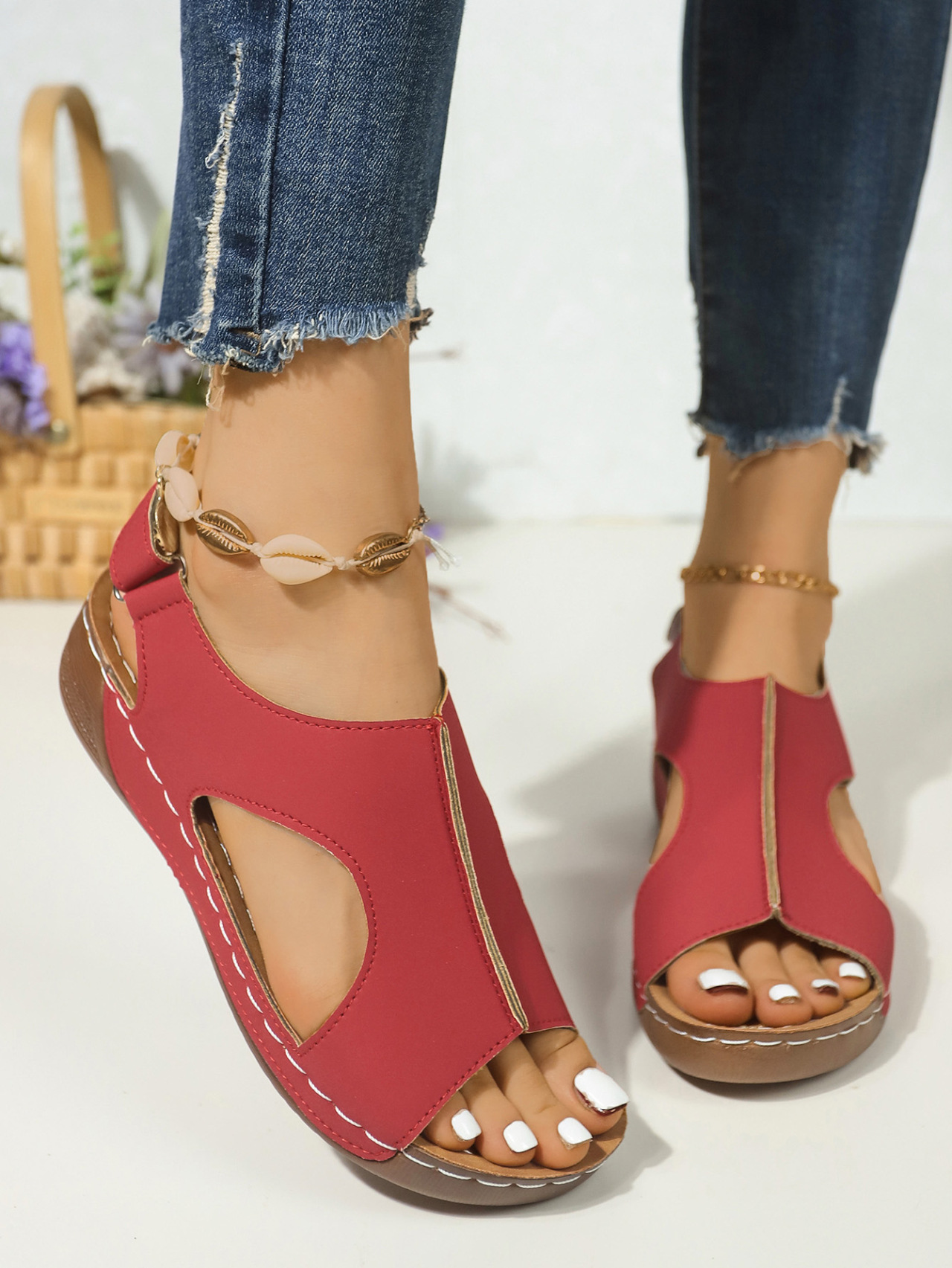 여름 새로운 2024 유럽과 미국의 대외 무역 플러스 사이즈 샌들 여성 자동차 스티칭 통기성 벨크로 할로우 웨지 샌들 여성스토어 가기