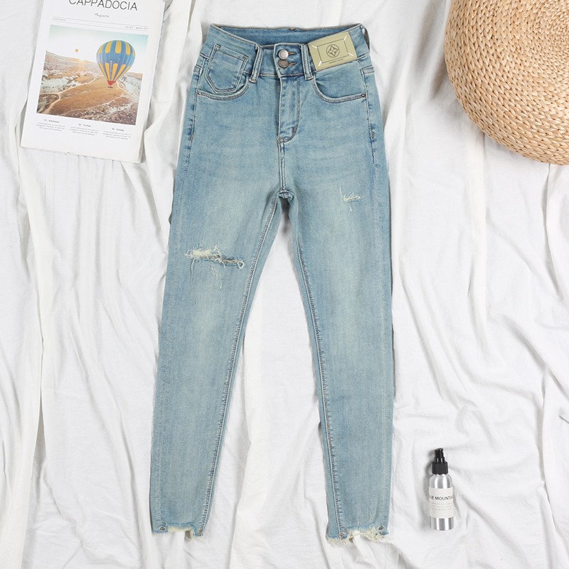 레트로 빈티지 컬러 2025 신상 봄 가을 데미지 데님 펜슬 팬츠 여성용 슬림핏 9부 스모크 팬츠스토어 가기