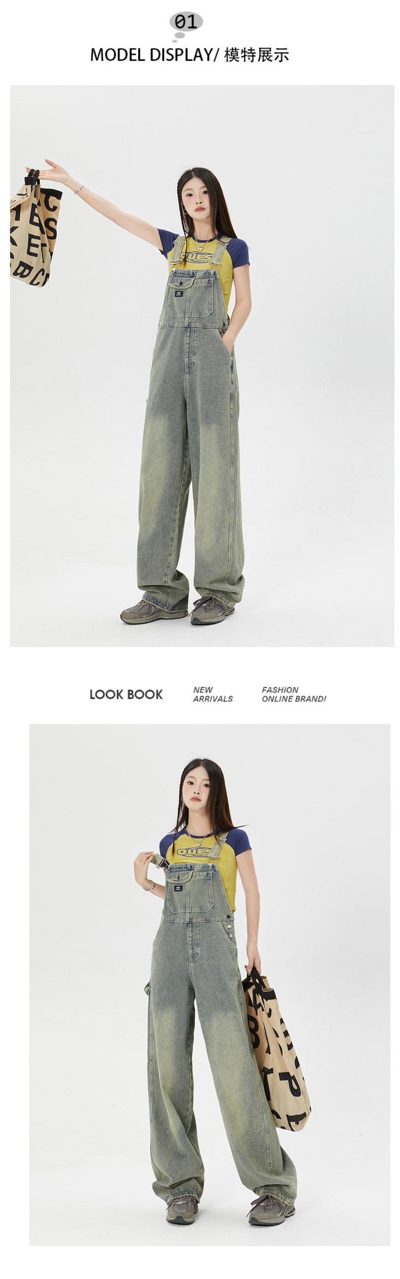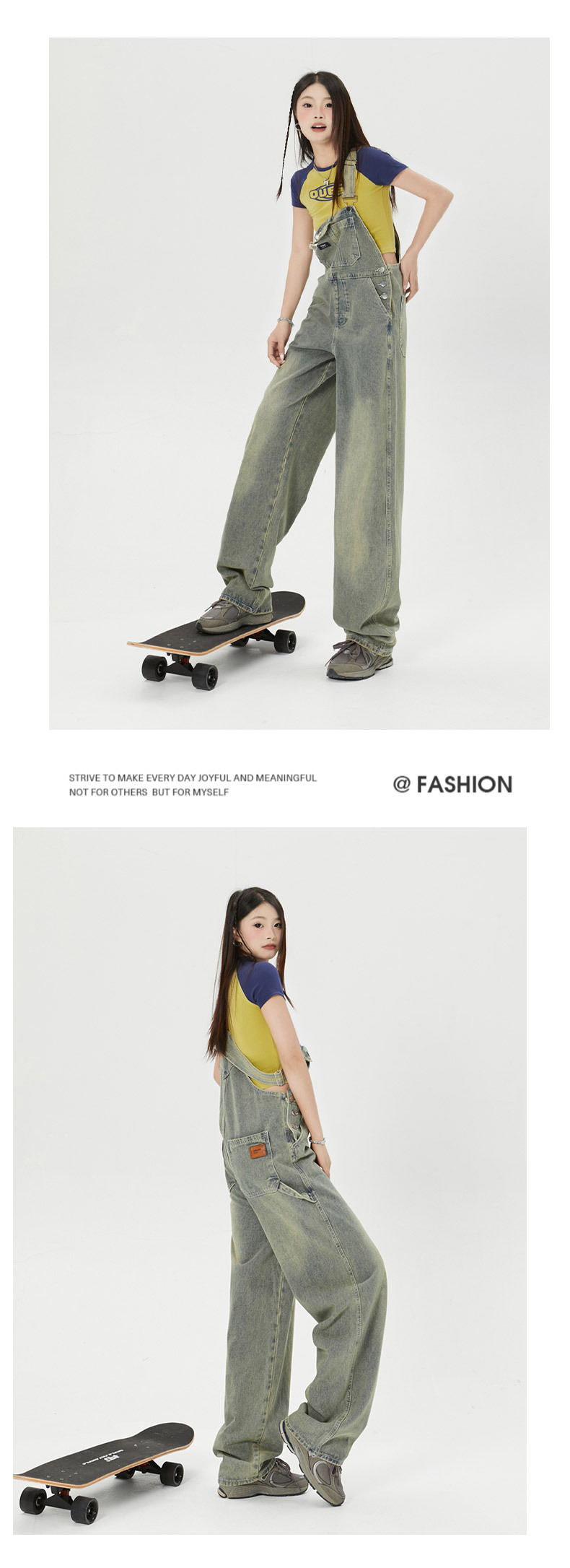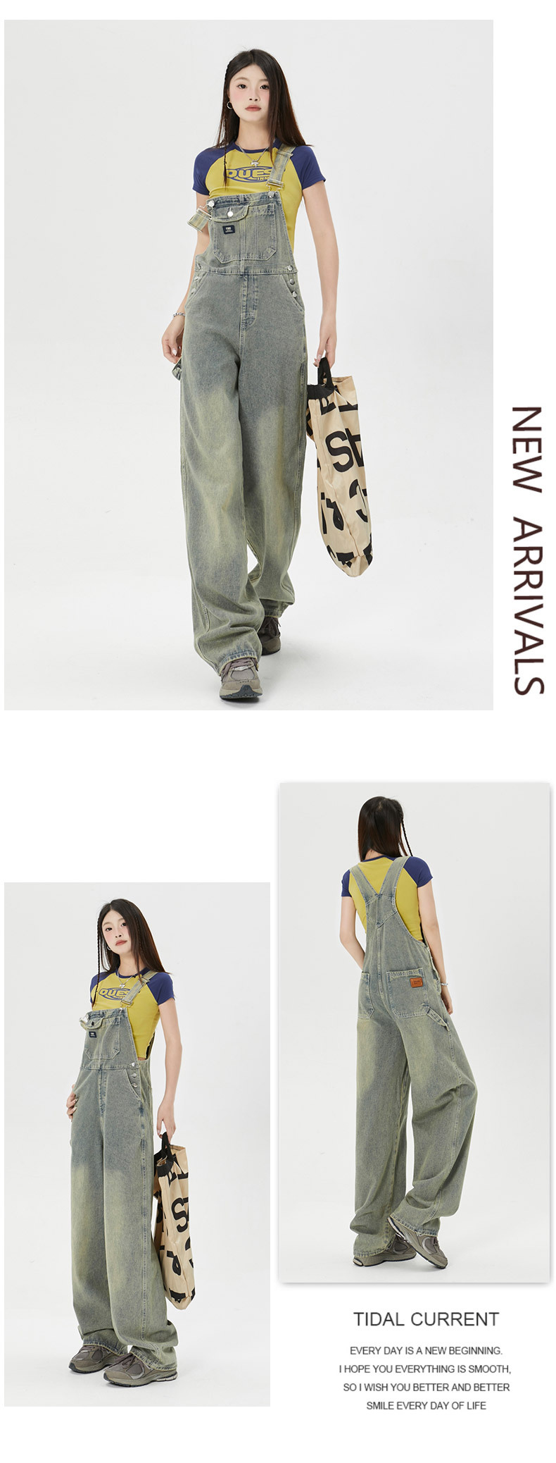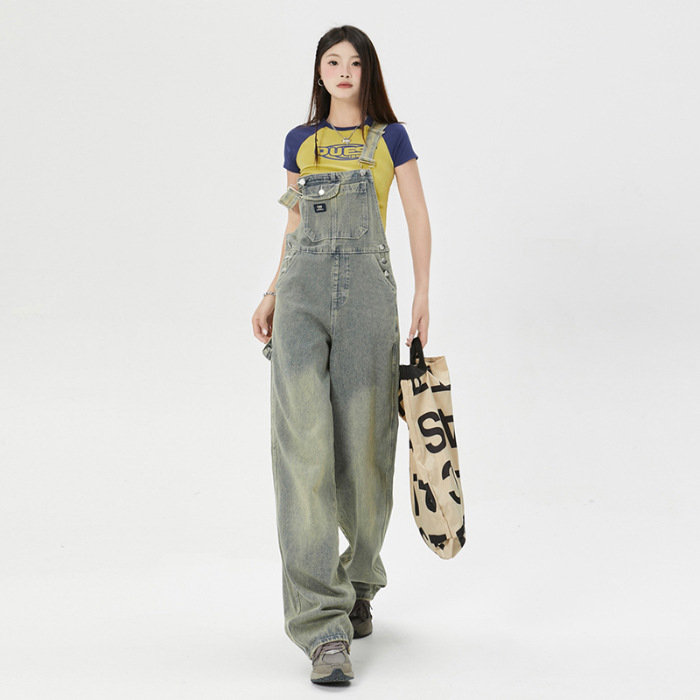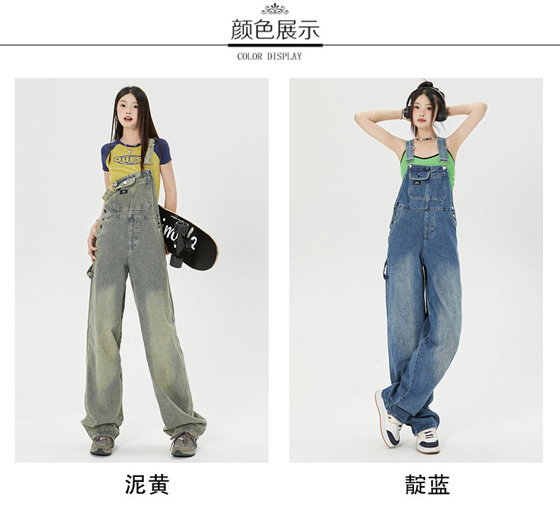 아메리칸 스타일 진흙 노란색 스트랩 청바지 여성의 2024 여름 새로운 스트레이트 튜브 느슨한 넓은 다리 오버 피팅 바지스토어 가기