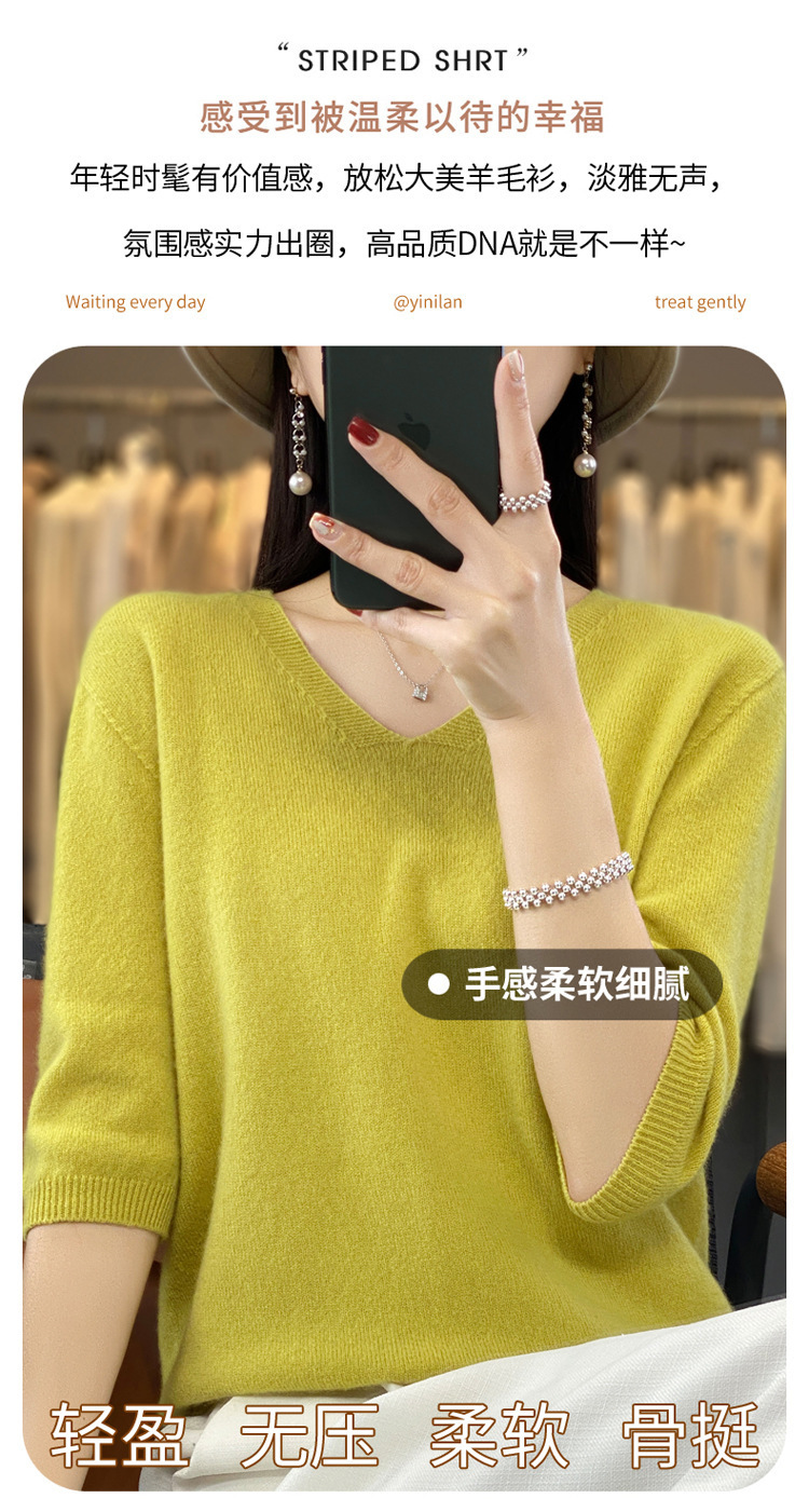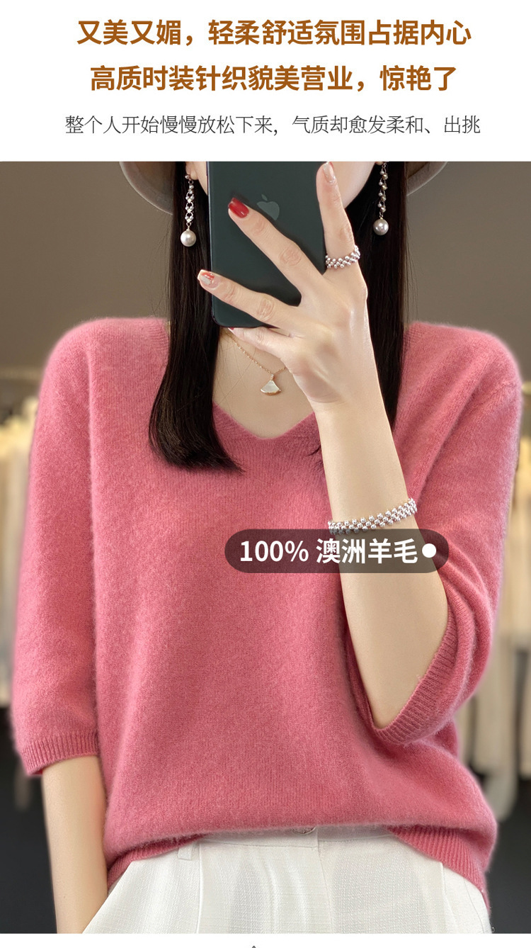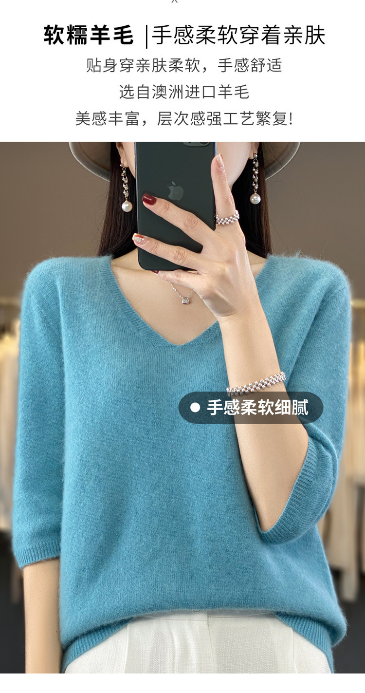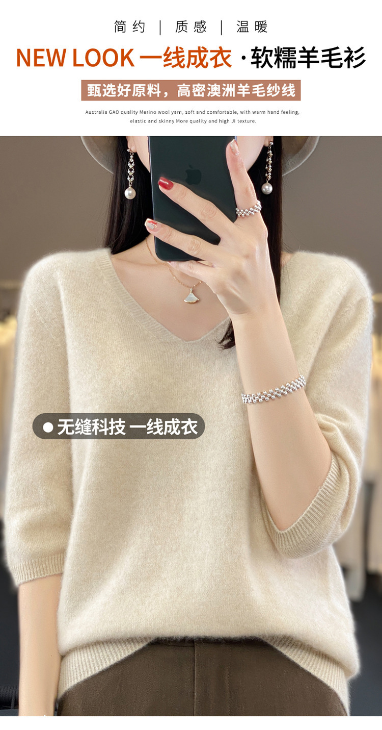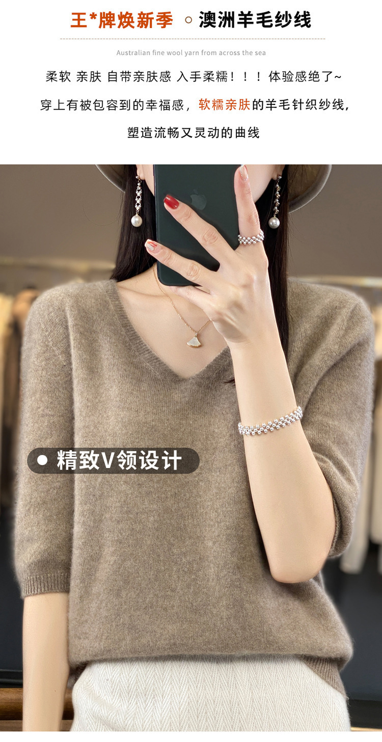 一线成衣100%纯羊毛2023秋冬新款女V领短款五分袖宽松针织衫毛衣
