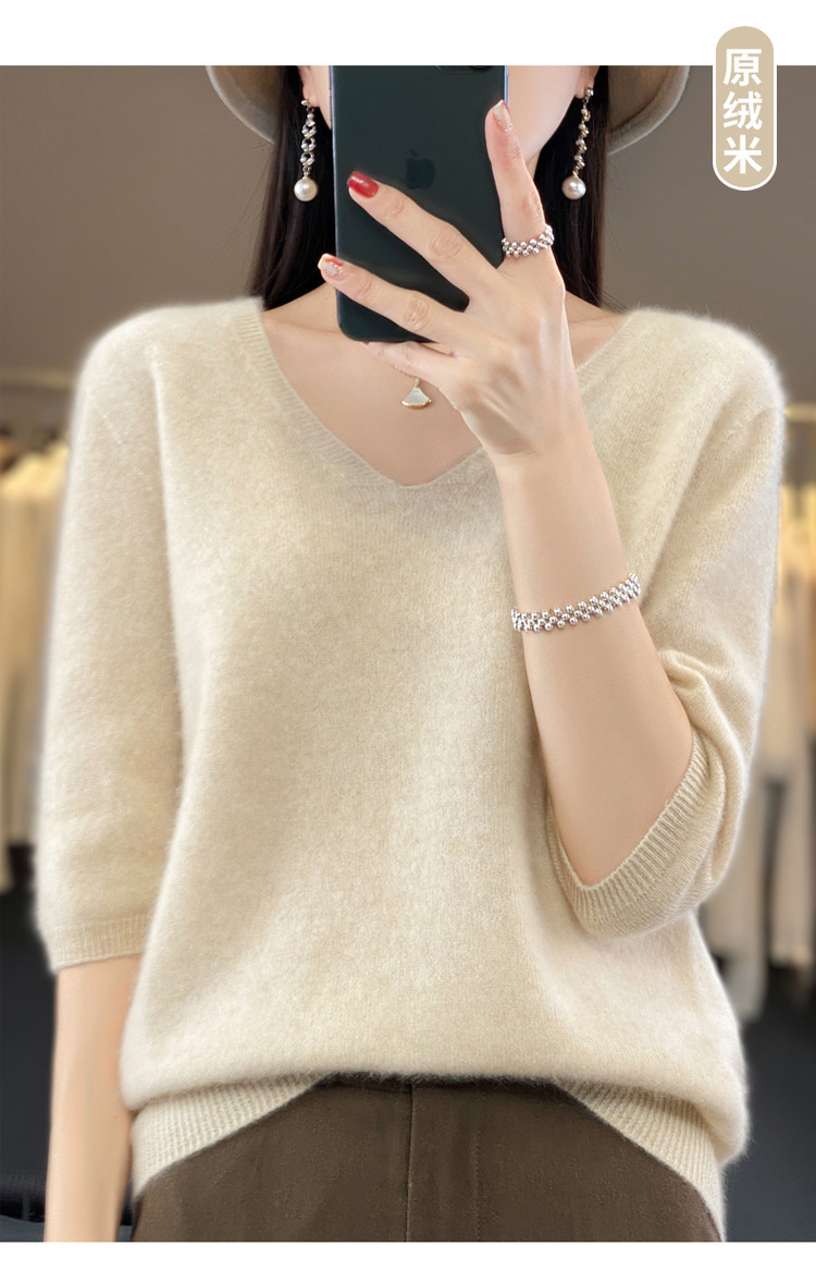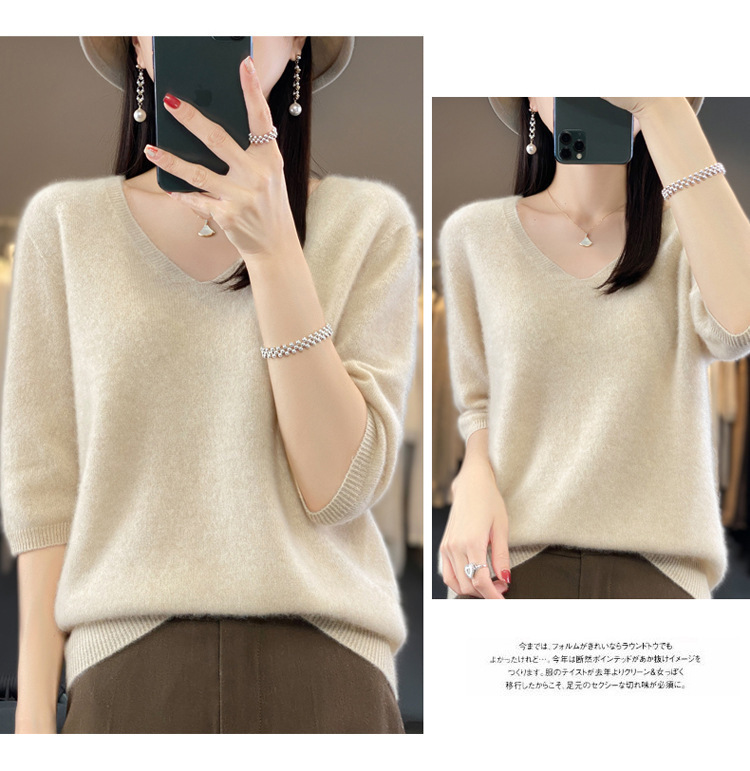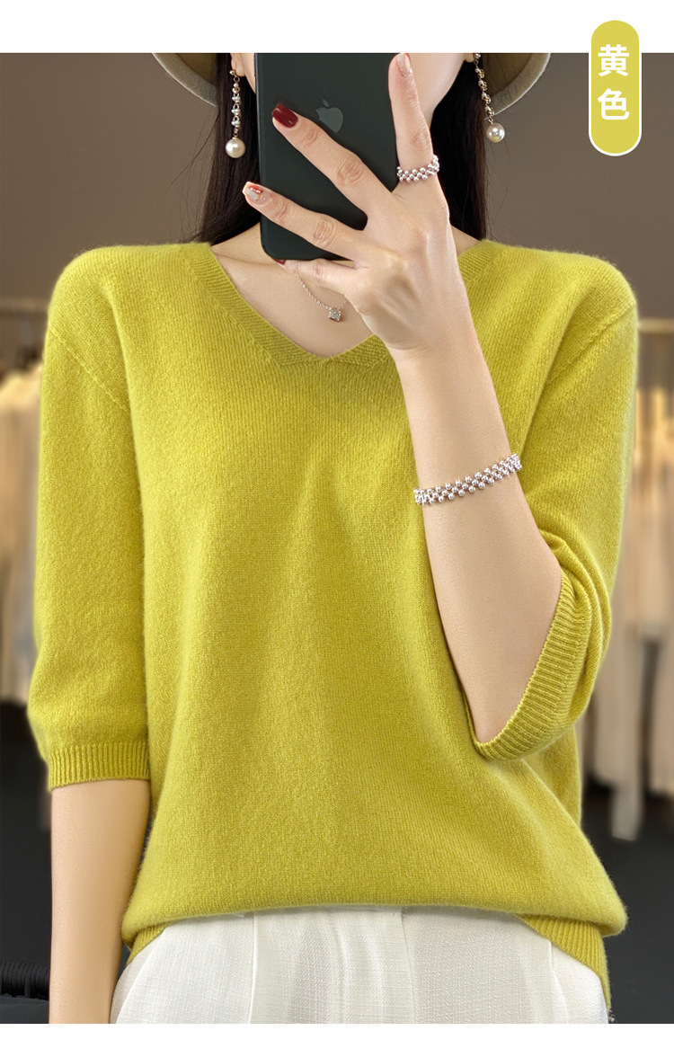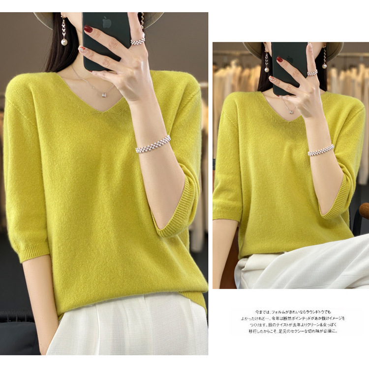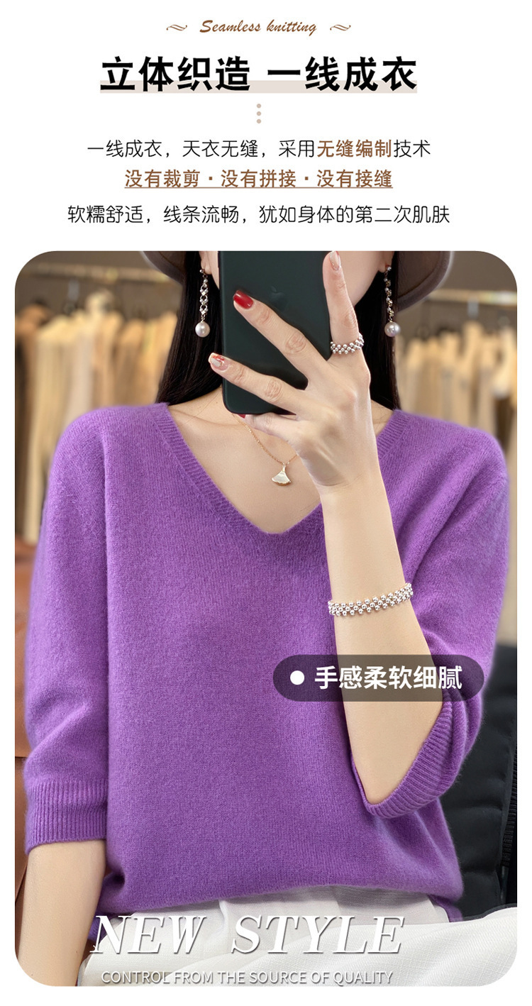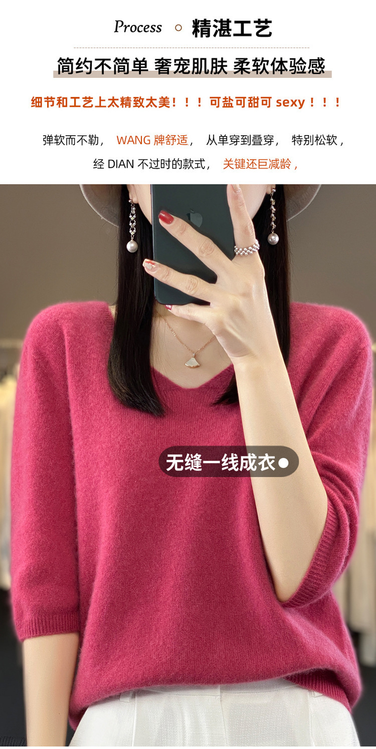 一线成衣100%纯羊毛2023秋冬新款女V领短款五分袖宽松针织衫毛衣
