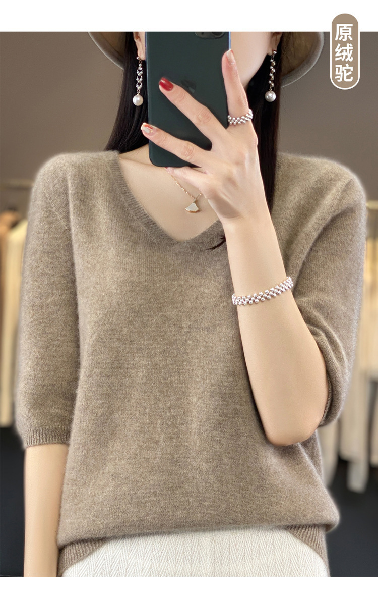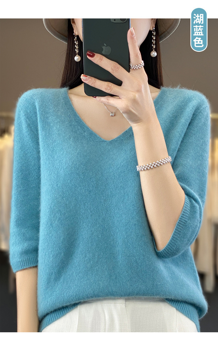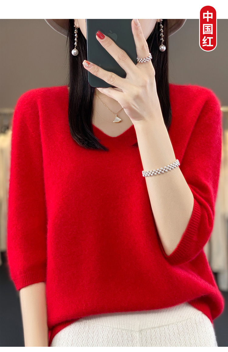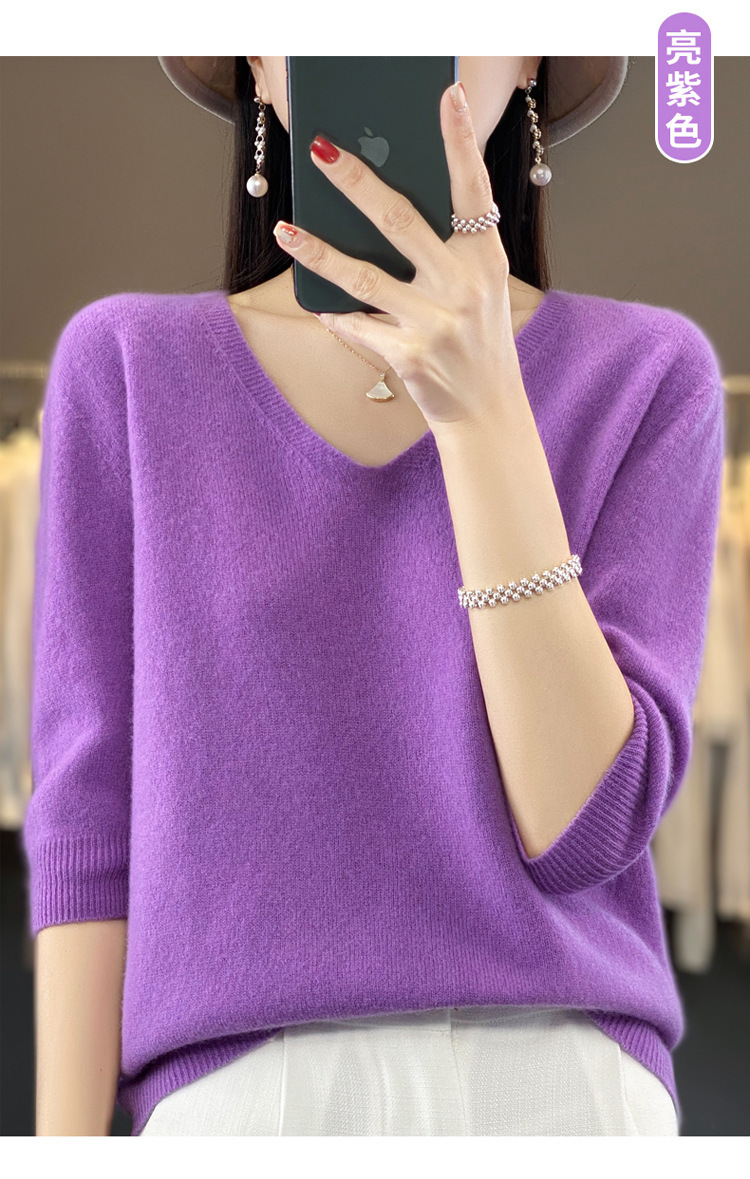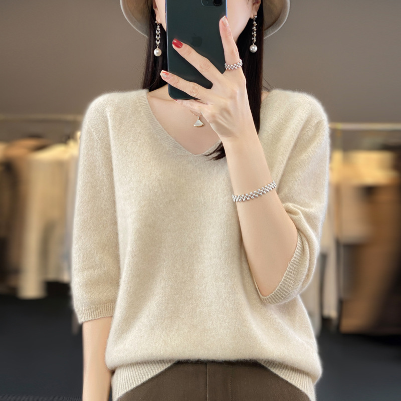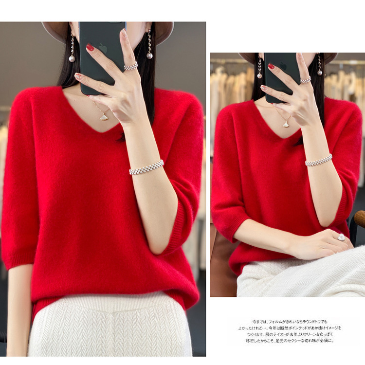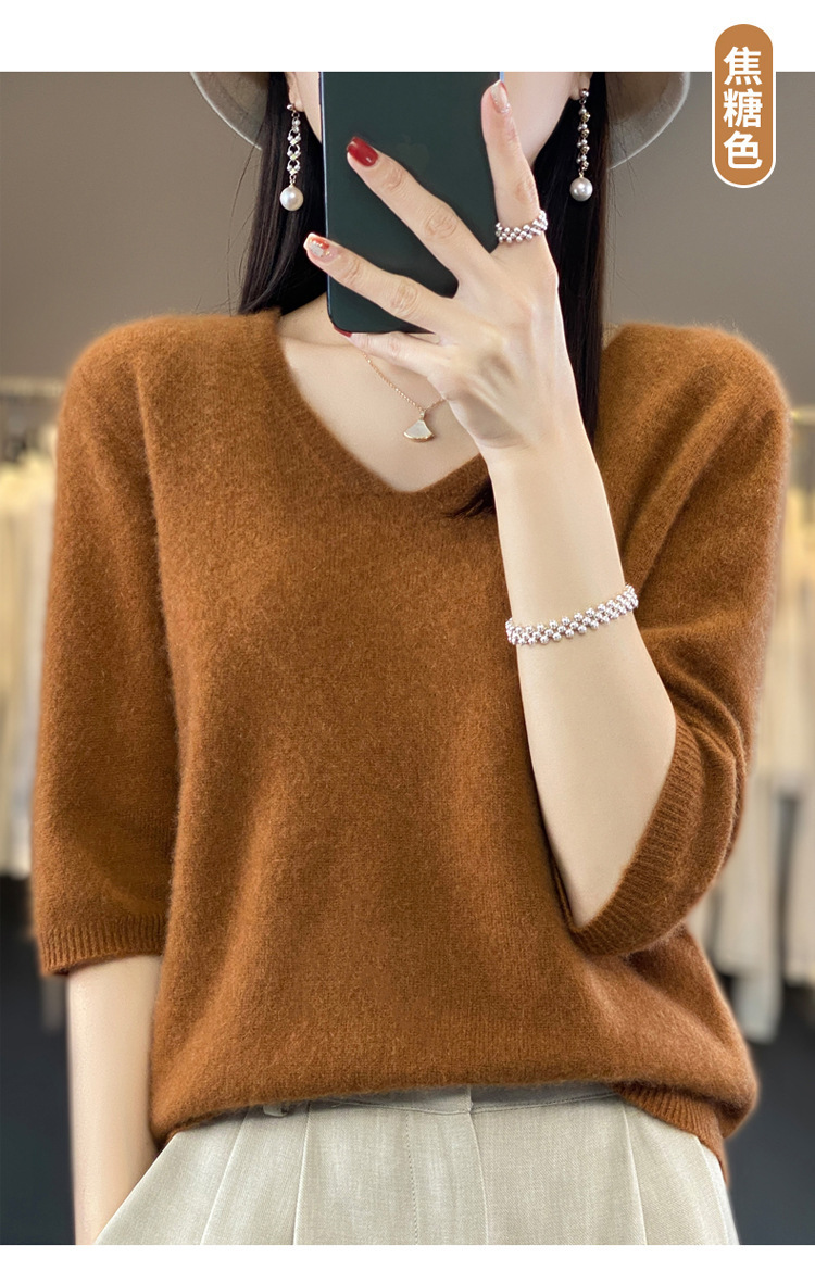 一线成衣100%纯羊毛2023秋冬新款女V领短款五分袖宽松针织衫毛衣