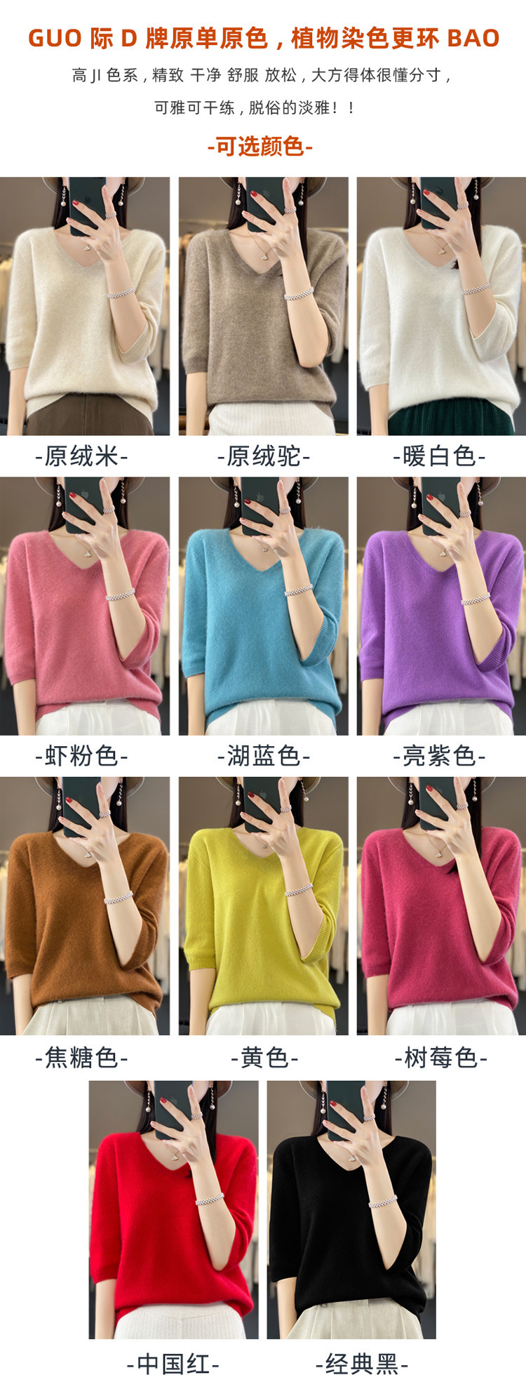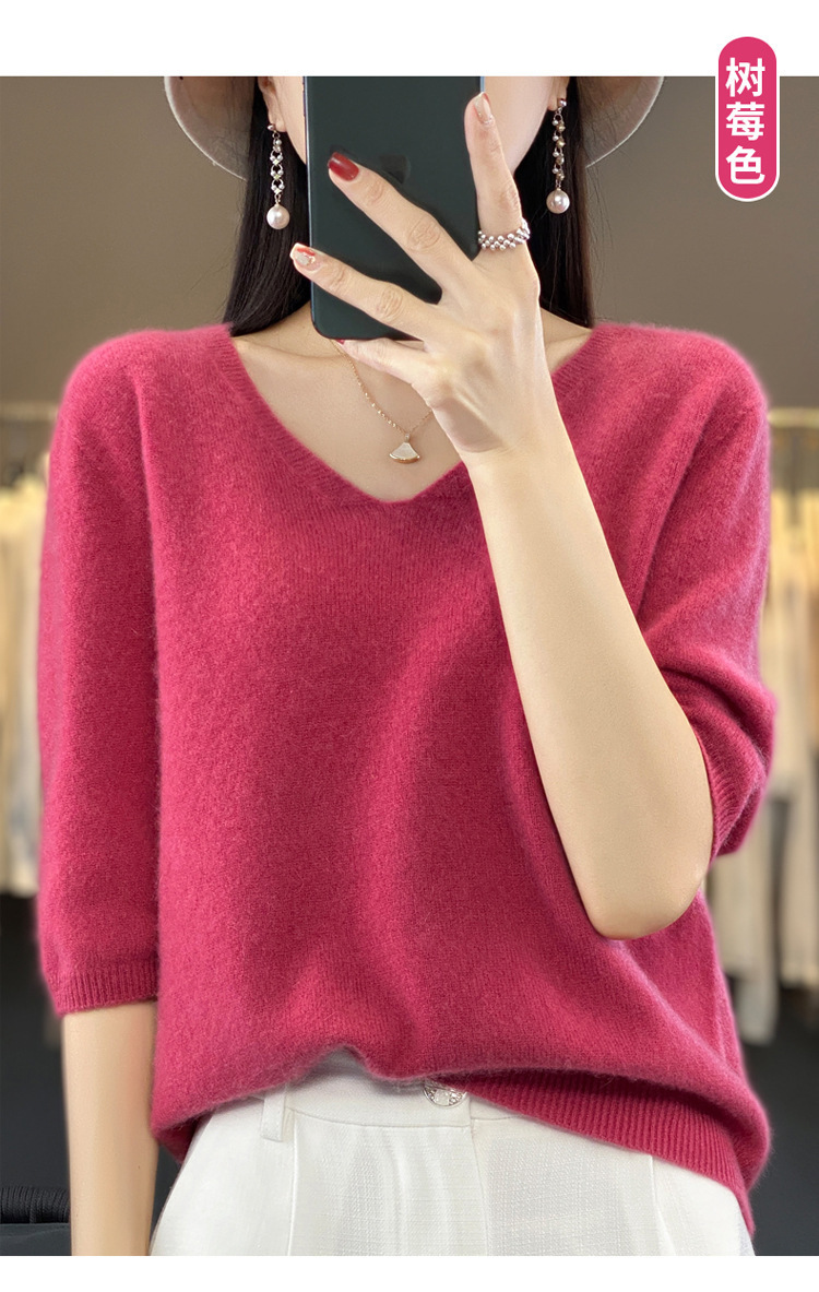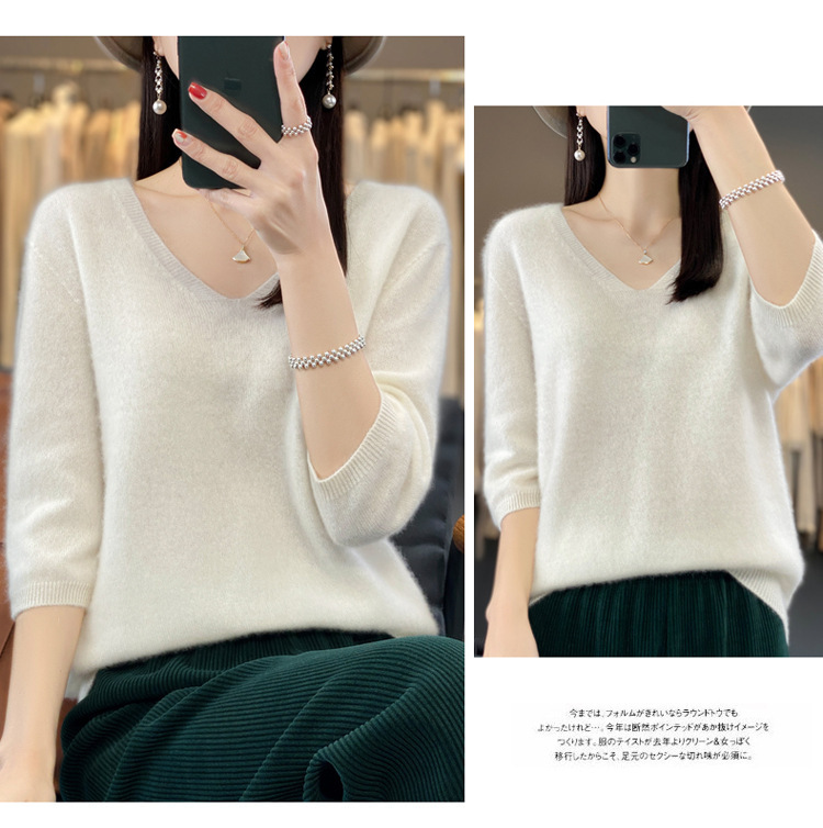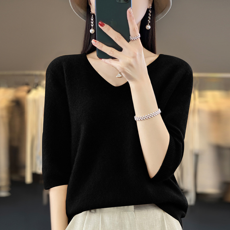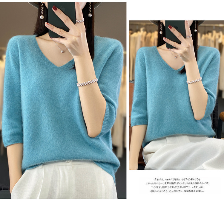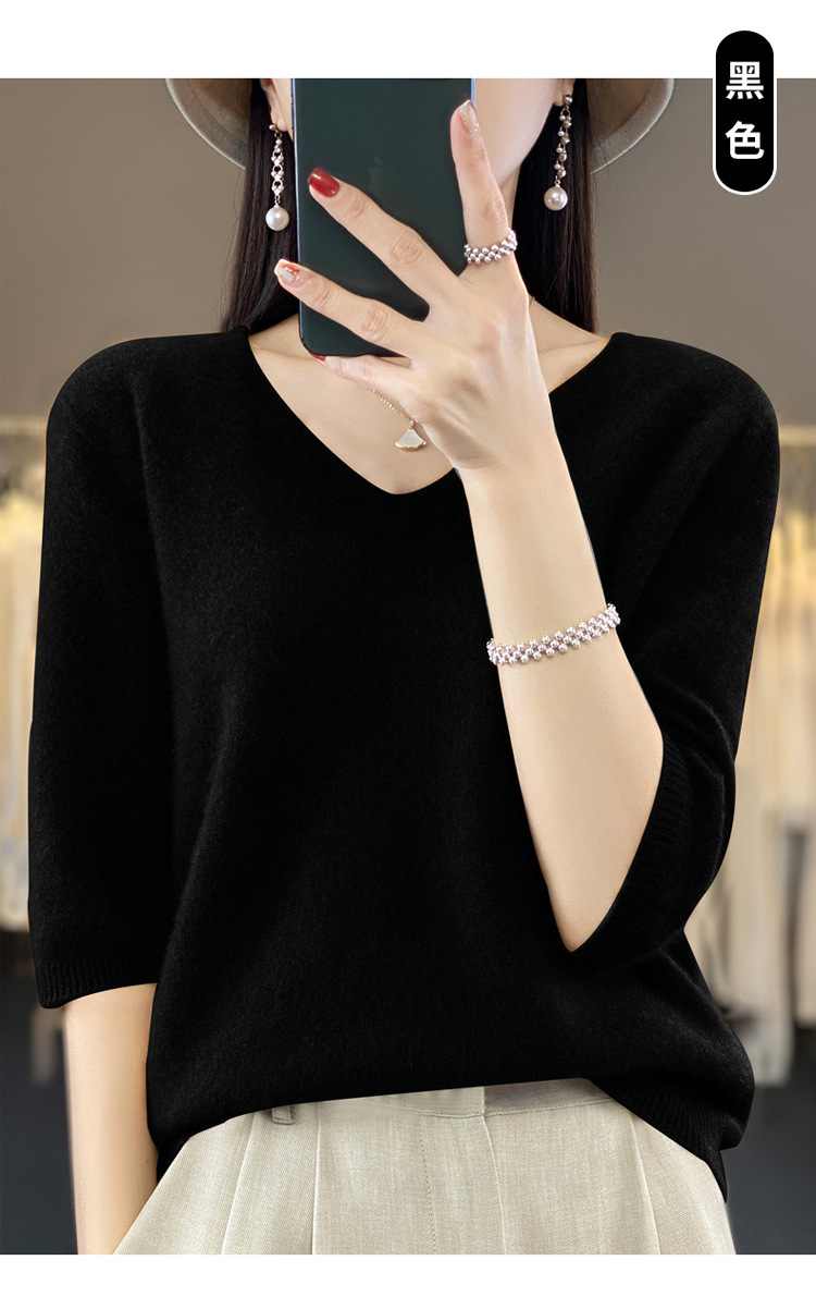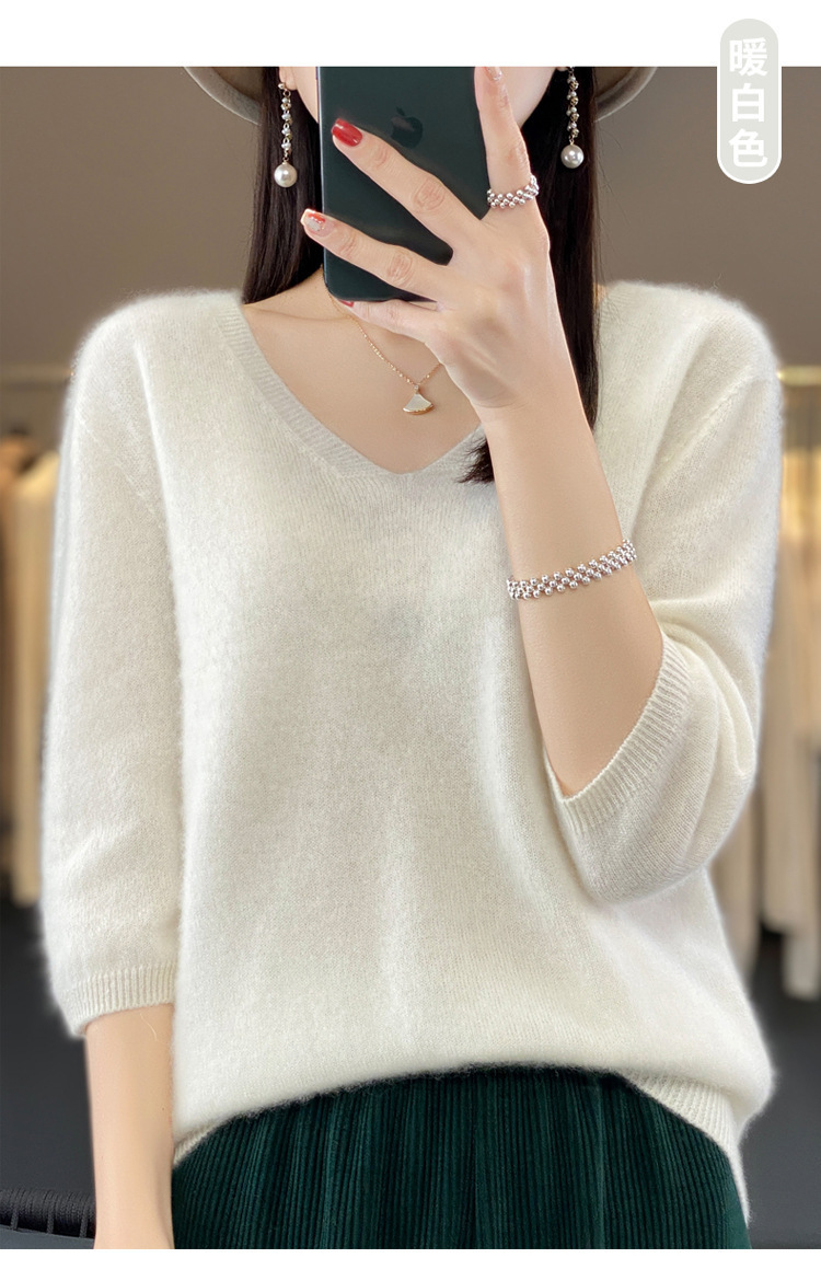 一线成衣100%纯羊毛2023秋冬新款女V领短款五分袖宽松针织衫毛衣