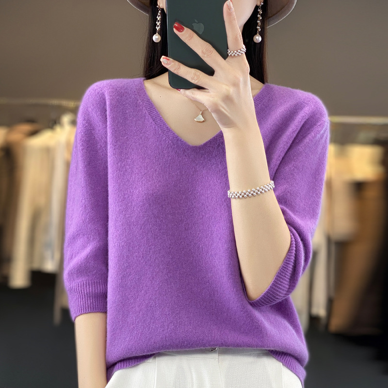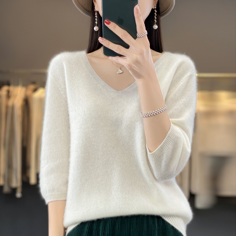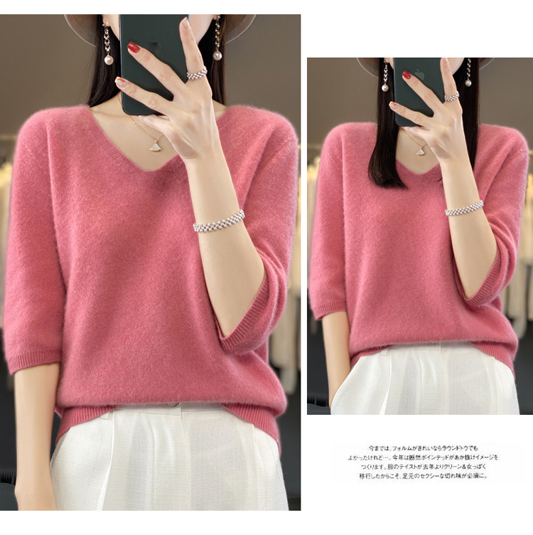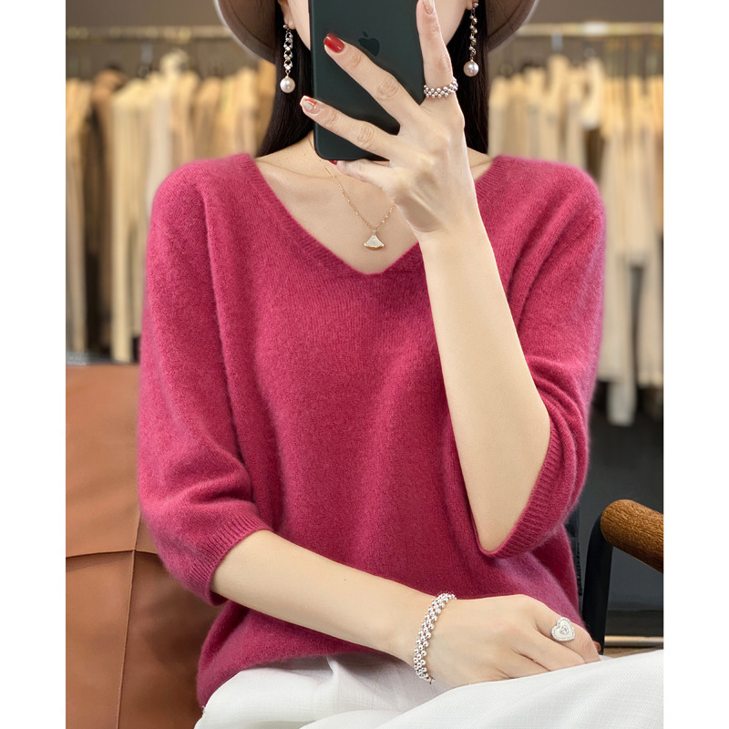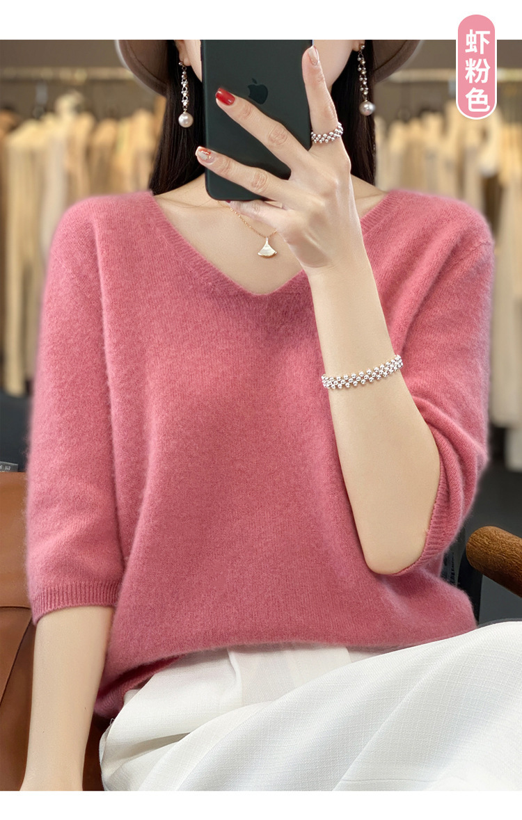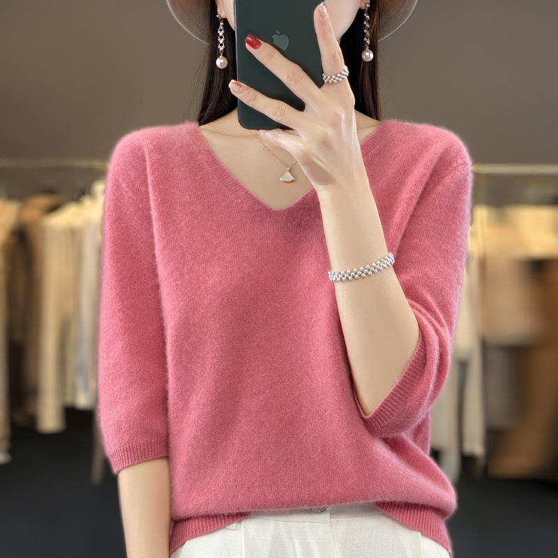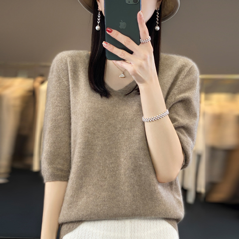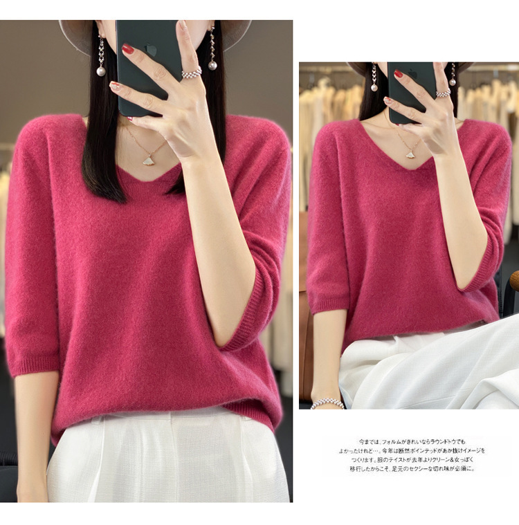 一线成衣100%纯羊毛2023秋冬新款女V领短款五分袖宽松针织衫毛衣