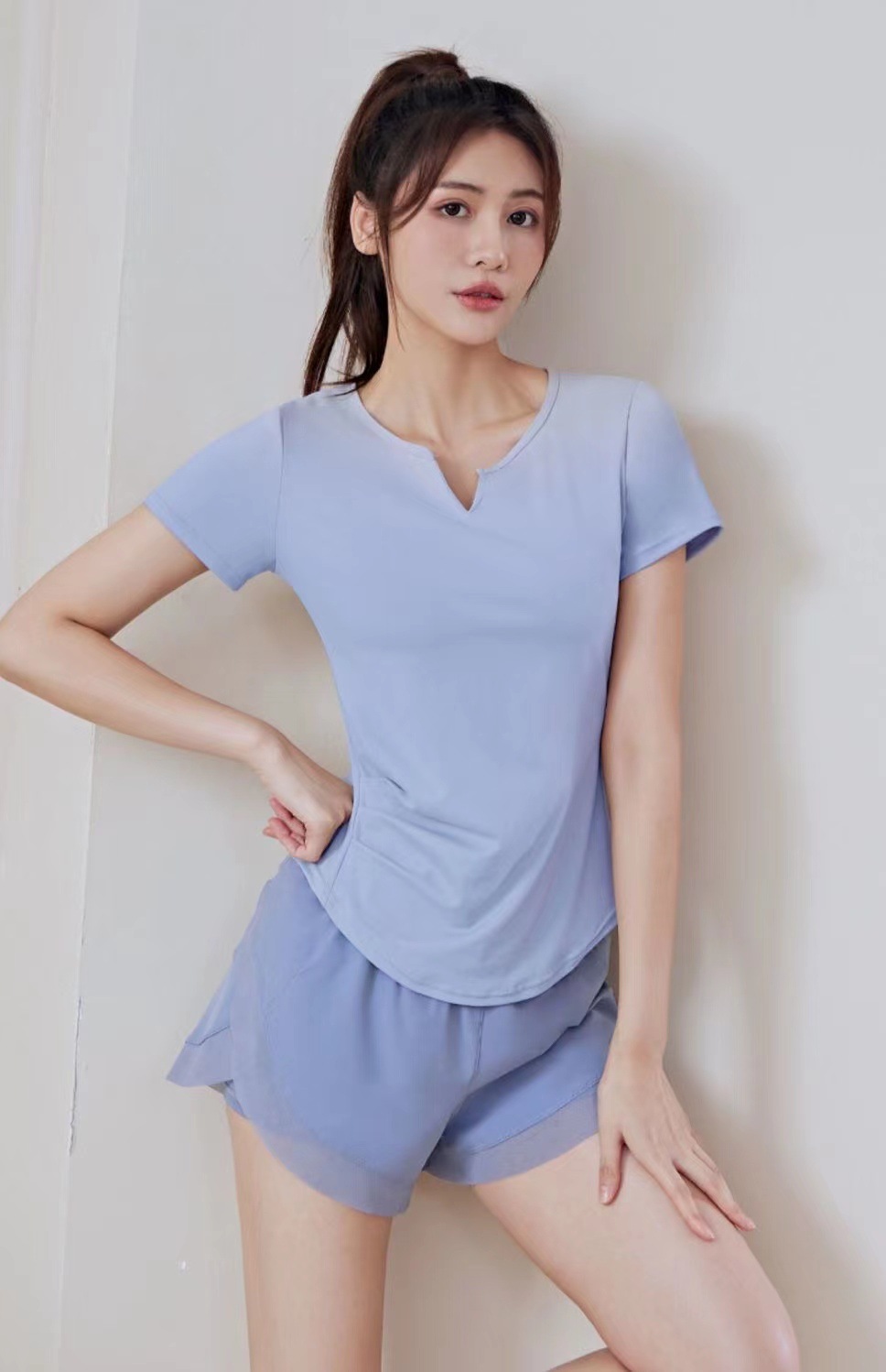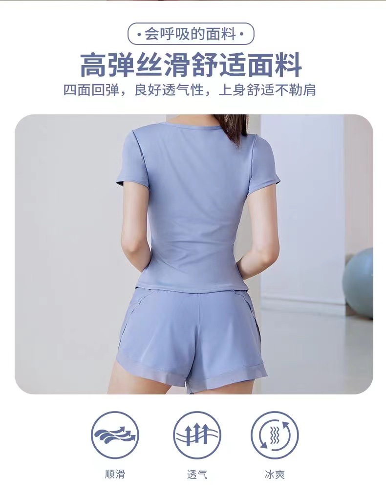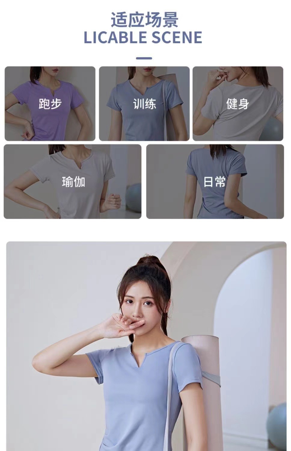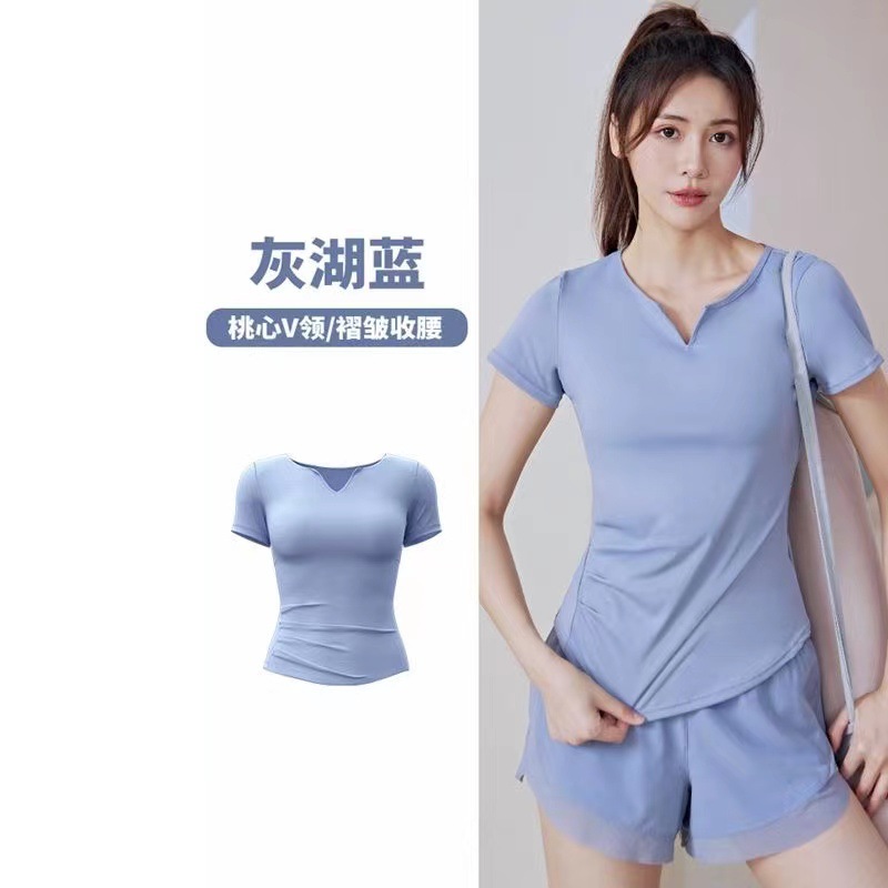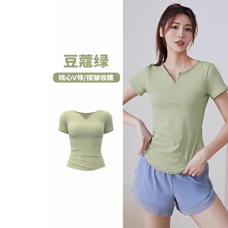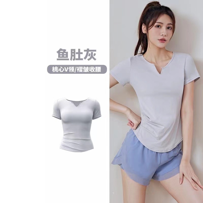 새로운 작은 V-벨 요가 의류 최고 여성 여름 달리기 빠른 건조 스포츠 티셔츠 타이트 허리 피트니스 필라테 짧은 소매