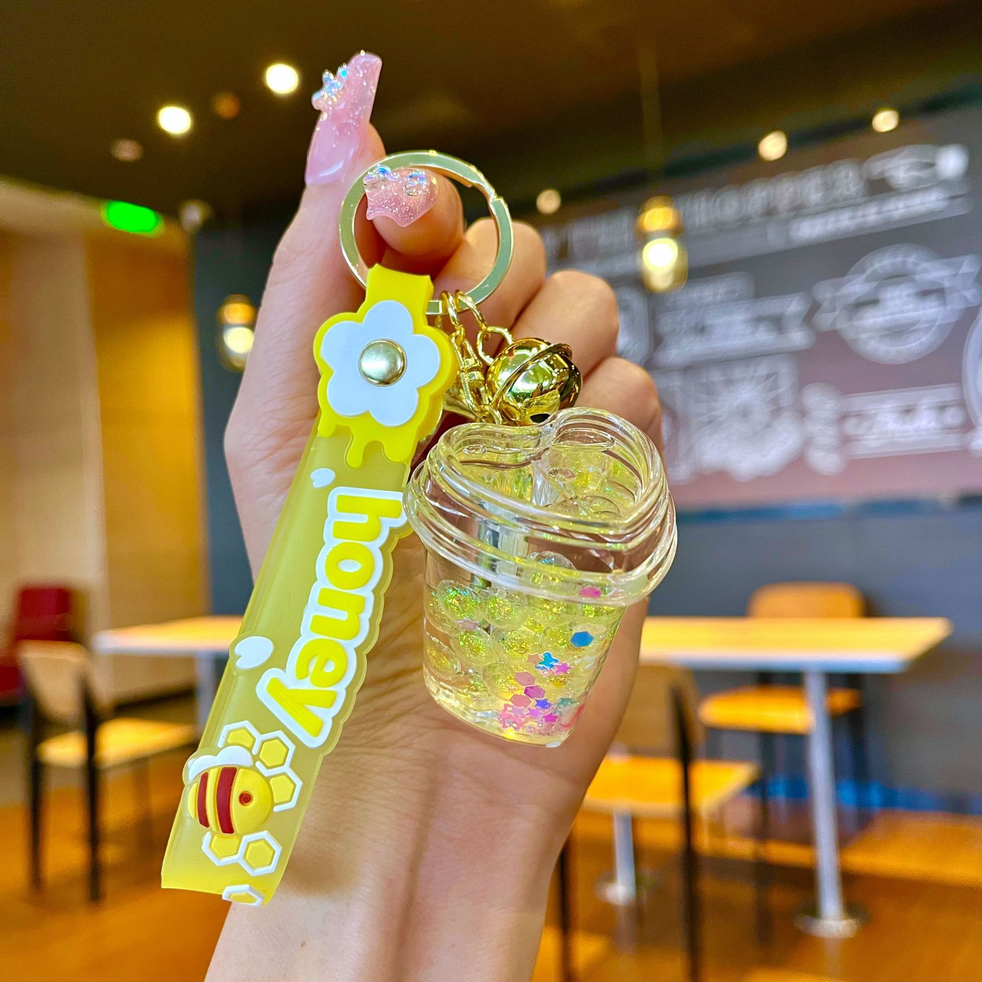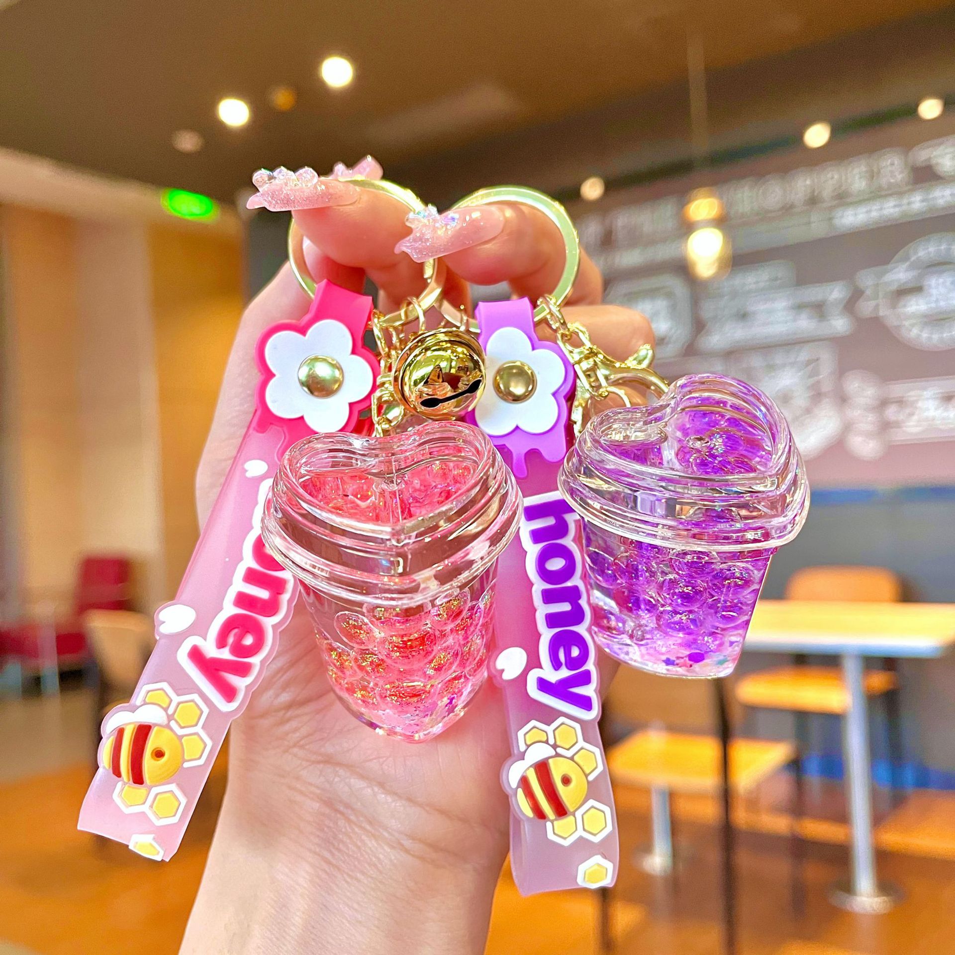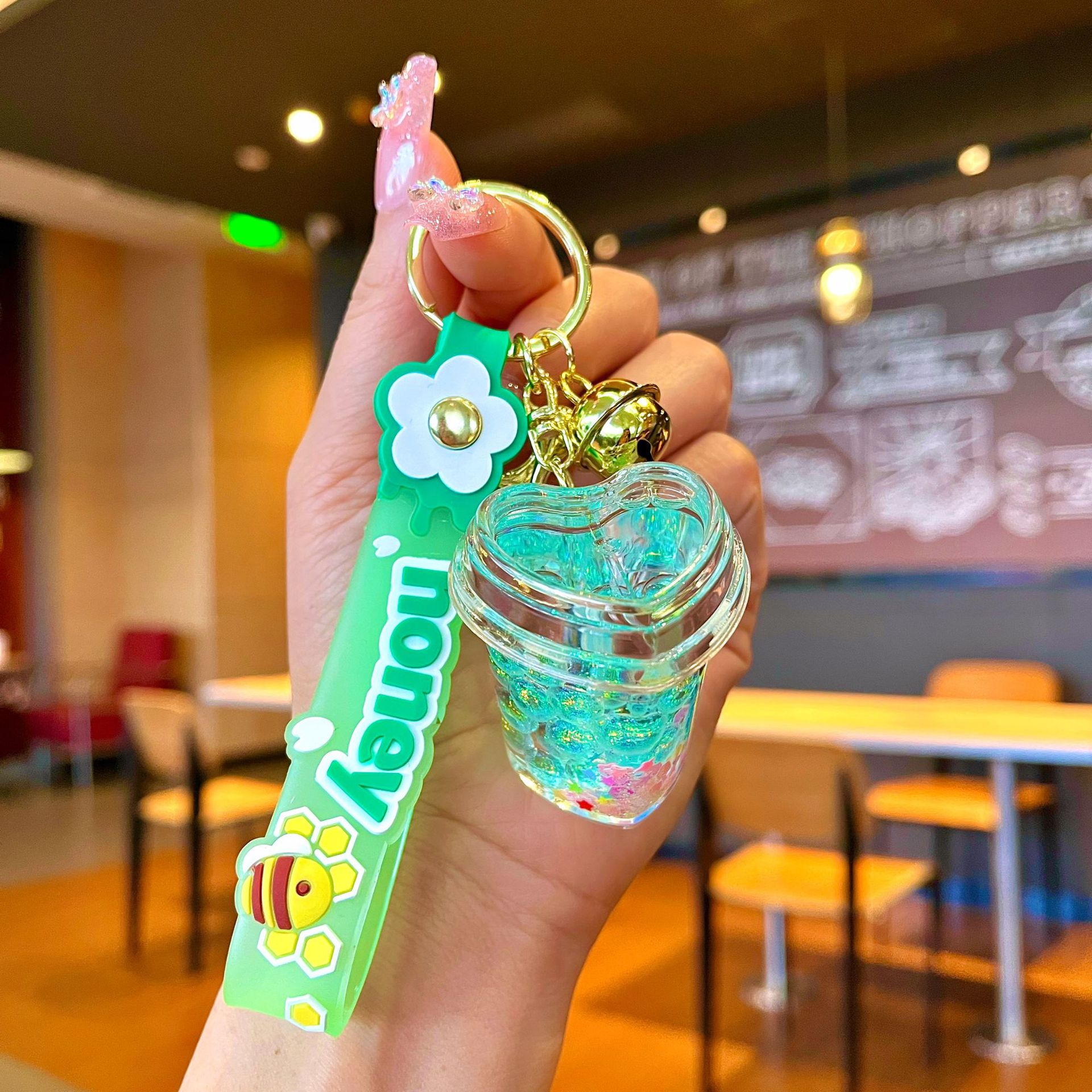 오일 아크릴 빛나는 사랑 요구르트 컵 키 체인 퀵 샌드 키 체인 백 펜던트 클로 기계 선물 도매스토어 가기