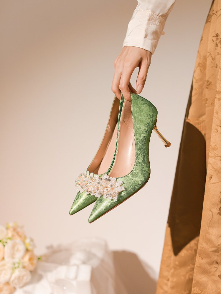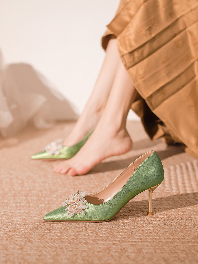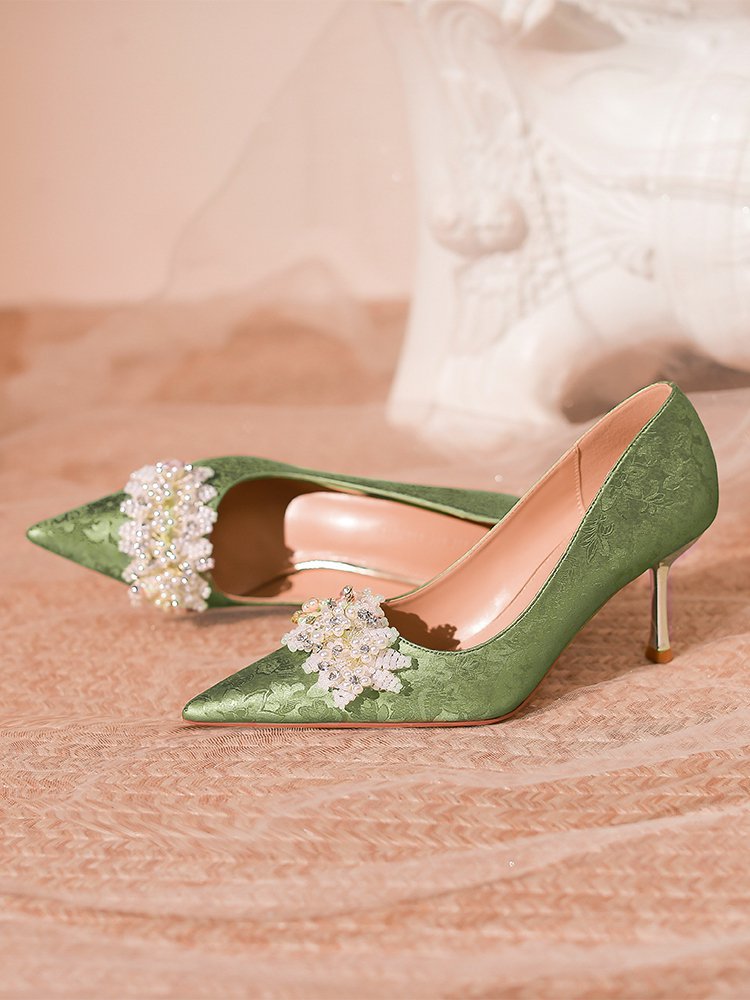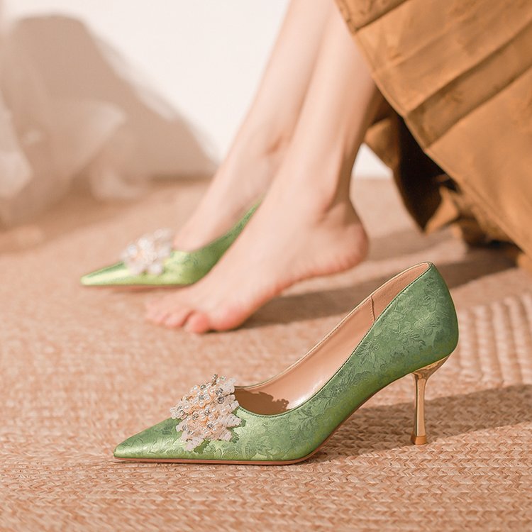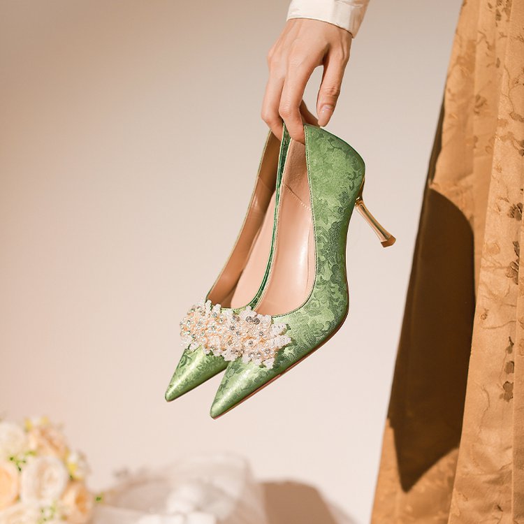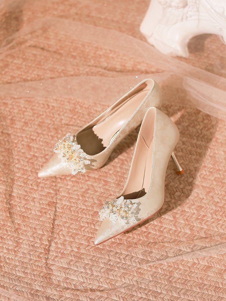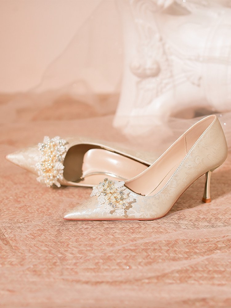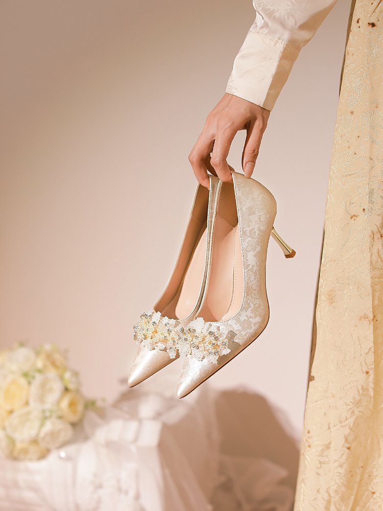 프랑스 스타일 웨딩 슈즈 2024 새로운 뾰족한 스틸레토 힐 플라워 비즈 하이힐 라인스톤 스퀸 크리스탈 슈즈 하이힐스토어 가기