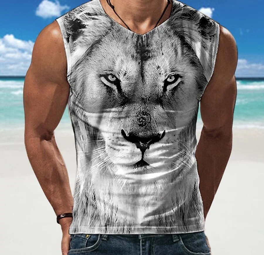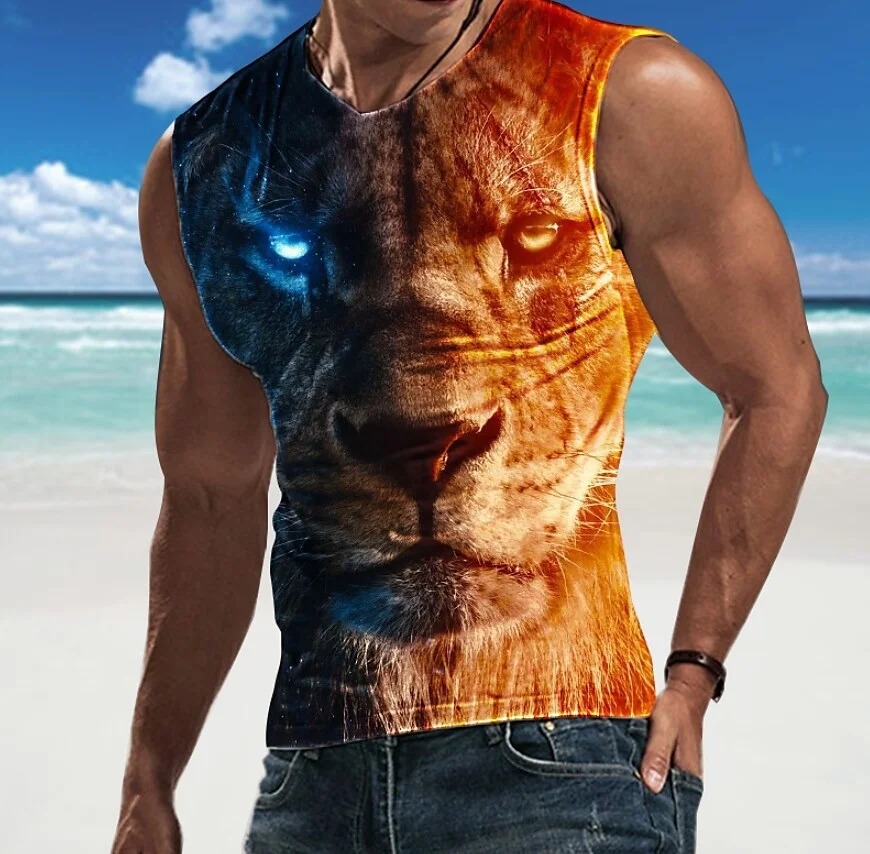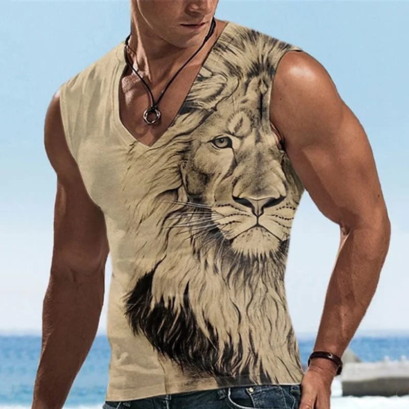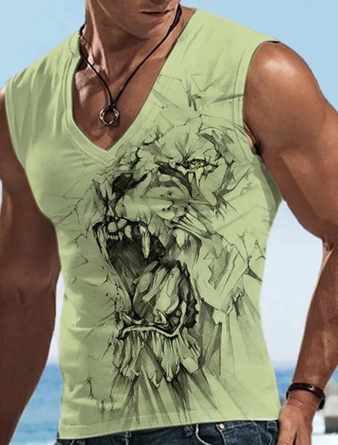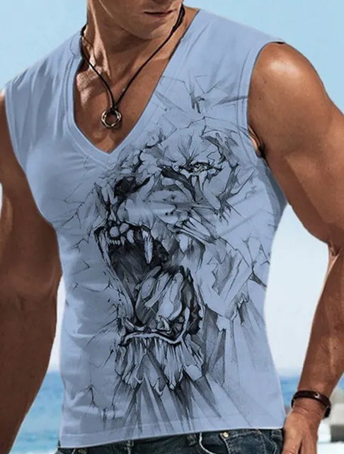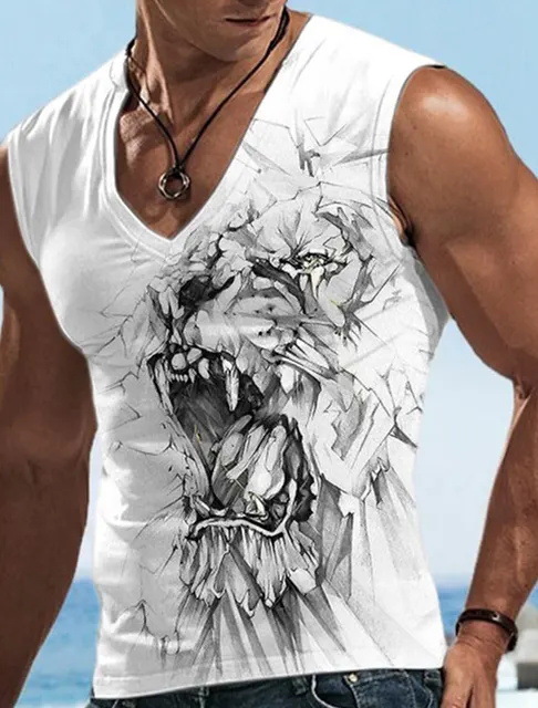 남성용 로우 칼라 민소매 V-Neck 티셔츠 남성용 여름 퓨어 코튼 스포츠 피트니스 조끼 타이거 프린트 트렌디 솔리드 컬러 WN12스토어 가기