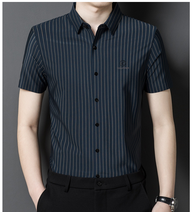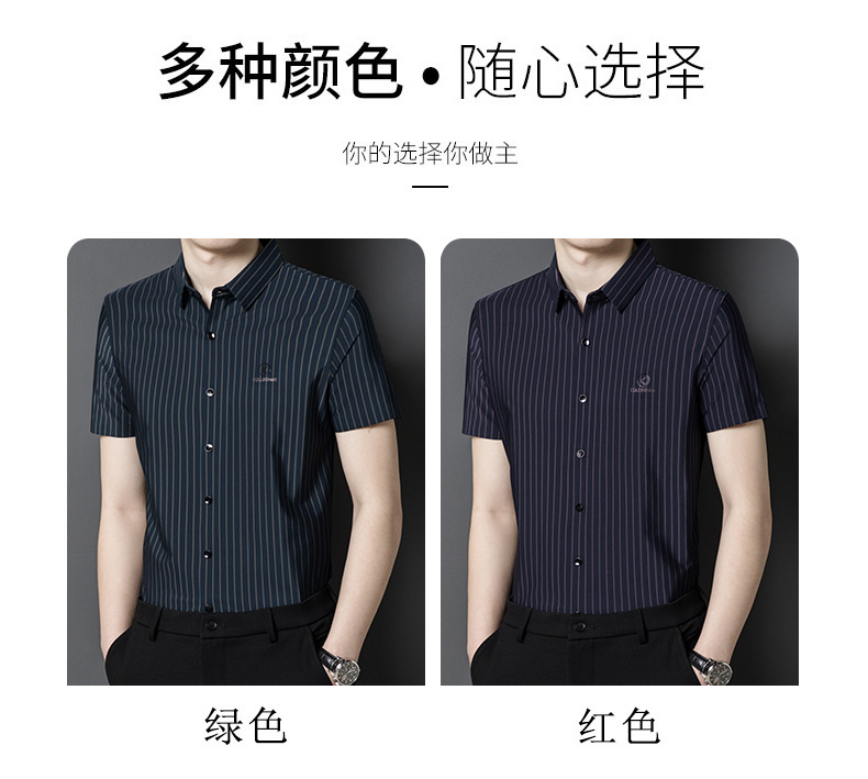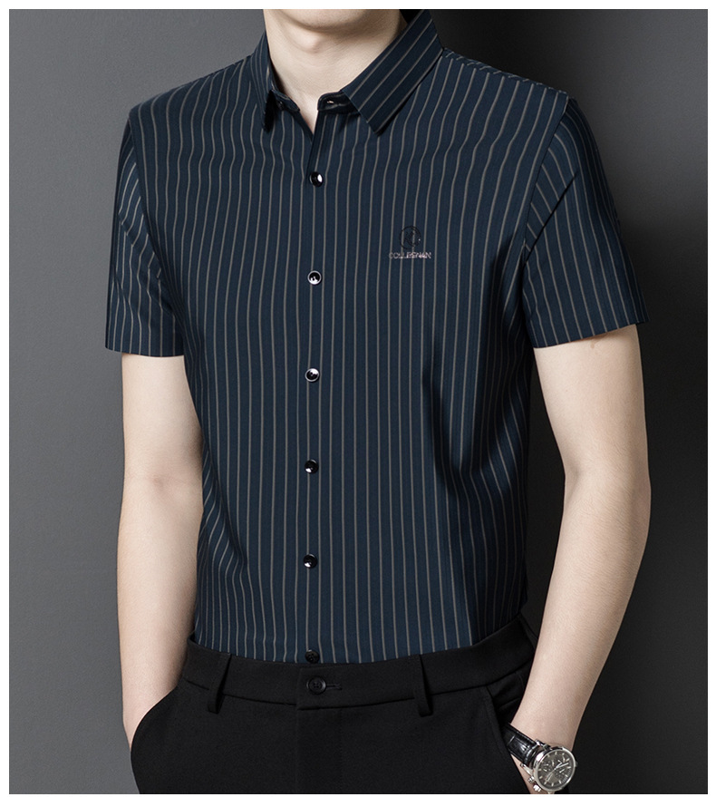 여름 아이스 실크 추적없는 수직 줄무늬 반팔 셔츠 남성 비즈니스 캐주얼 비 다림질 높은 스트레치 반소매 빠른 건조 셔츠스토어 가기