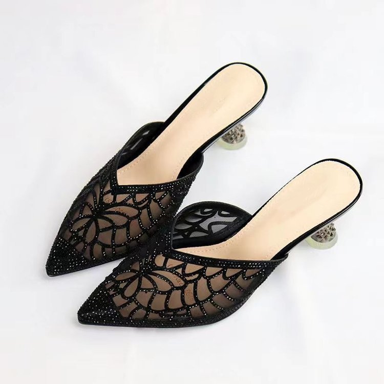 Baotou 하프 슬리퍼 여성 여름 2024 새로운 스타일 메쉬 라인스톤 포인팅 힐 사이버 유명 하이힐 아우터 웨어 샌들
