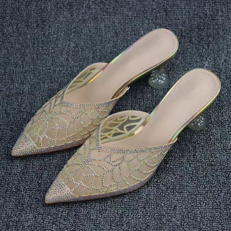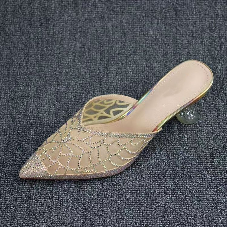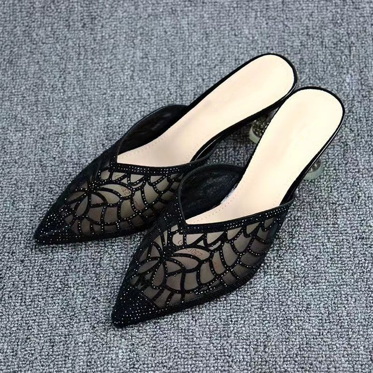 Baotou 하프 슬리퍼 여성 여름 2024 새로운 스타일 메쉬 라인스톤 포인팅 힐 사이버 유명 하이힐 아우터 웨어 샌들스토어 가기