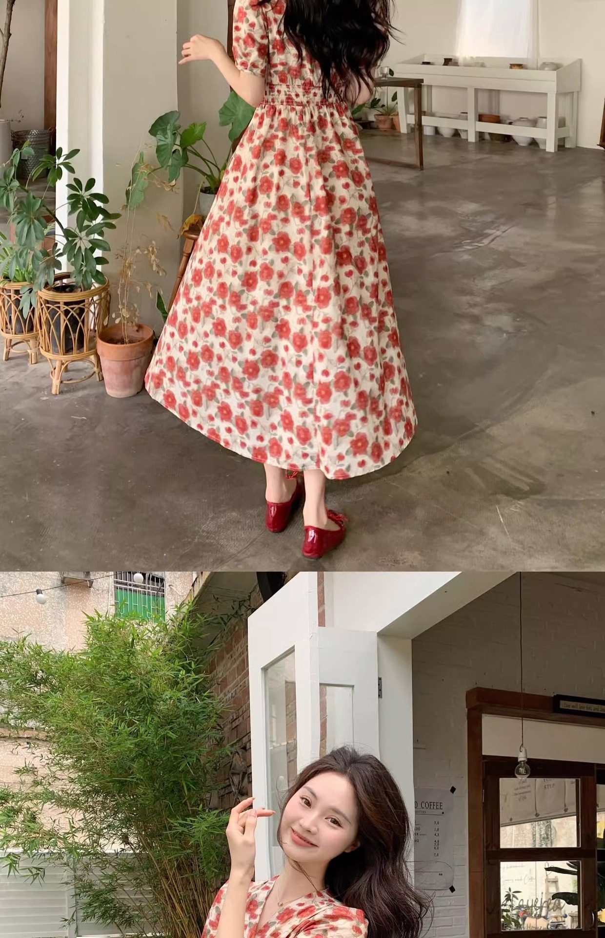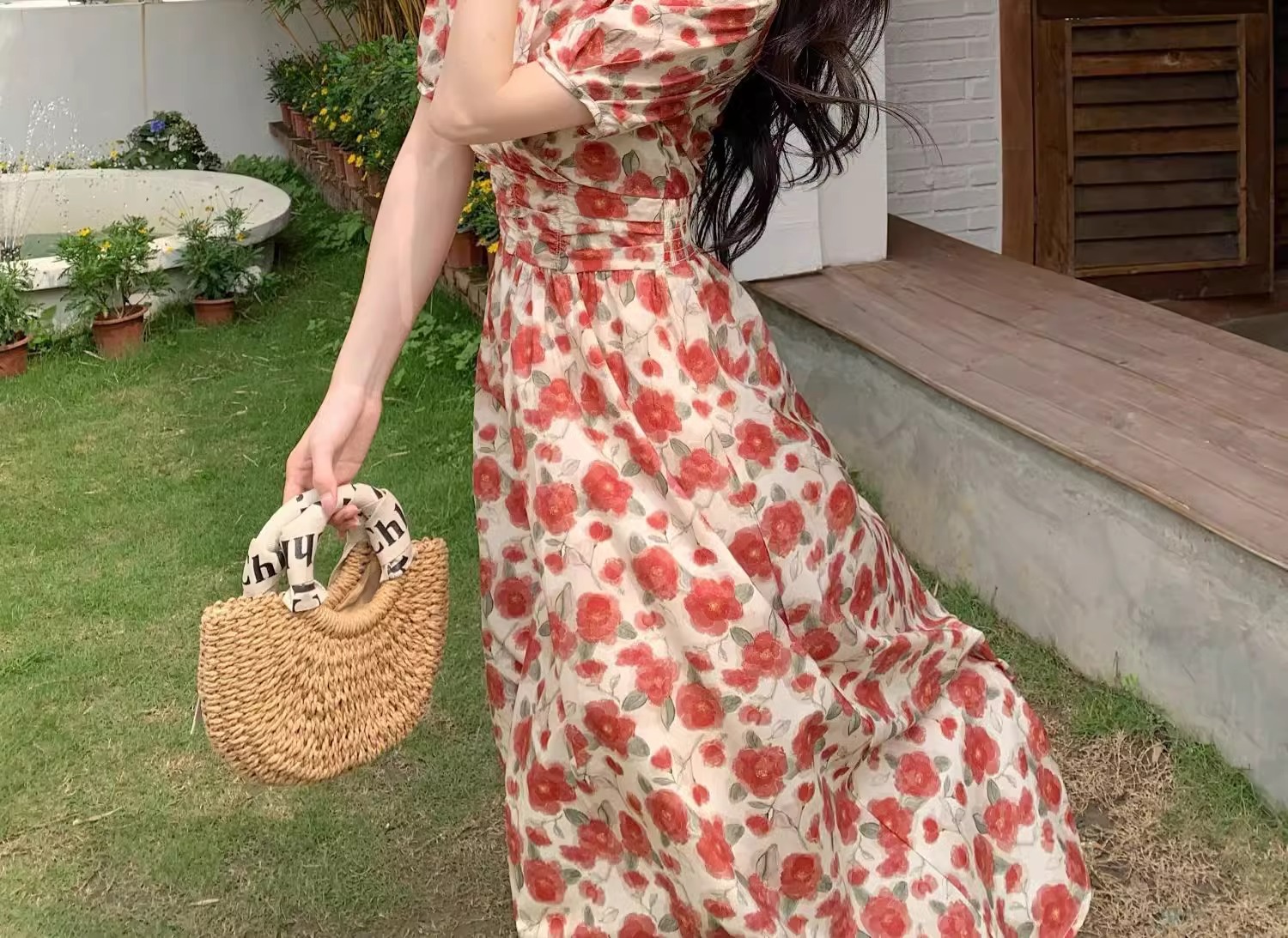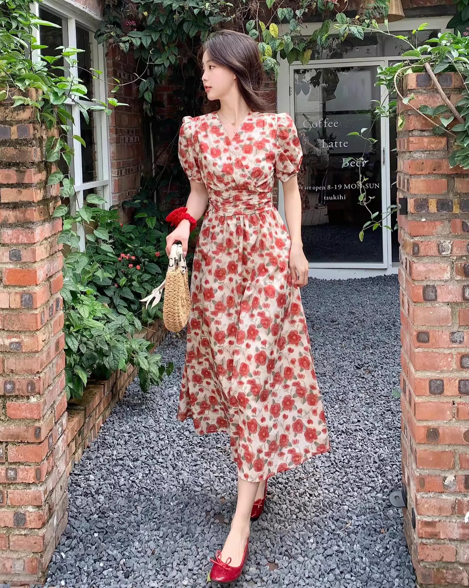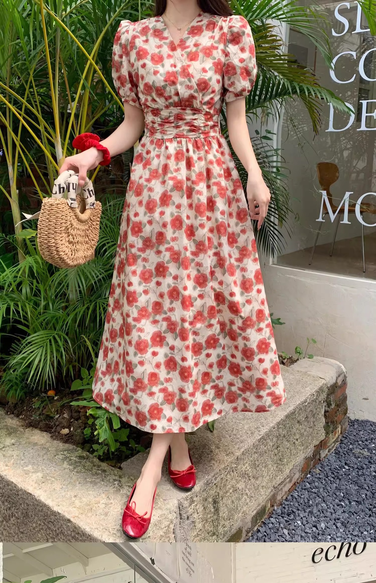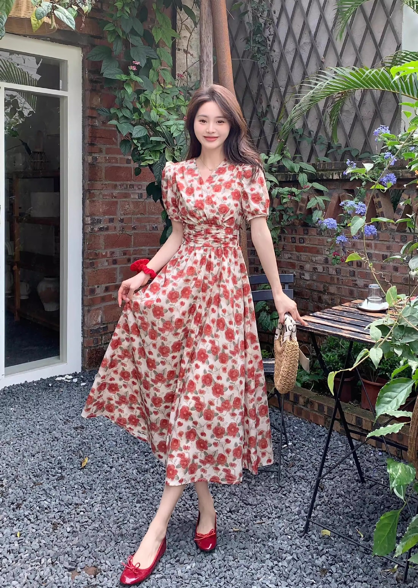 [원래 솜씨] 차 브레이크 우아한 프랑스 허리 V-Neck 원피스 여성 2024 여름 슬림 꽃 원피스