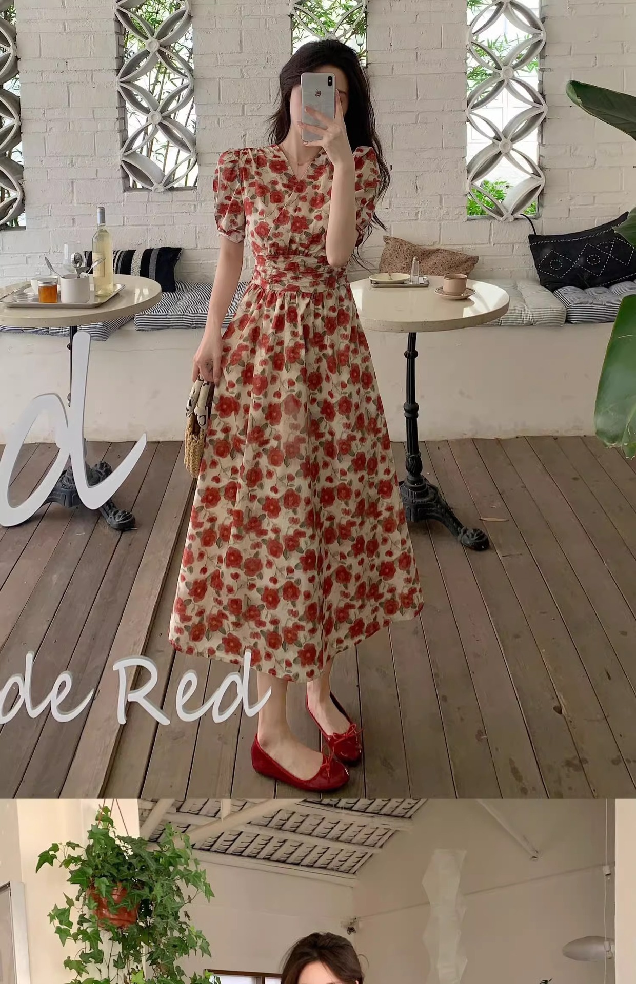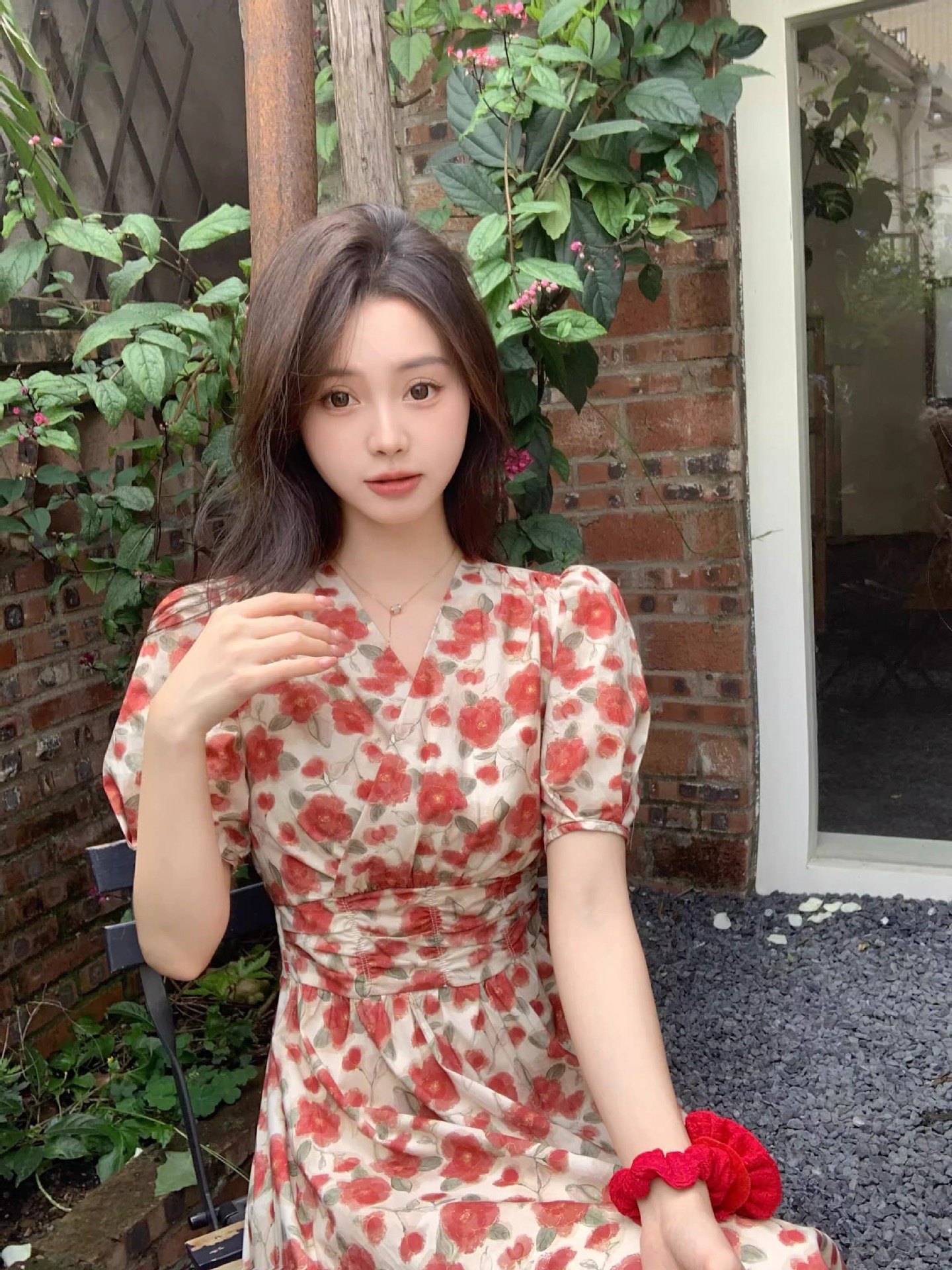 [원래 솜씨] 차 브레이크 우아한 프랑스 허리 V-Neck 원피스 여성 2024 여름 슬림 꽃 원피스스토어 가기