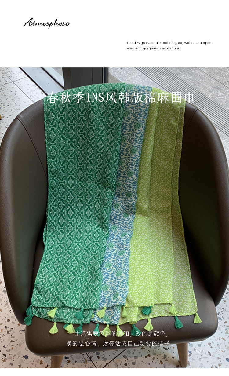 목가적 인 녹색과 노란색 색상 차단 면화 및 리넨 스카프 야외 여행 사진 스카프 실크 스카프 햇빛 선 스크린 목도리 이중 사용스토어 가기