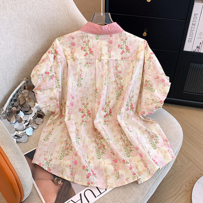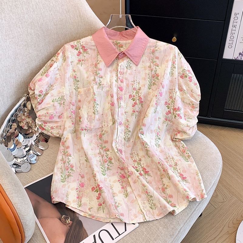 Poio 칼라 버블 슬리브 쉬폰 꽃 셔츠 짧은 소매 최고 여성의 여름 2024 새로운 달콤한 작은 셔츠 봄스토어 가기