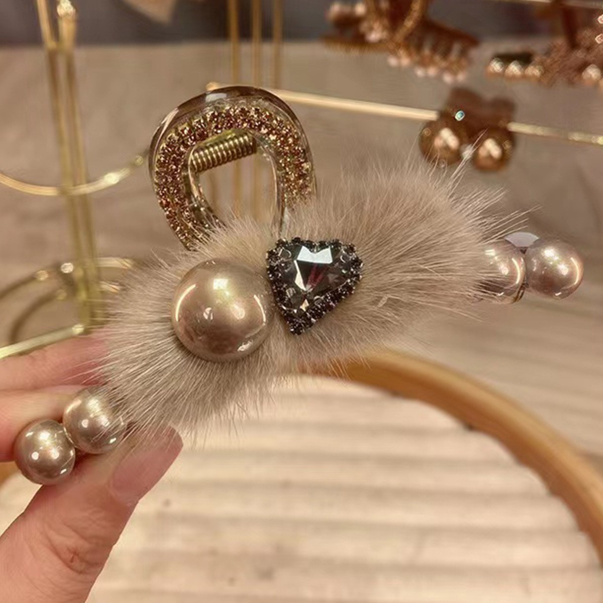 轻奢高级感咖色珍珠水钻抓夹女后脑勺盘发鲨鱼夹大号发夹头饰发卡