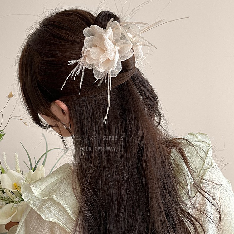 牡丹花羽毛流苏抓夹2024新款发夹后脑勺显发量蓬松高颅顶鲨鱼夹