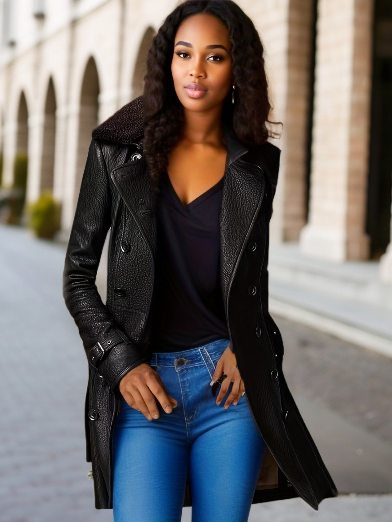 러시아 미녀 블랙 가죽 재킷 러시아 패션 미녀 모피 칼라 가죽 재킷