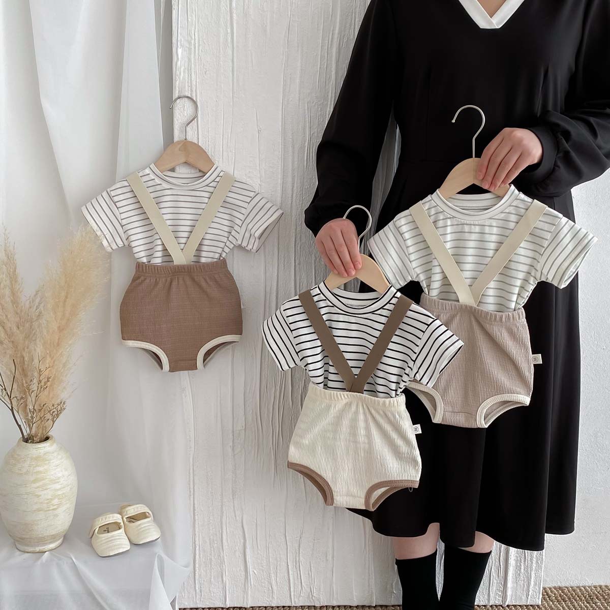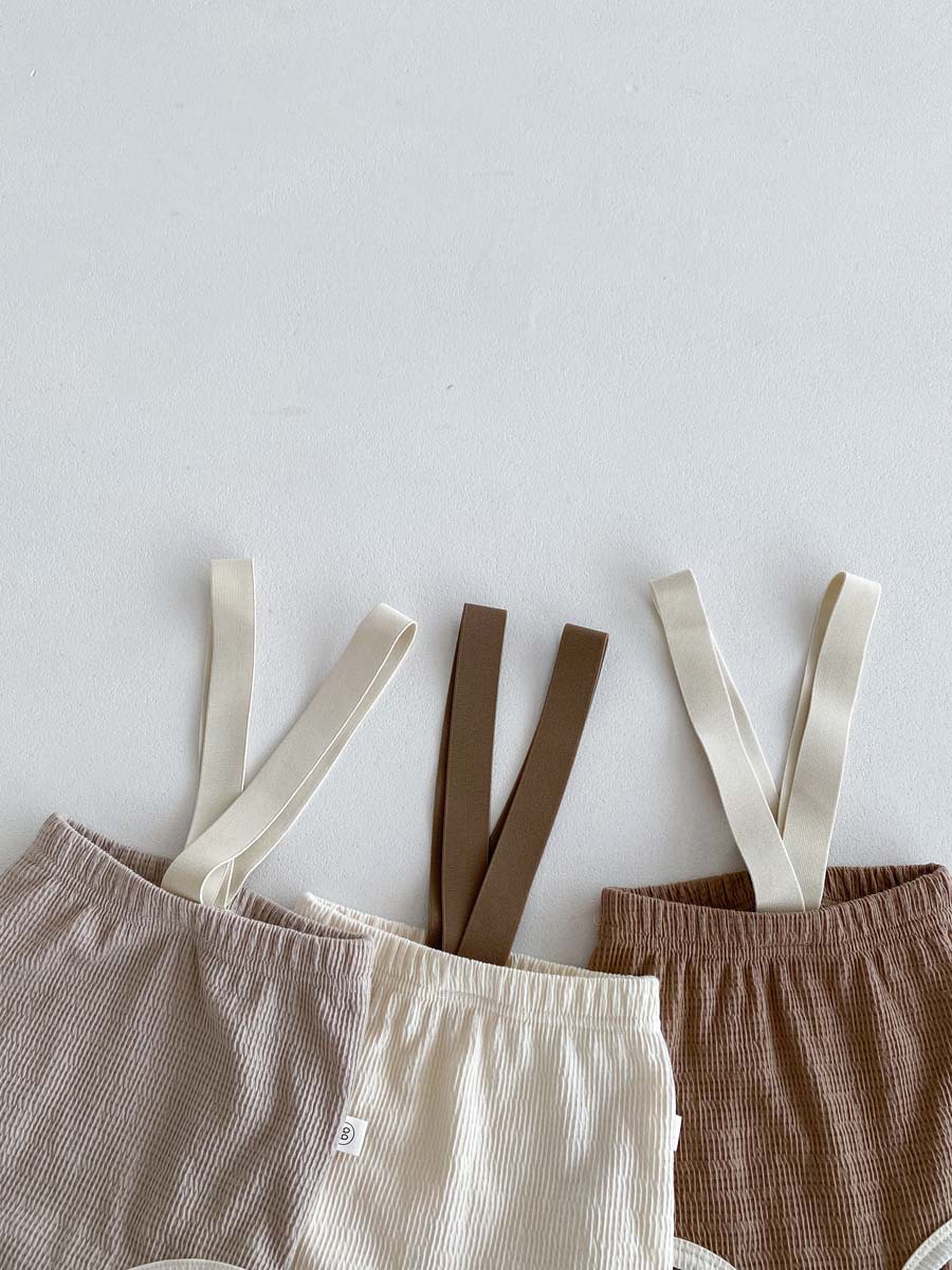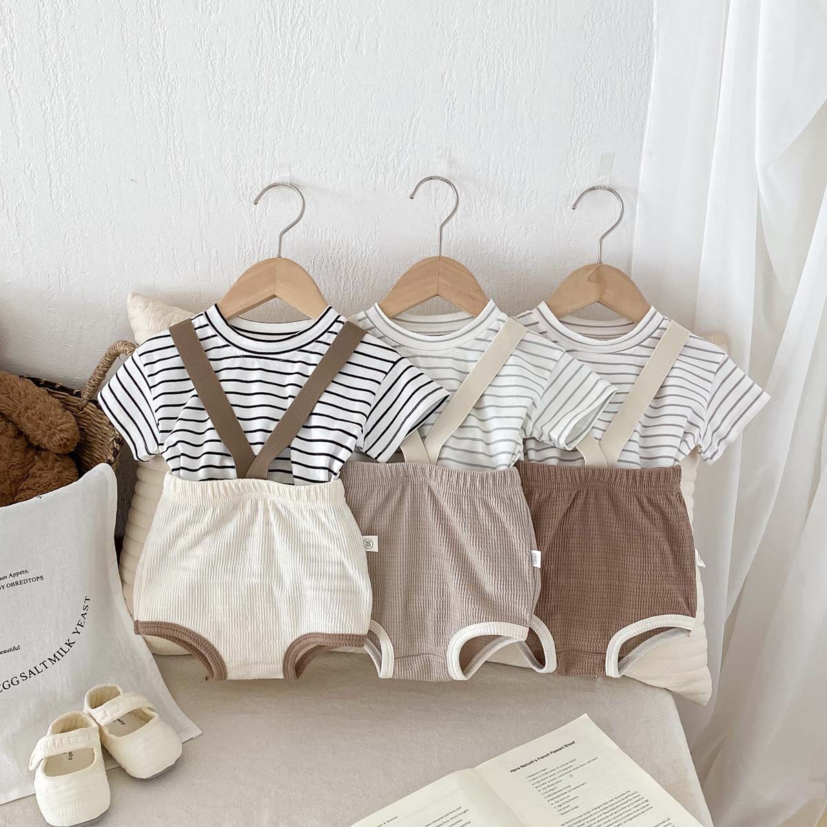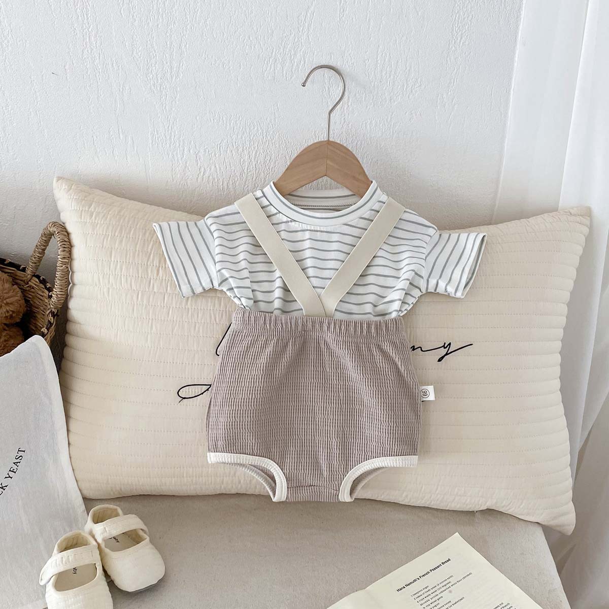 한국식 아기 점프 수트 여름 아기 소년과 소녀 단색 구덩이 면화 멜빵 신생아 가방 크롤링 세트