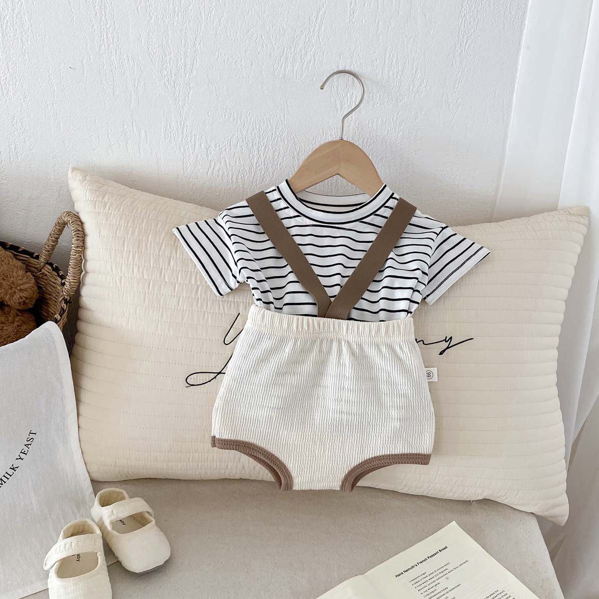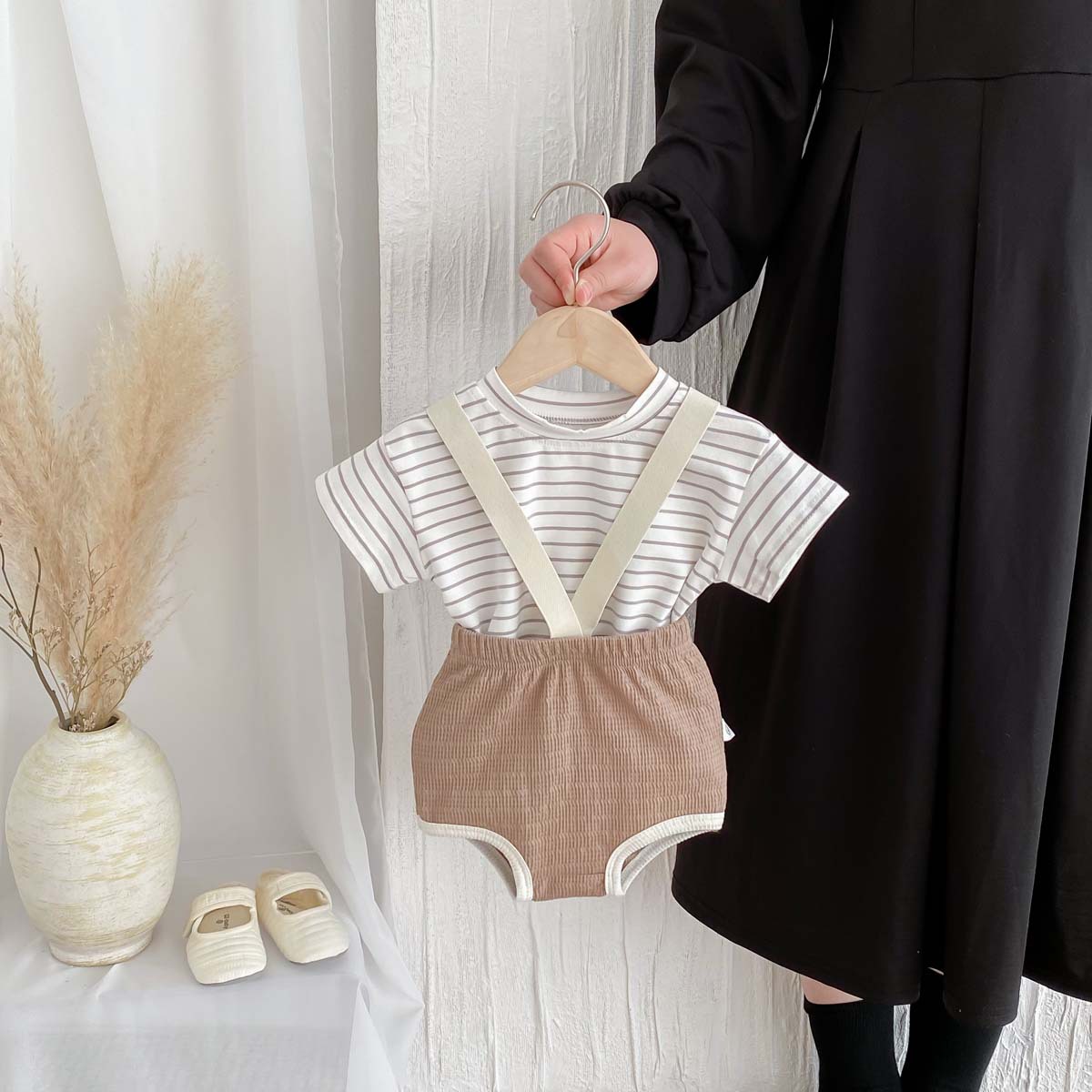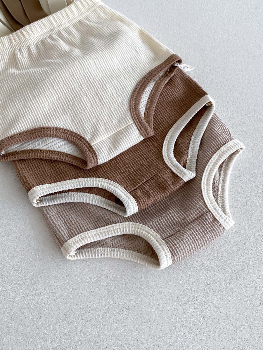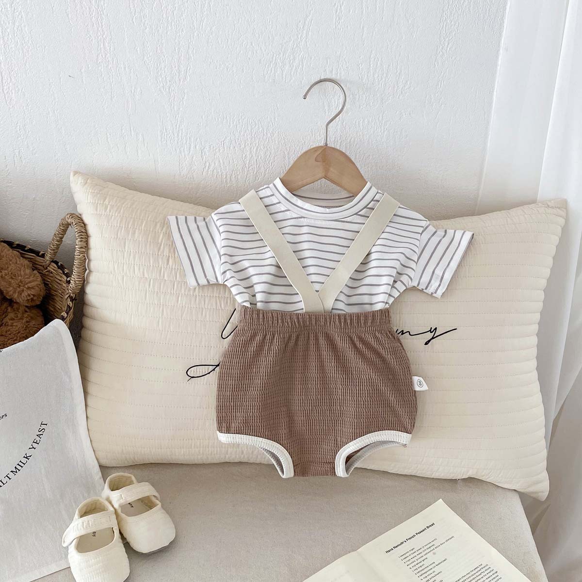 한국식 아기 점프 수트 여름 아기 소년과 소녀 단색 구덩이 면화 멜빵 신생아 가방 크롤링 세트