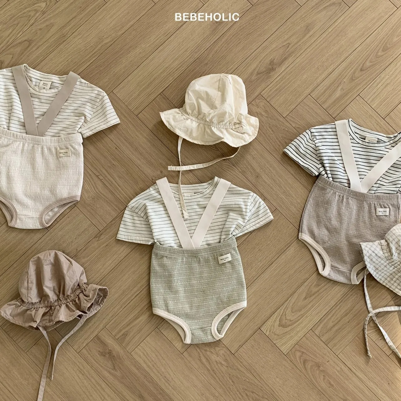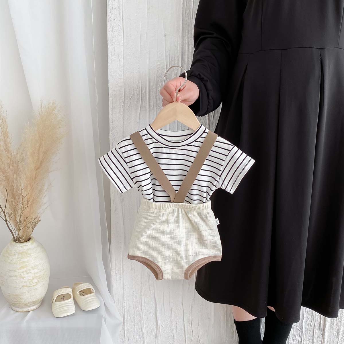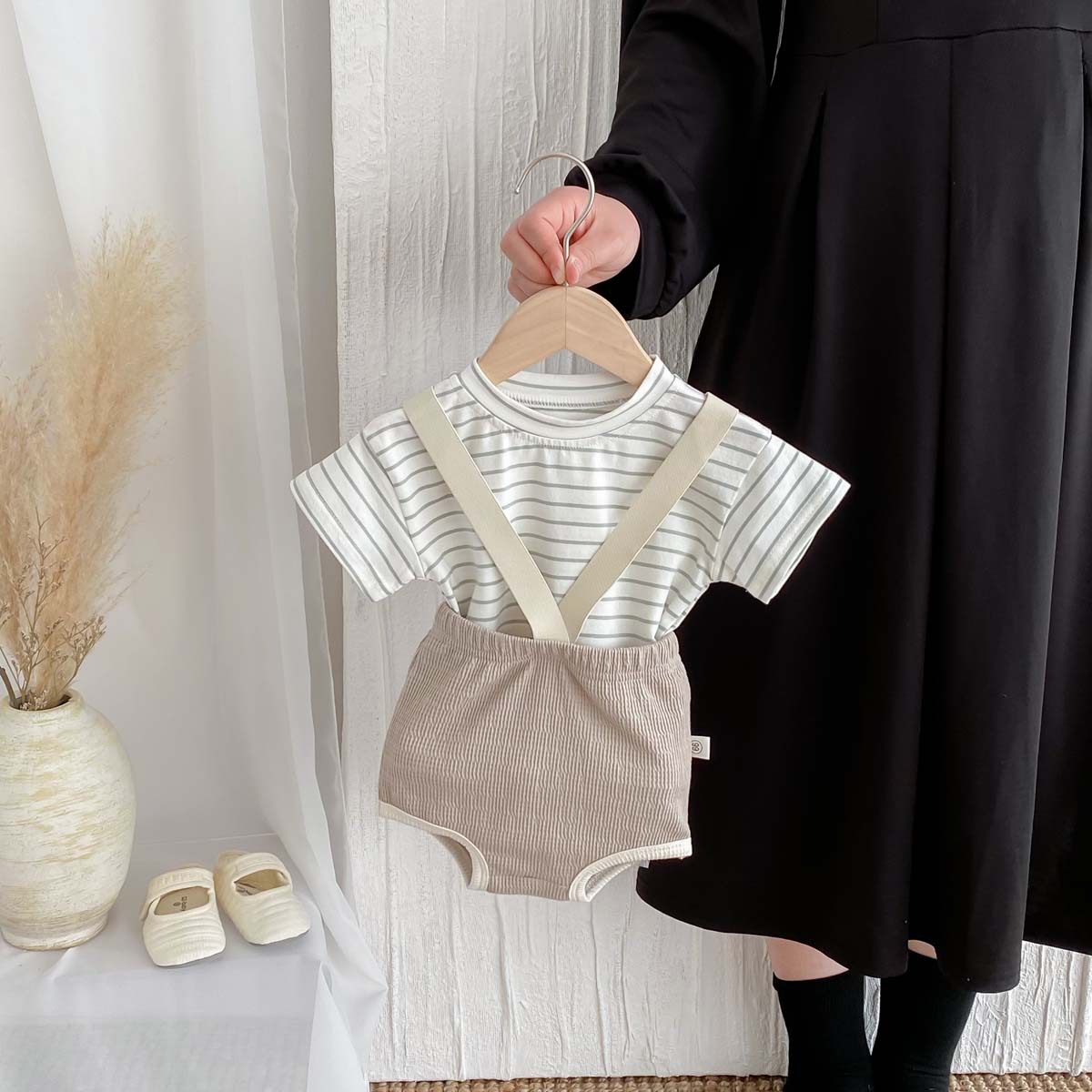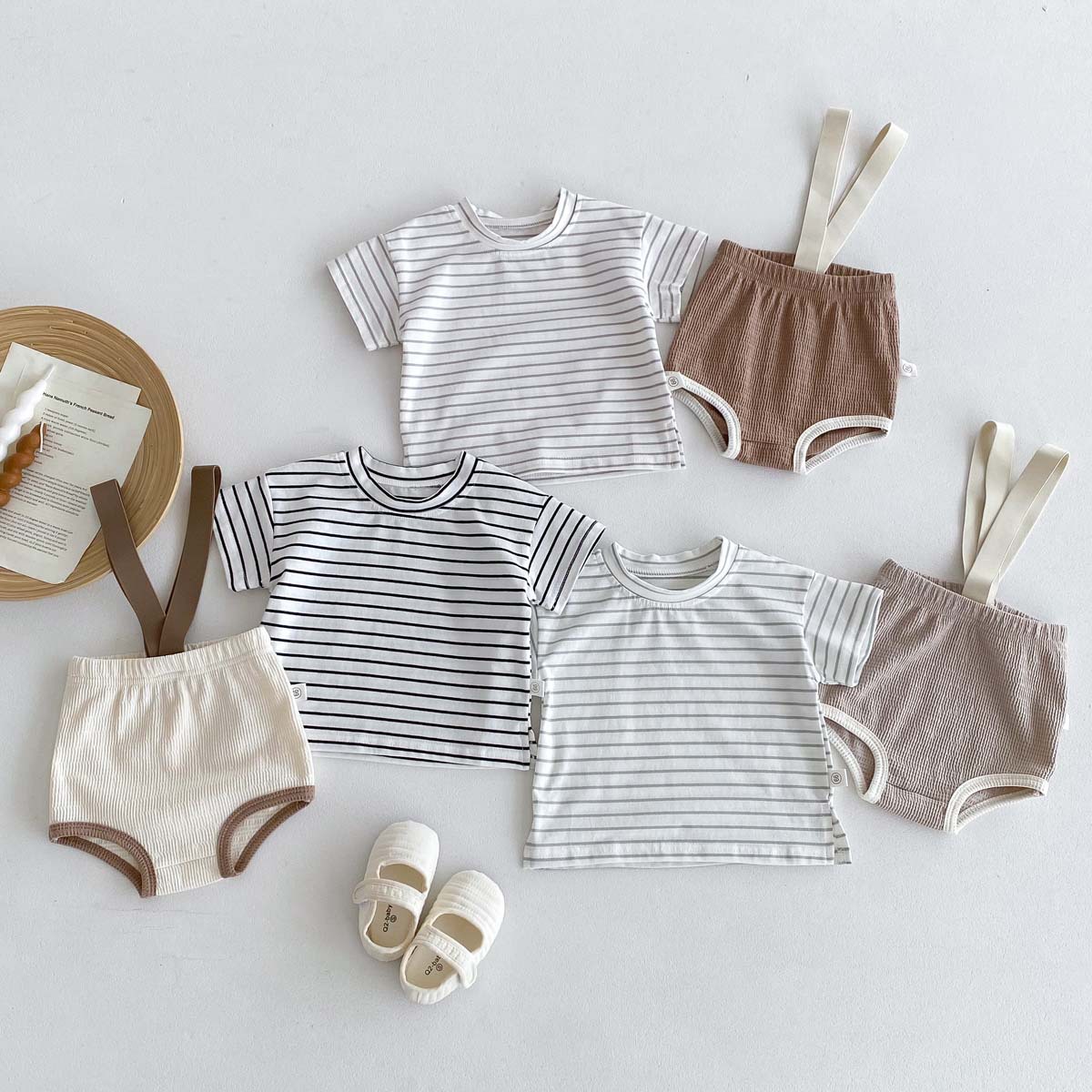 한국식 아기 점프 수트 여름 아기 소년과 소녀 단색 구덩이 면화 멜빵 신생아 가방 크롤링 세트