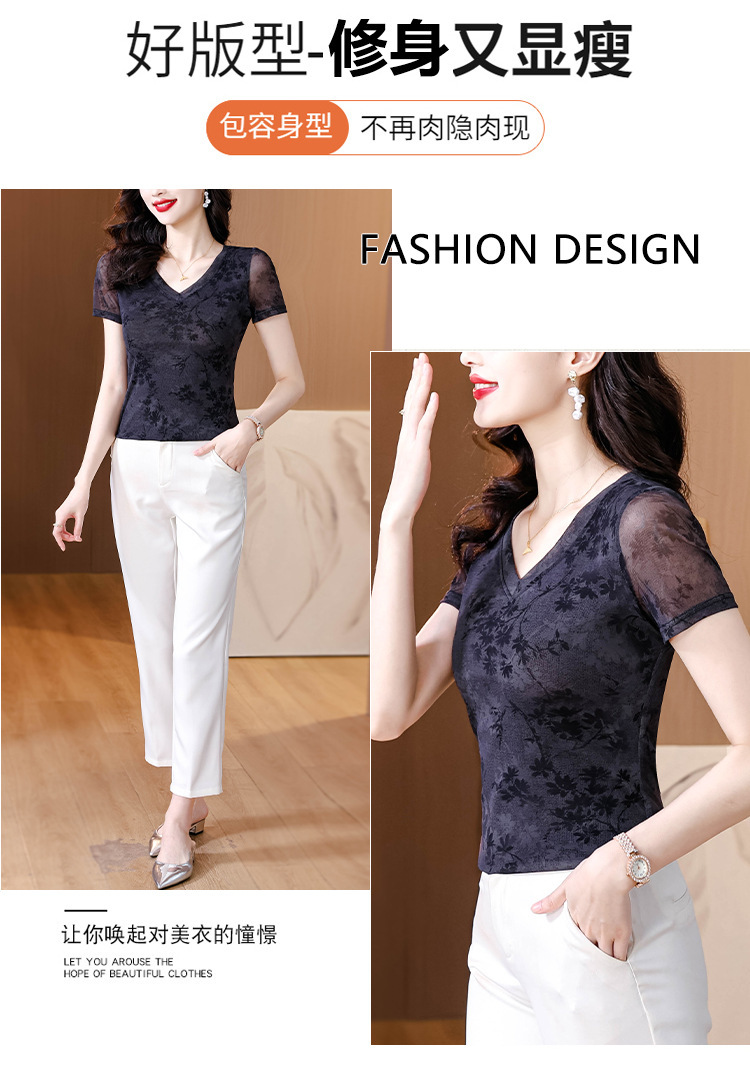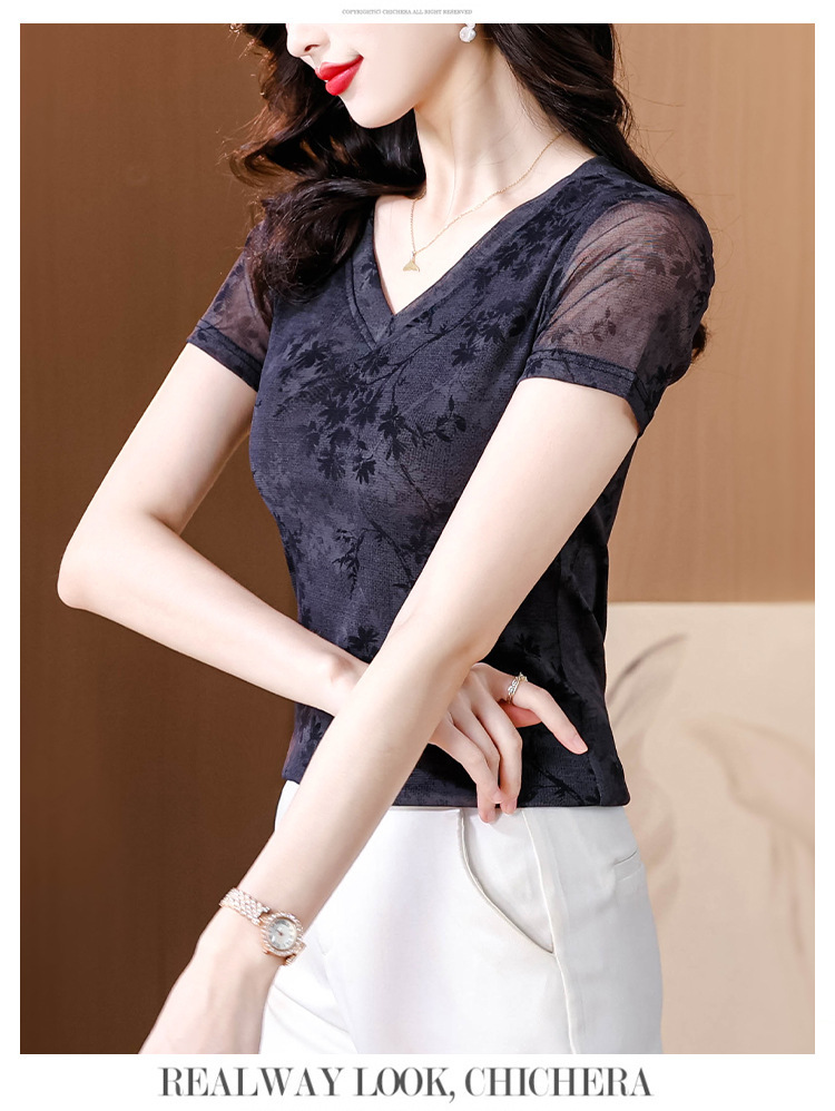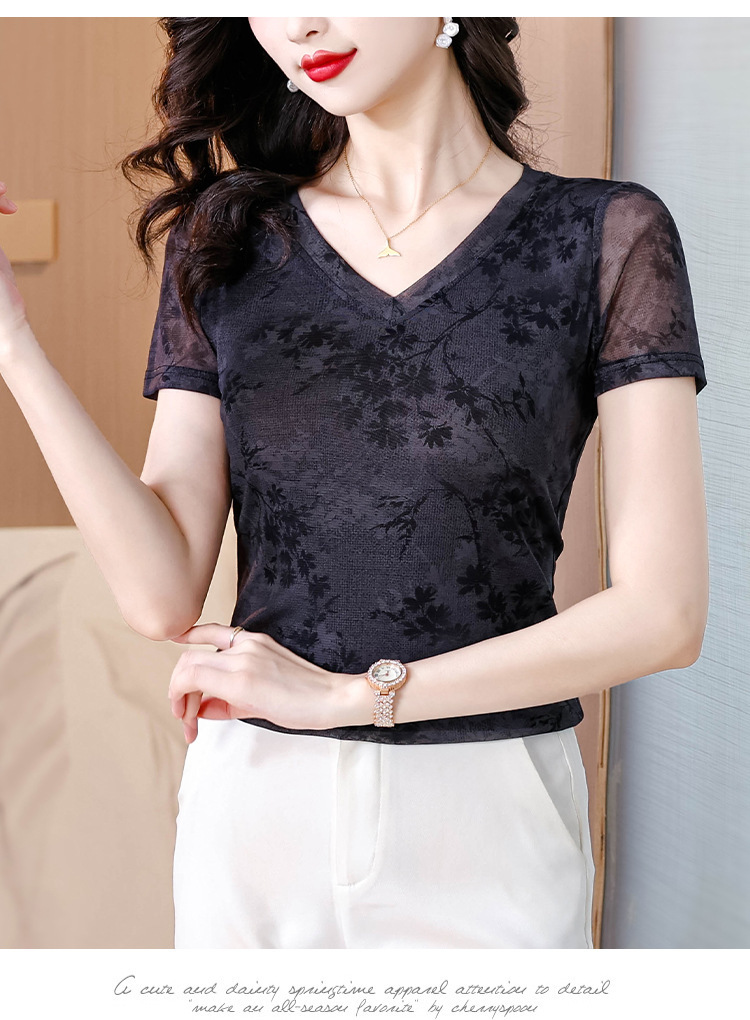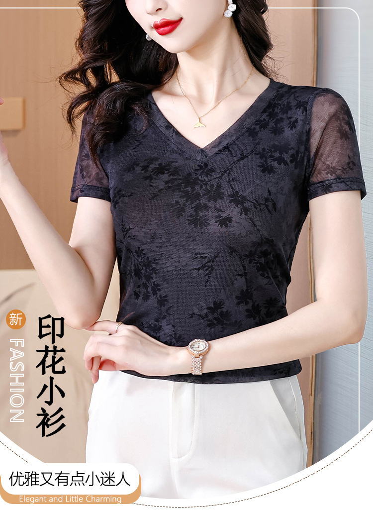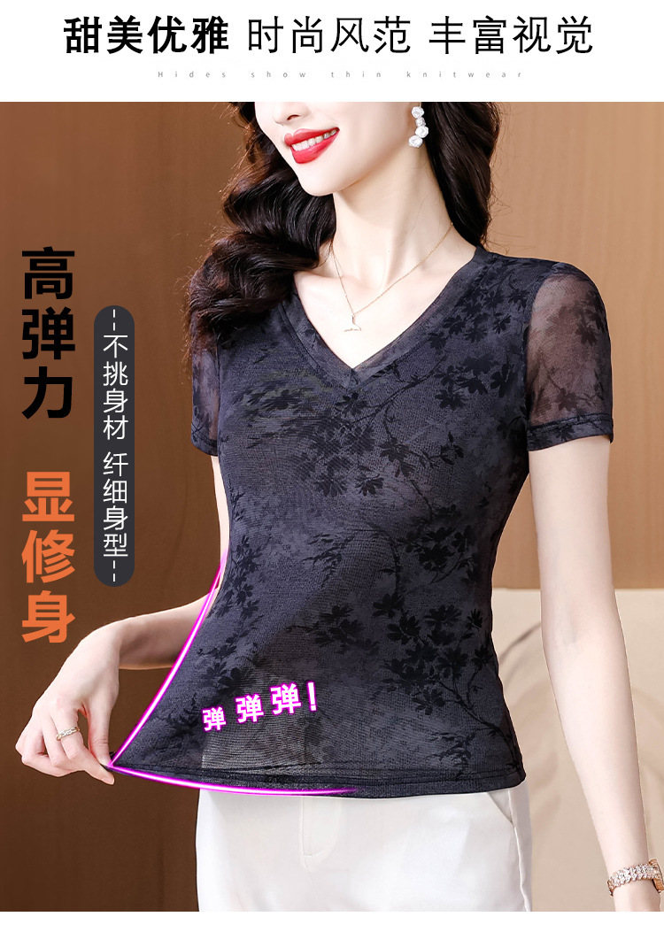 패션 V 넥 반팔 티셔츠 여성 여름 2024 새로운 스타일의 세련된 아름다운 작은 셔츠 서양식 허리 슬리밍 메쉬 탑