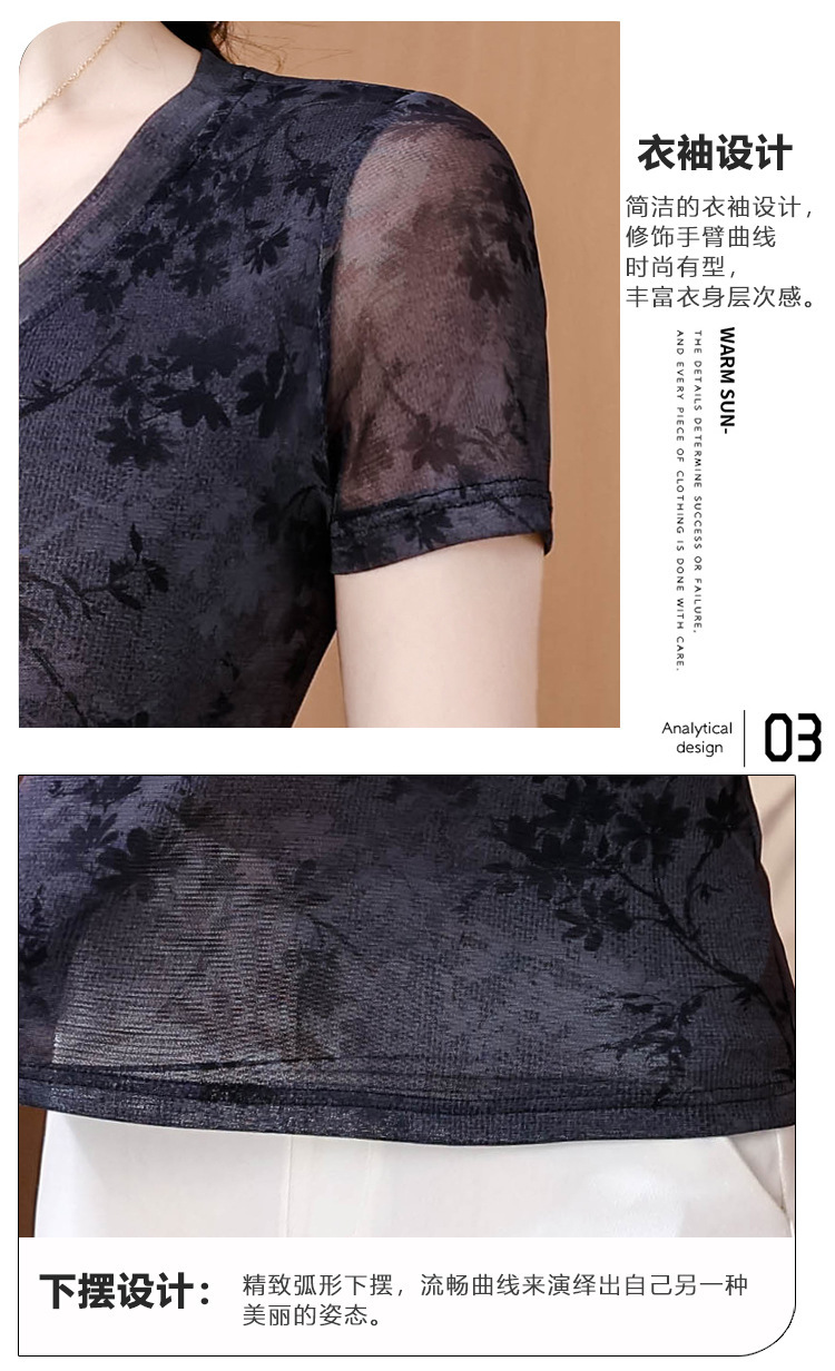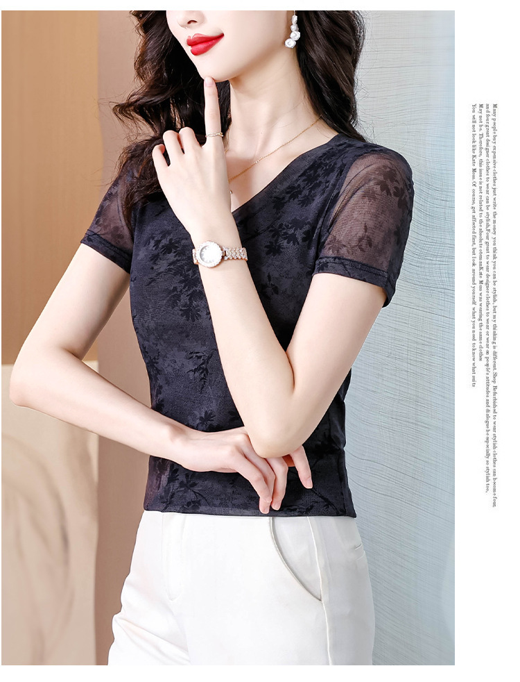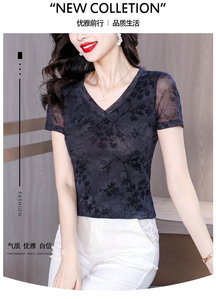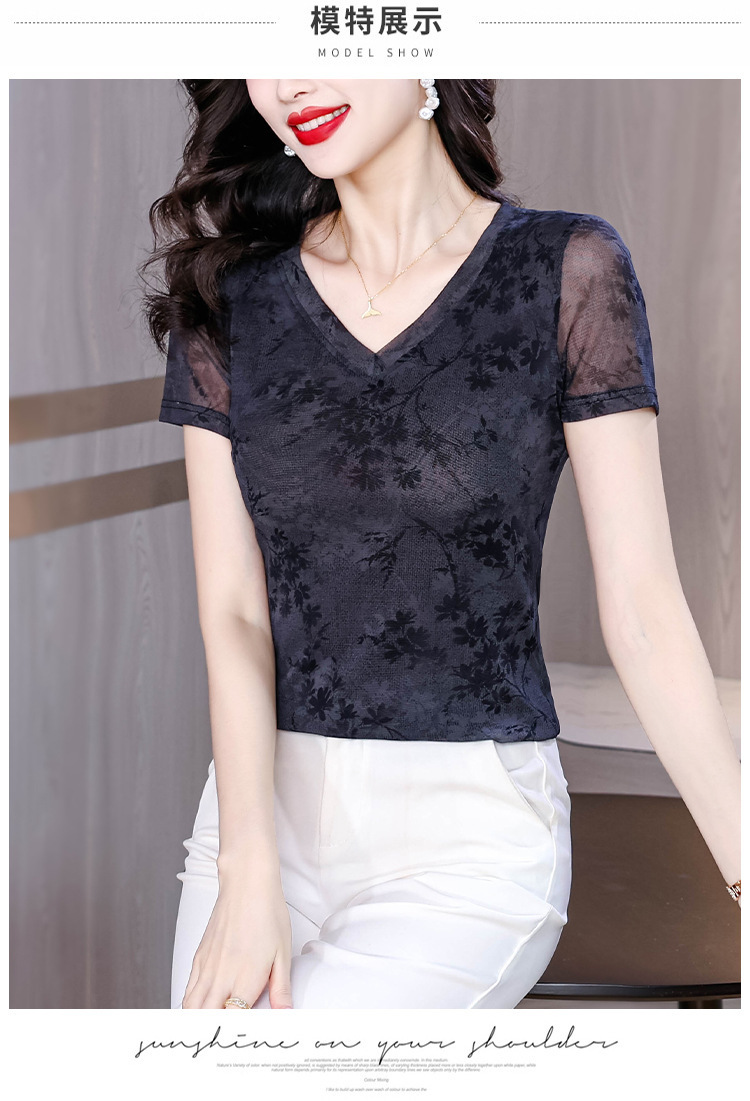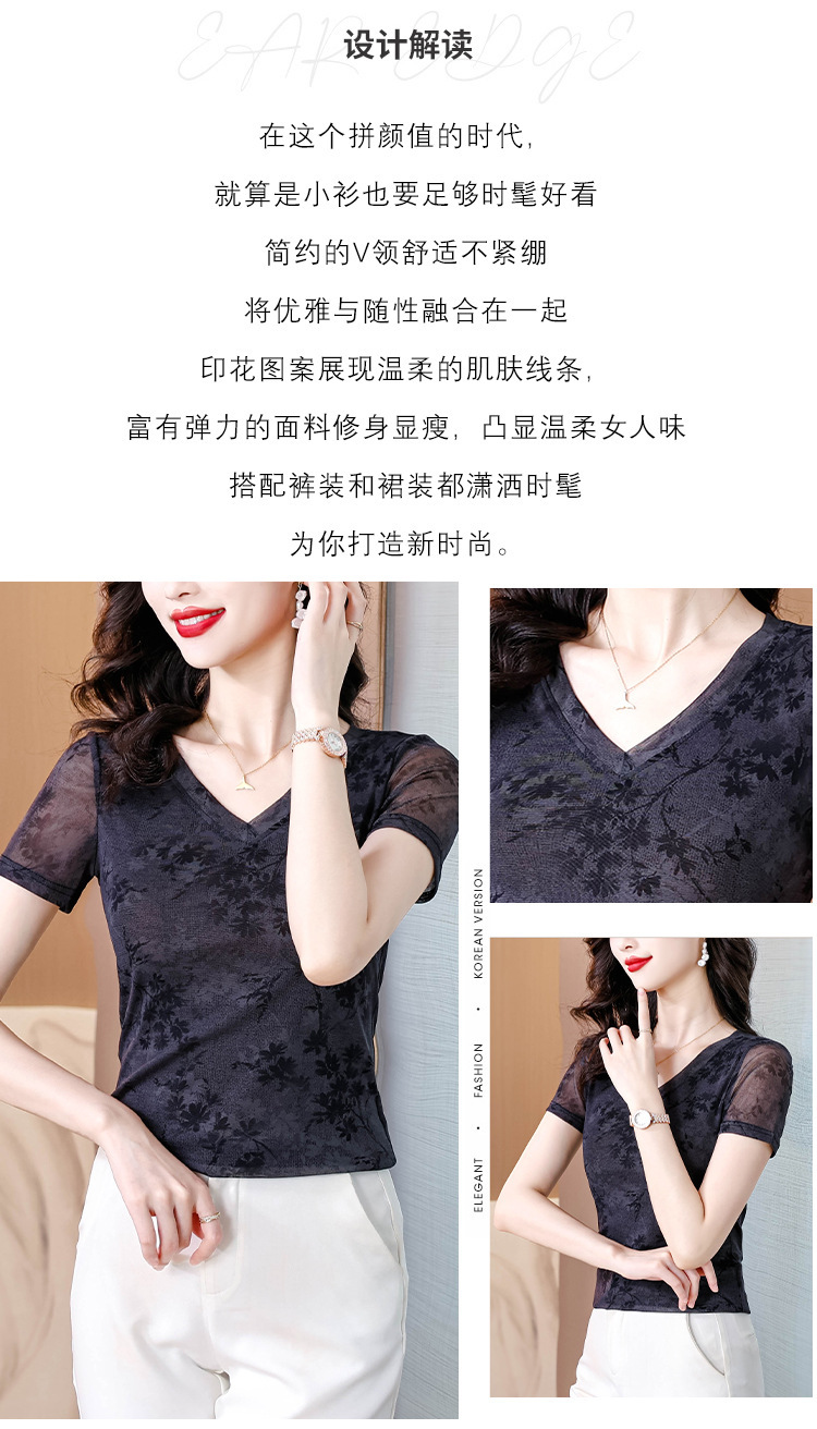 패션 V 넥 반팔 티셔츠 여성 여름 2024 새로운 스타일의 세련된 아름다운 작은 셔츠 서양식 허리 슬리밍 메쉬 탑