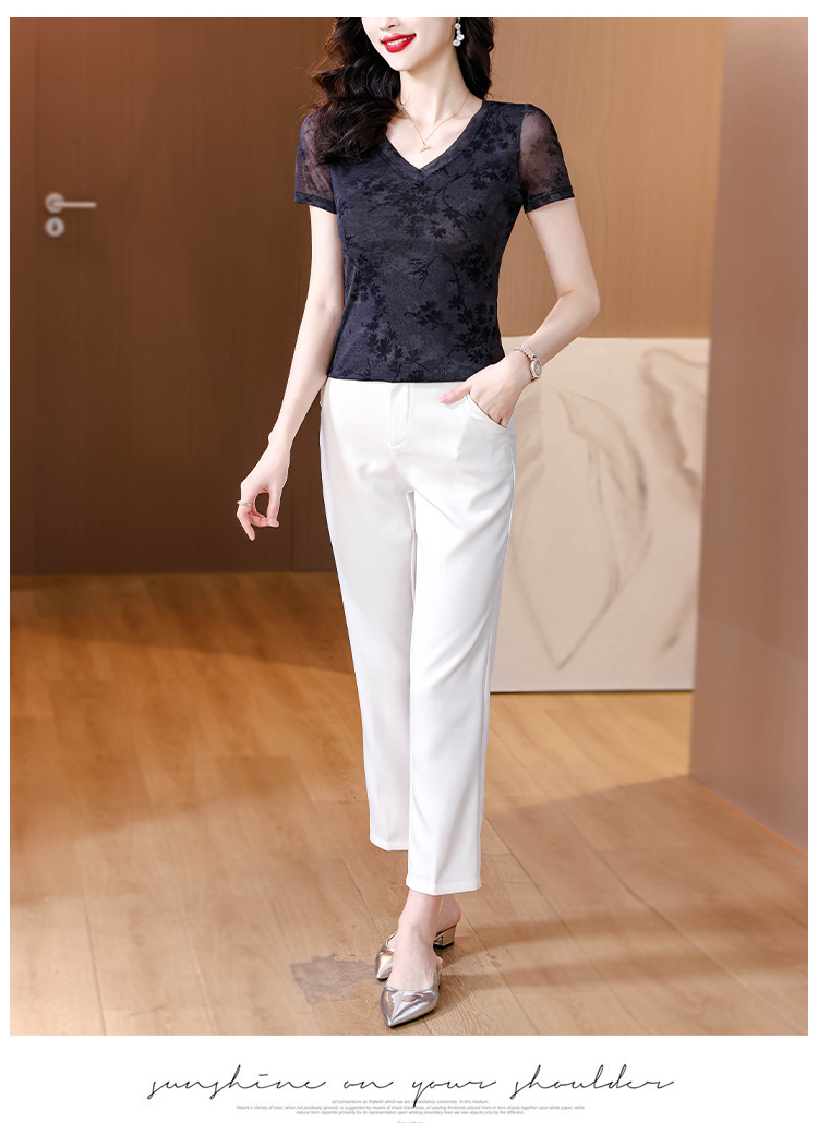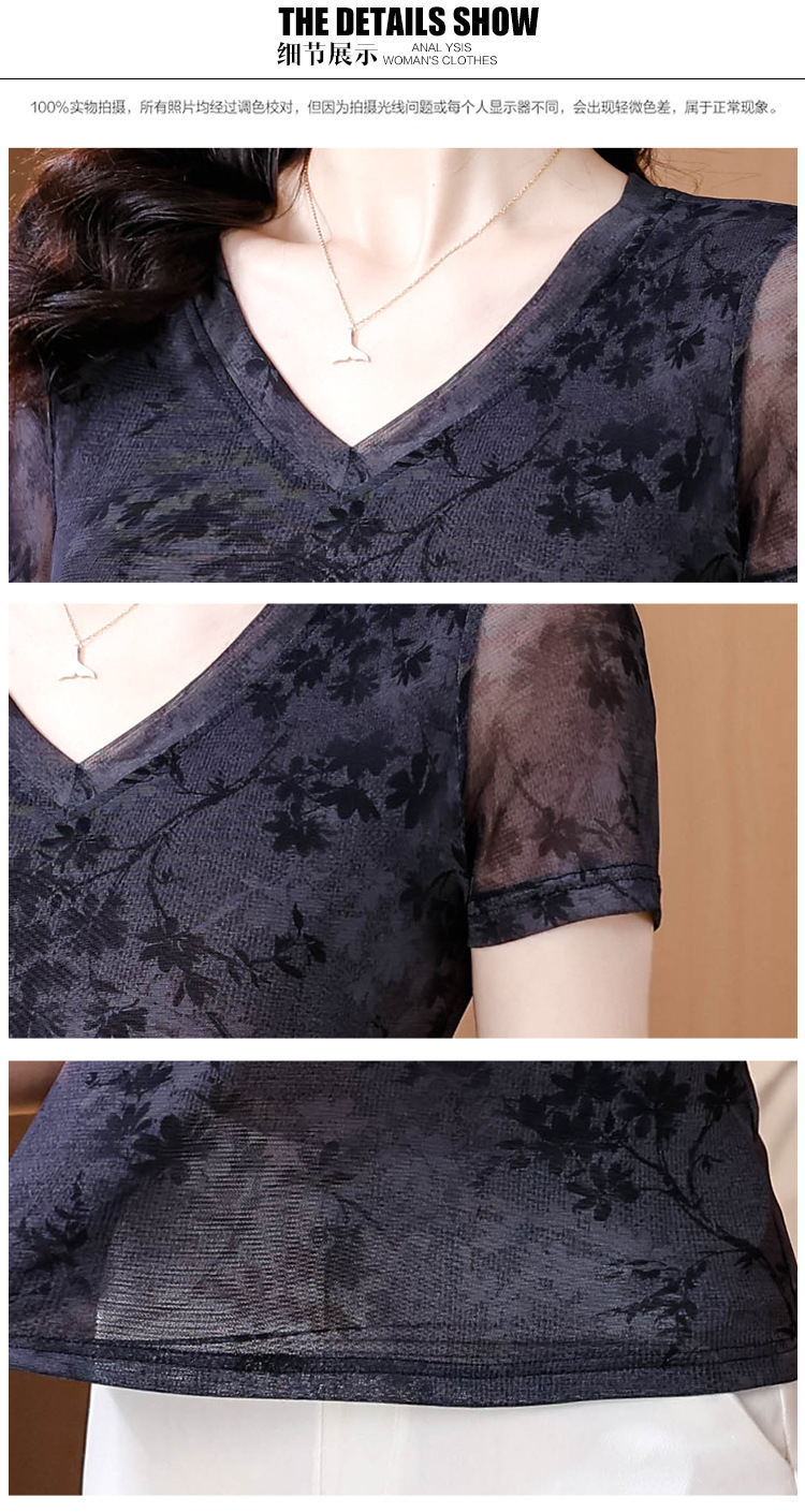 패션 V 넥 반팔 티셔츠 여성 여름 2024 새로운 스타일의 세련된 아름다운 작은 셔츠 서양식 허리 슬리밍 메쉬 탑스토어 가기