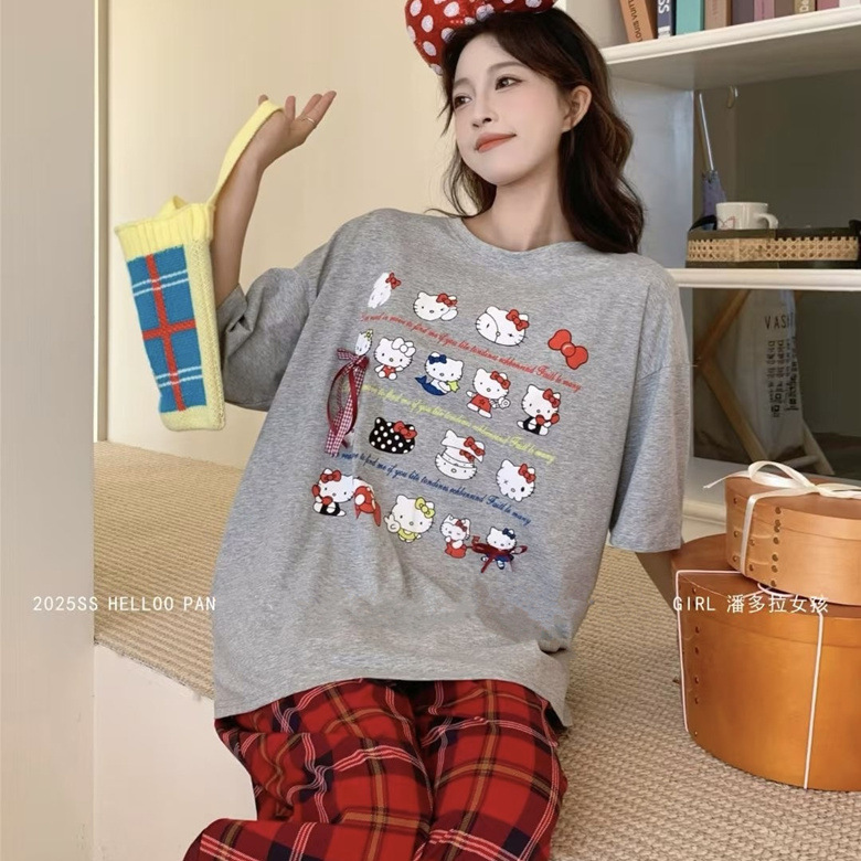 • 쇼트 롱 라이트 그레이 멀티 KT 캣 레드 체크 팬츠