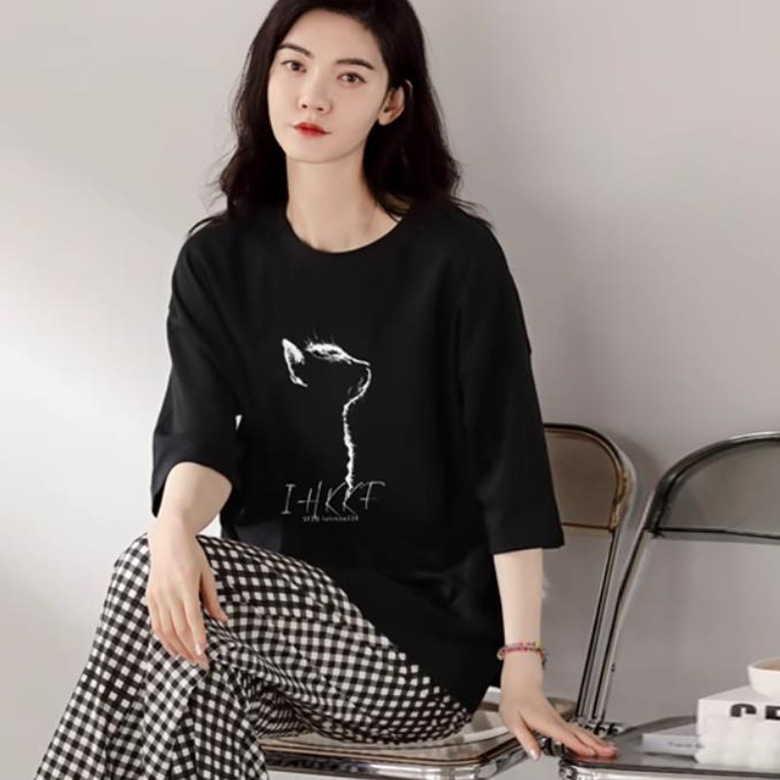• 짧고 긴 검은 고양이 흰색 그림자 얇은 체크 무늬 스트레이트 팬츠