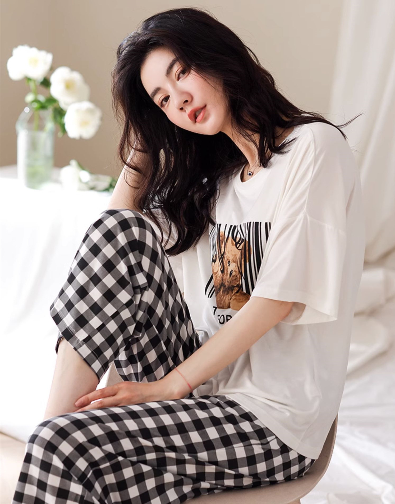 • 짧고 긴 흰색 바코드 곰 체크 무늬 바지