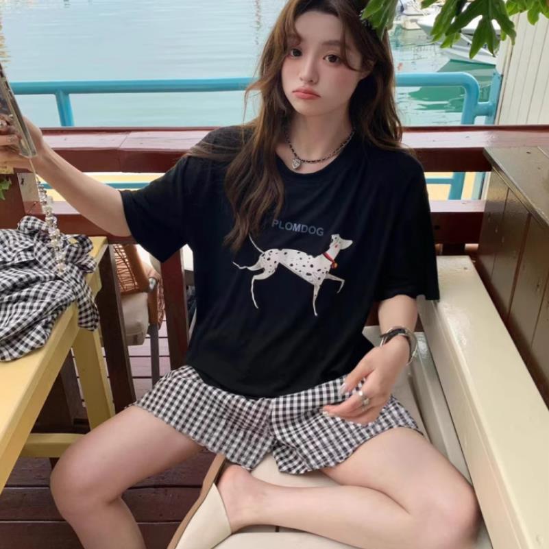 • 검은 점박이 얇은 개 얇은 격자 무늬 바지 더블 쇼트