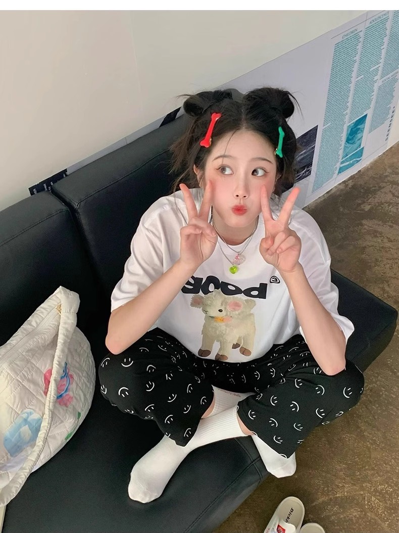 • 짧고 긴 흰색 양고기 검은 웃는 얼굴 바지