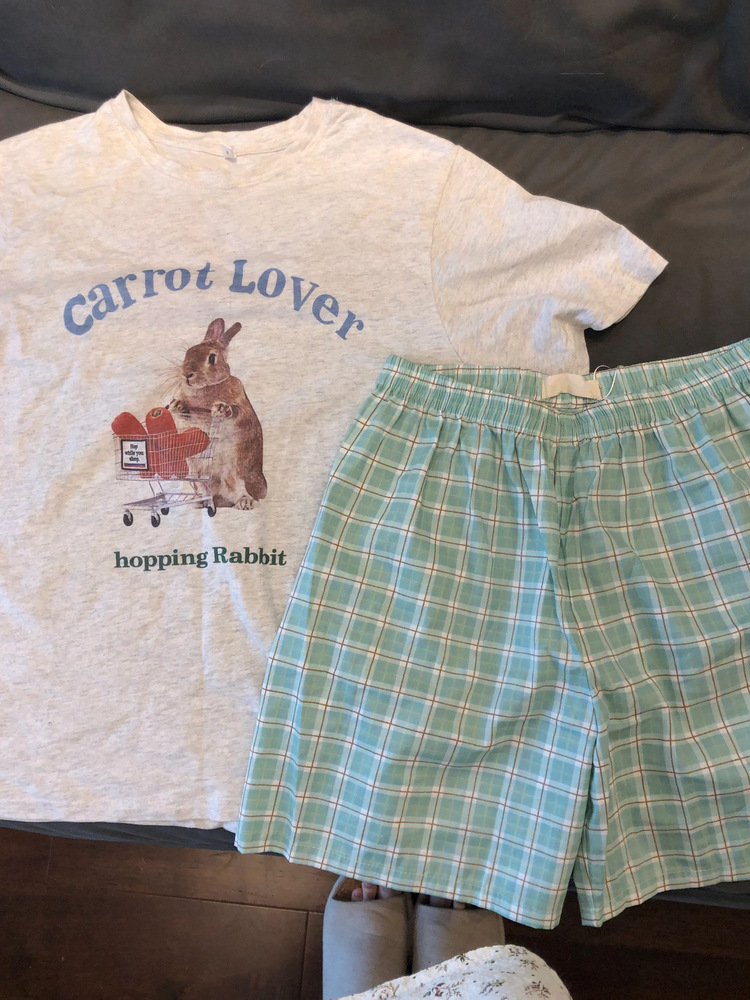• 회색 트롤리 토끼 녹차 체크 바지 더블 쇼트
