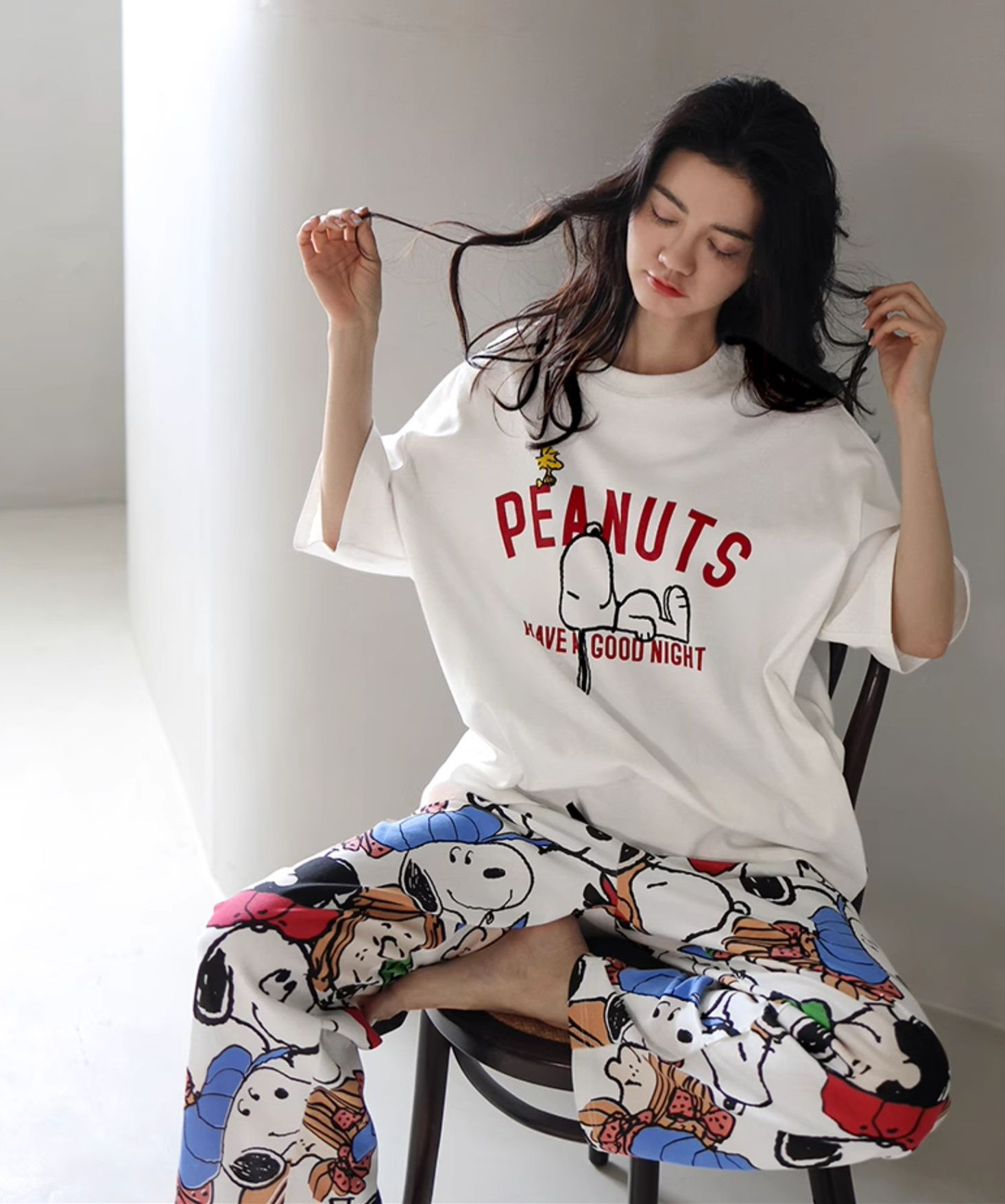 • 다크 그레이 흰색 연필 라인 스누피 노란색 바지 짧은 긴