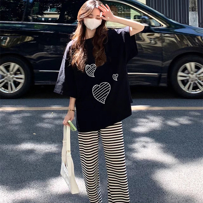 • 짧고 긴 검정색 3개 흰색 하트 흰색 줄무늬 바지