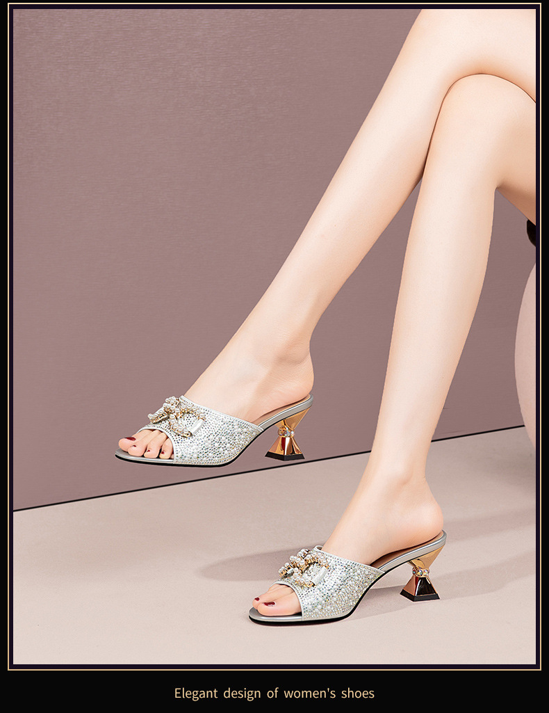 여름 여성의 두꺼운 하이힐 우아한 한 단어 라인 스톤 캐주얼 패션 패션 여성 신발 황금 실버