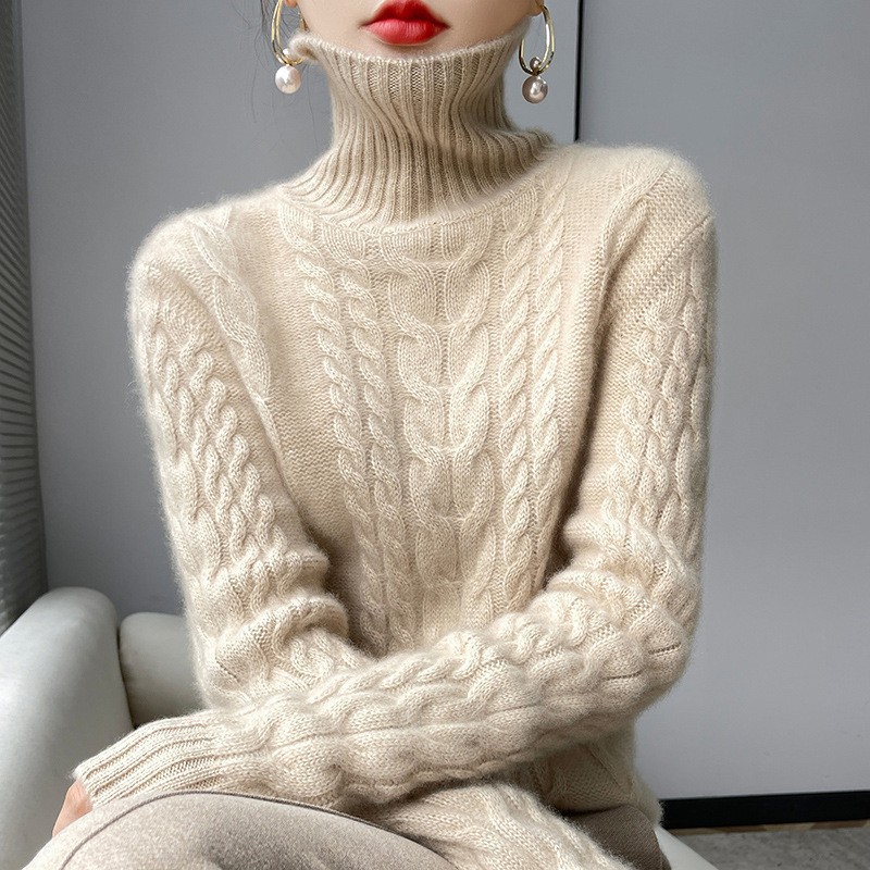 2024 가을과 겨울 새로운 단색 두꺼운 트위스트 하이 칼라베이스 스웨터 여자 느슨한 올 매치 한국 니트 스웨터