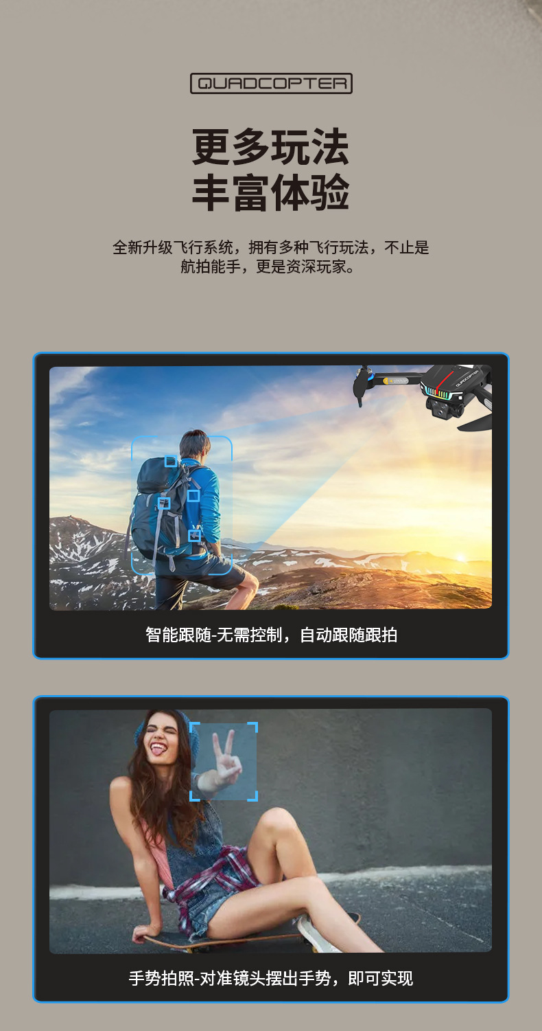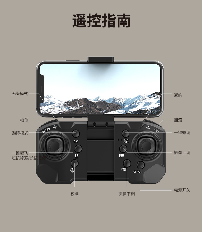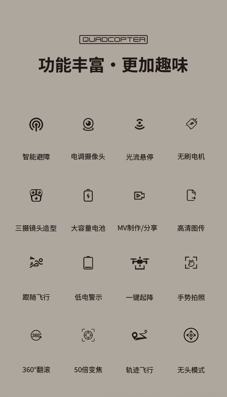基本功能:定高功能,飞机可折叠,六通陀螺仪,一键起飞,一键降落,一键返航,一键复位,微调功能,前进后退,左右侧飞,左右转向,无头模式,360°翻滚,APP操控,360°翻滚,手势拍照,录像,急停,轨迹飞行,重力感应,MV制作,添加音乐,美颜功能