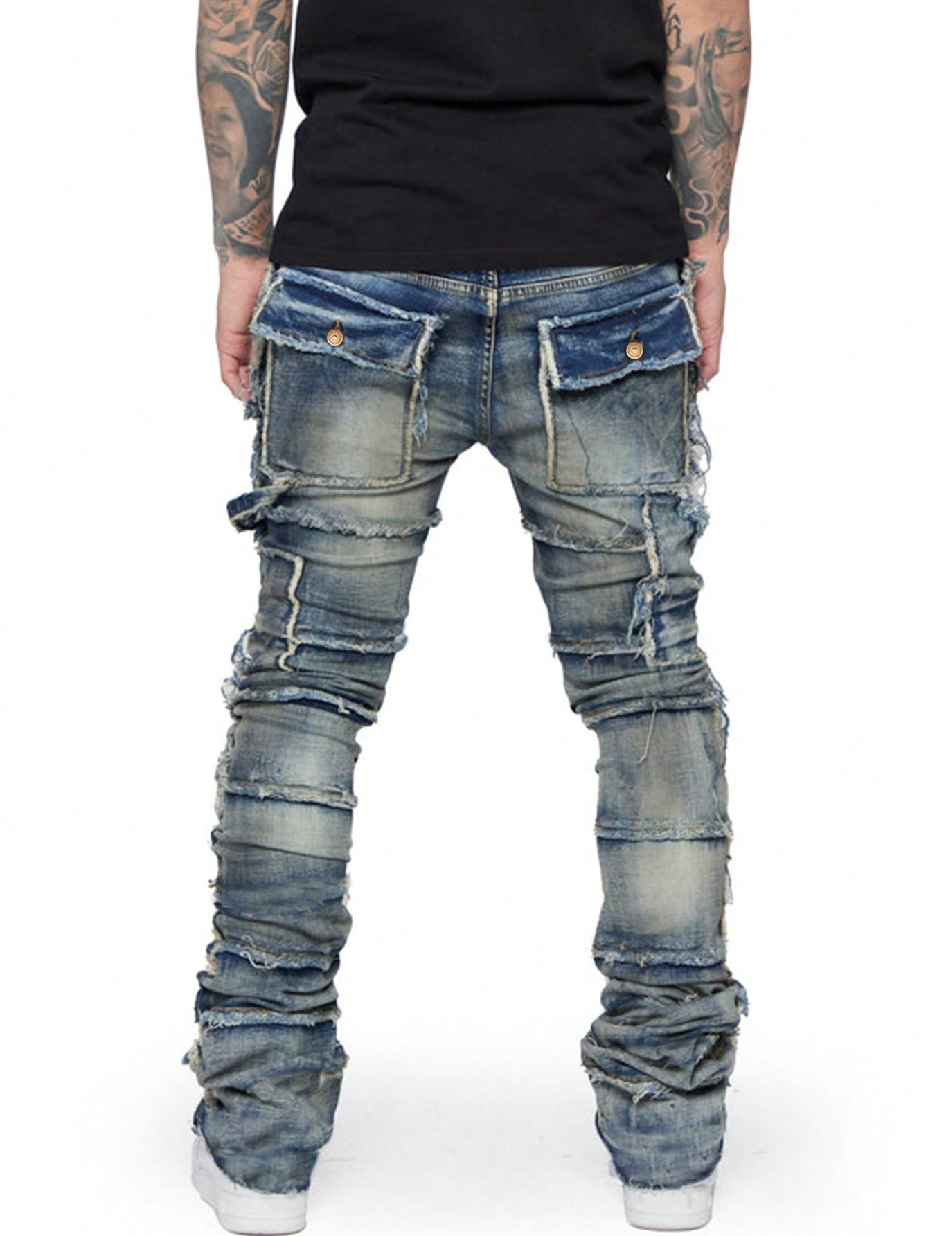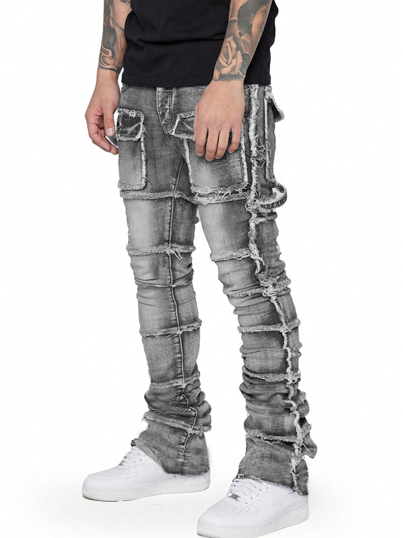 남성 데님 툴링 스트레이트 다리 바지 유럽과 미국의 패션 Ins 폭발성 스트레치 데님 라미네이팅 남성 바지