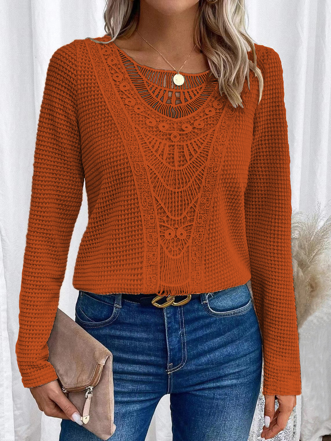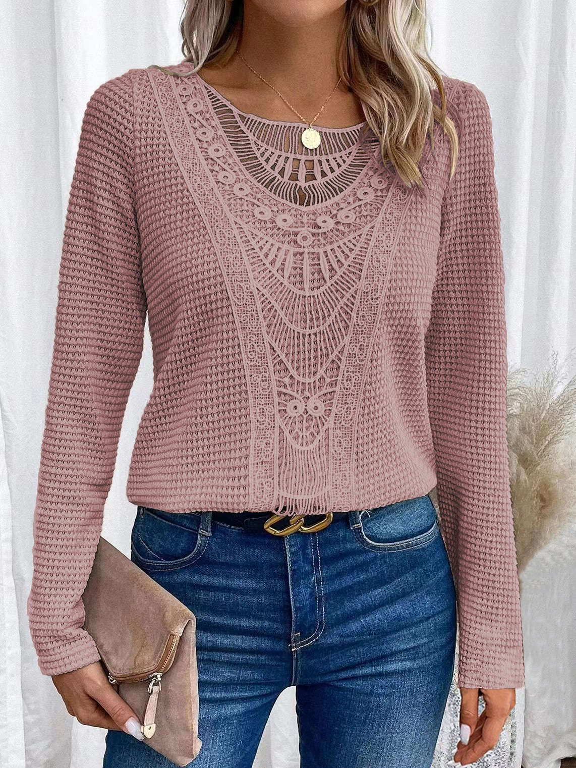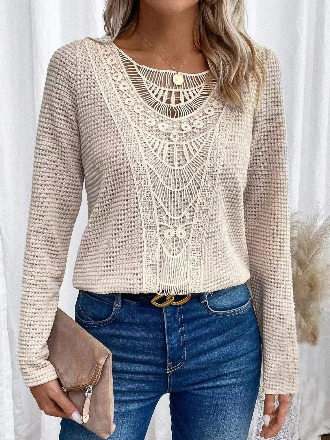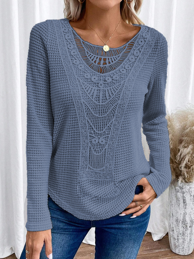 2024 국경을 넘는 유럽과 미국 가을과 겨울 새로운 아마존 레이스 스티칭 파인애플 긴팔 티셔츠 최고 여성 국경