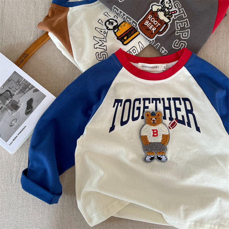 어린이 티셔츠 2024 squinting 가을 새 소년과 소녀 수건 자수 긴 소매 T 아기 만화 스티칭 티셔츠스토어 가기