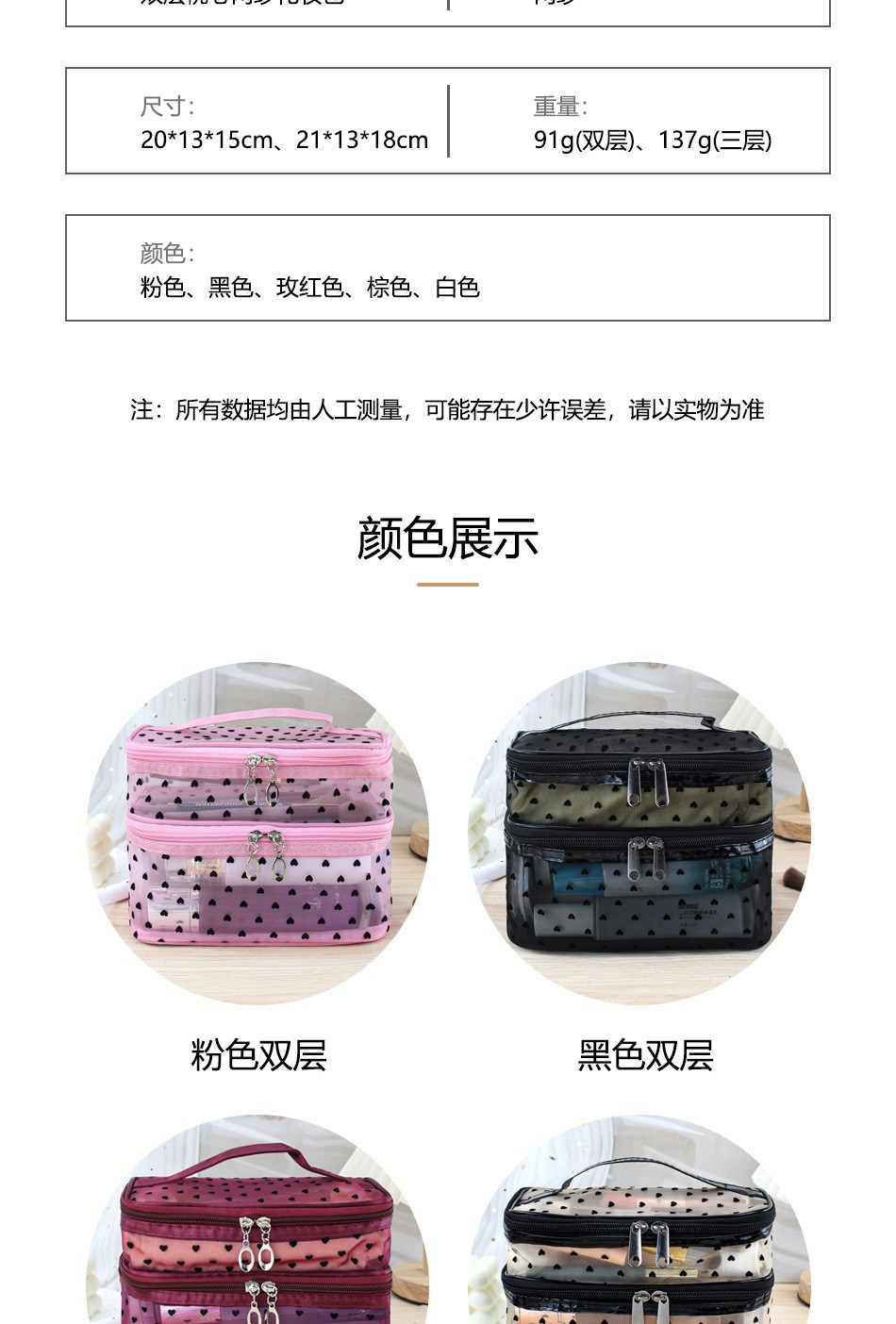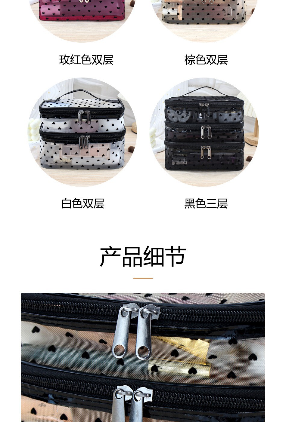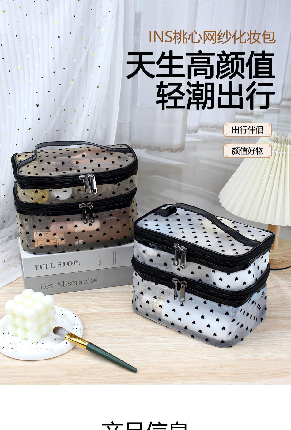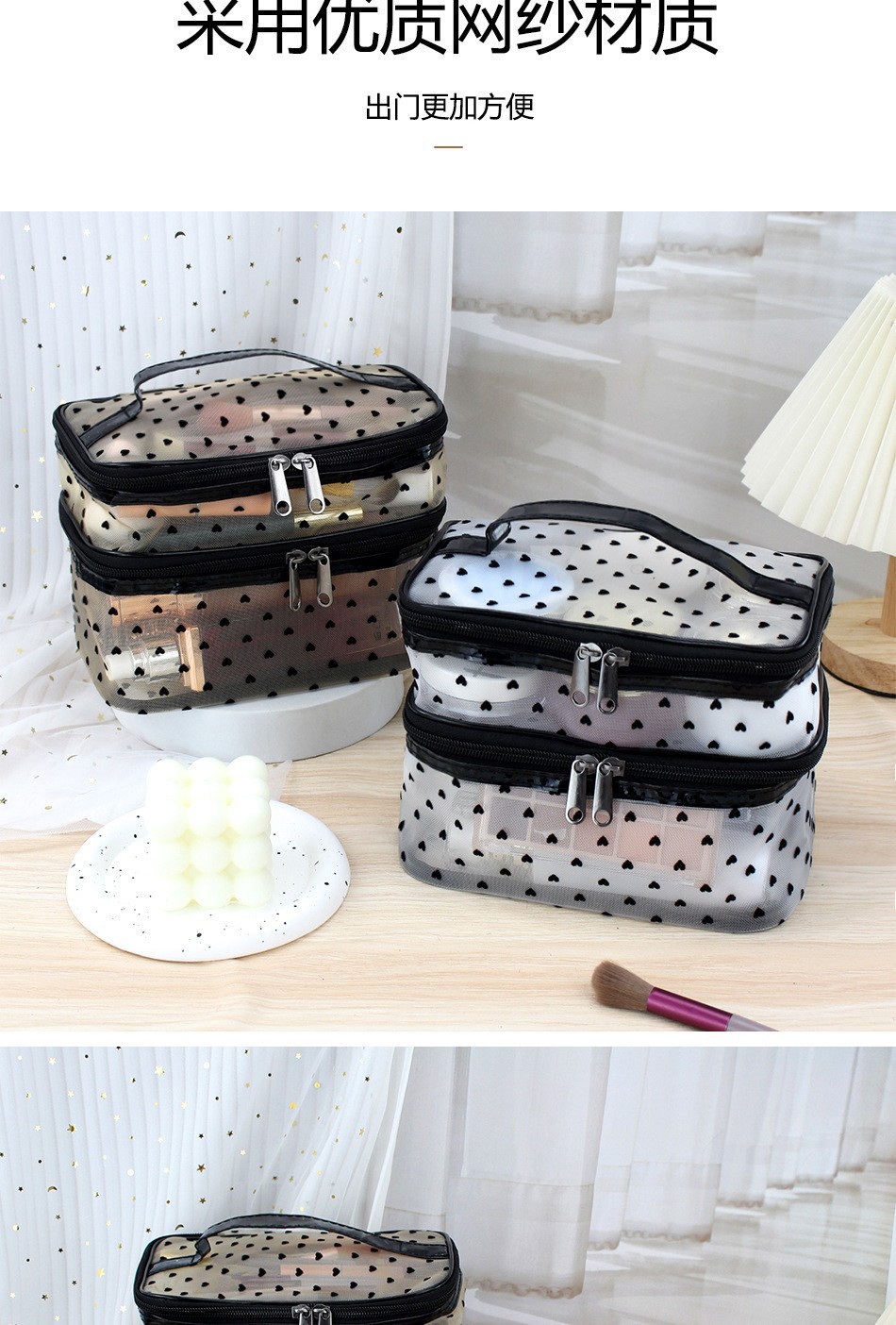 인스 메쉬 하트 모양 세면도구 수납 휴대용 여행용 대용량 화장품 가방 통기성 이우 가방 제조업체 도매스토어 가기