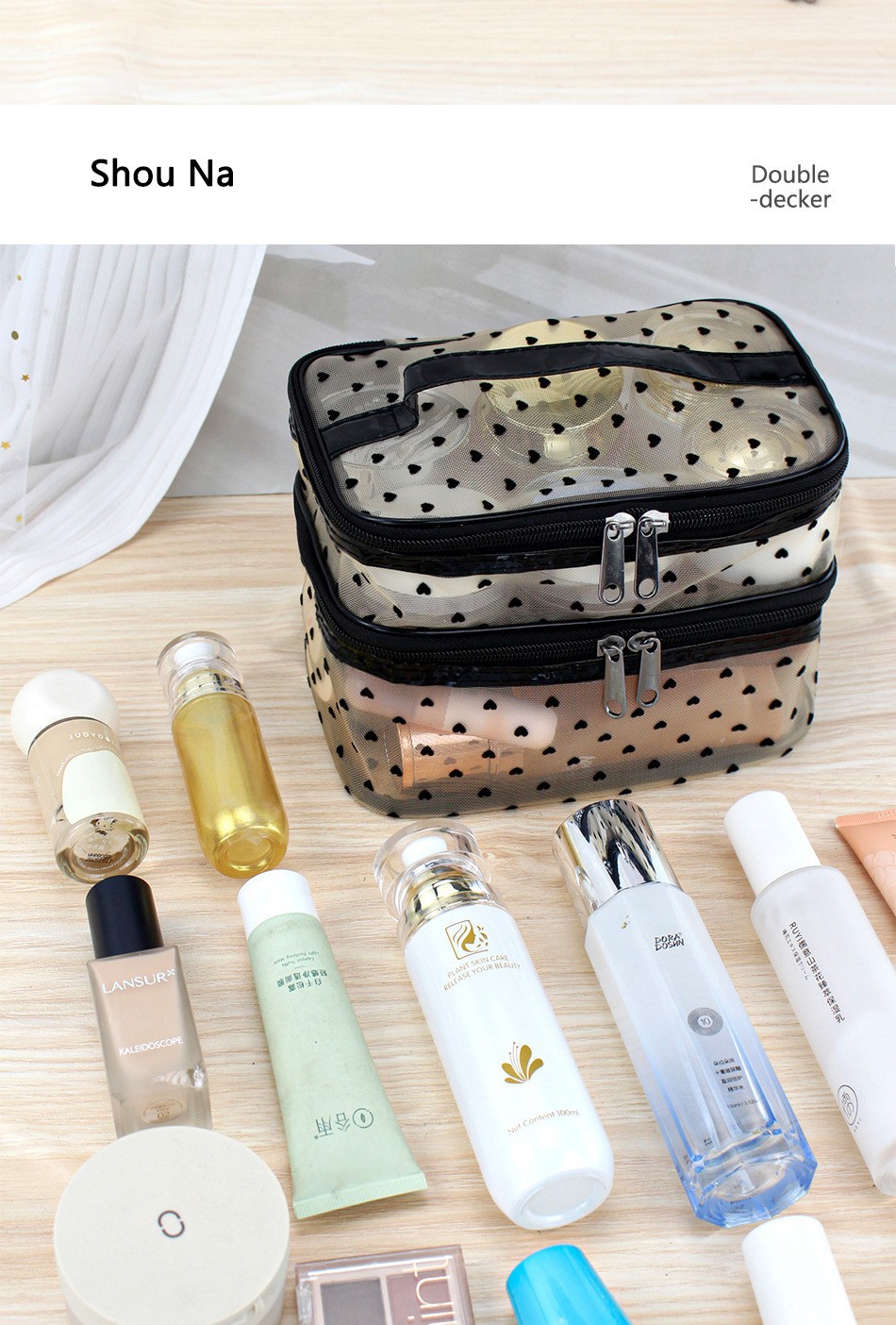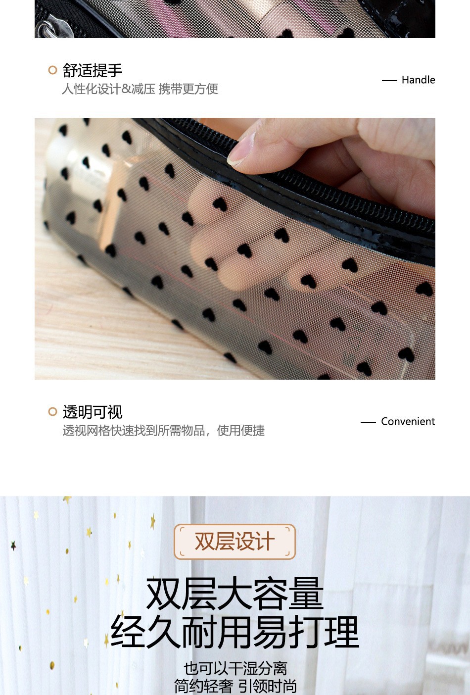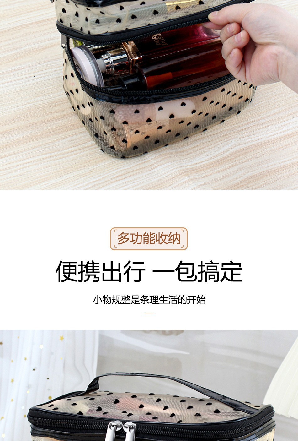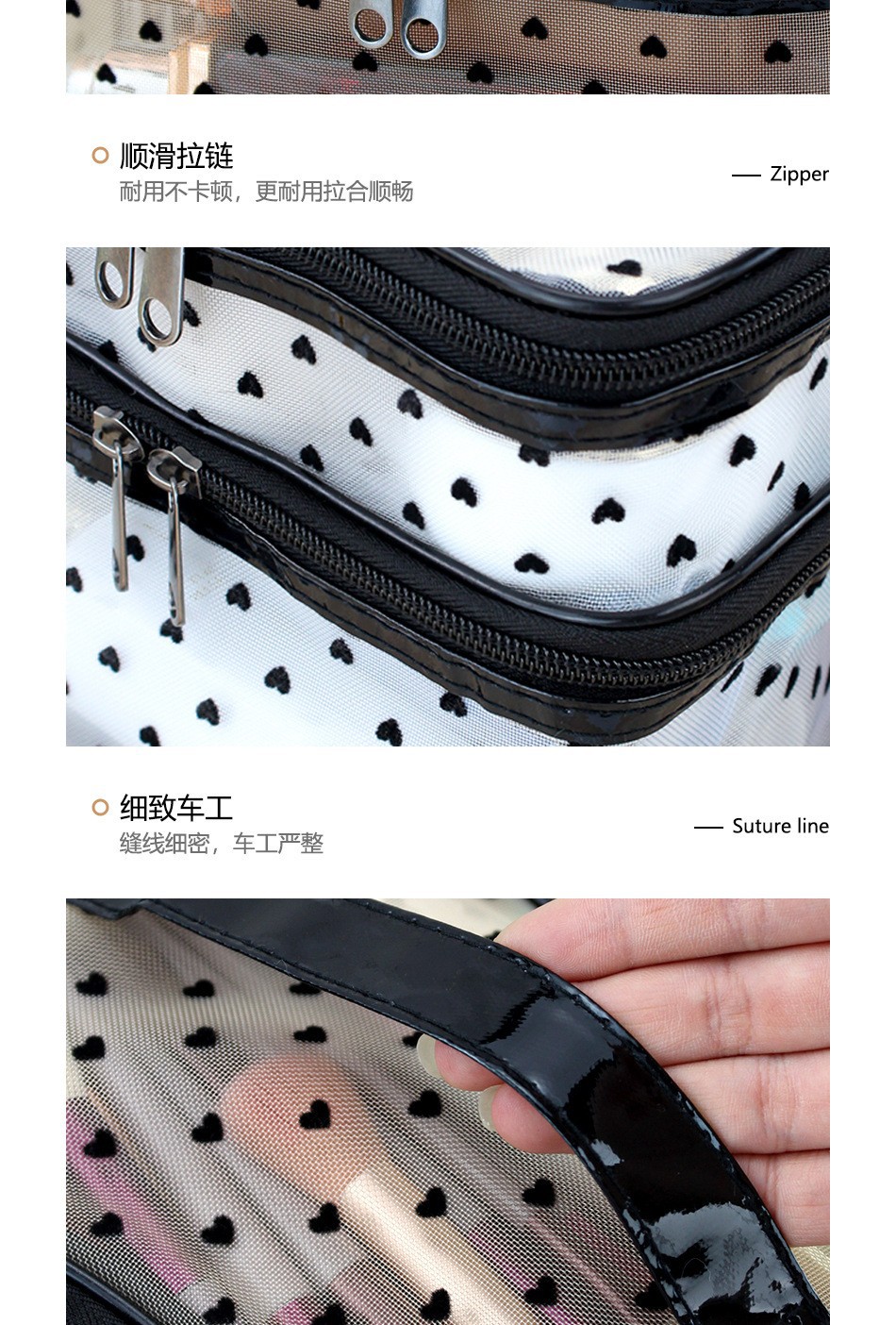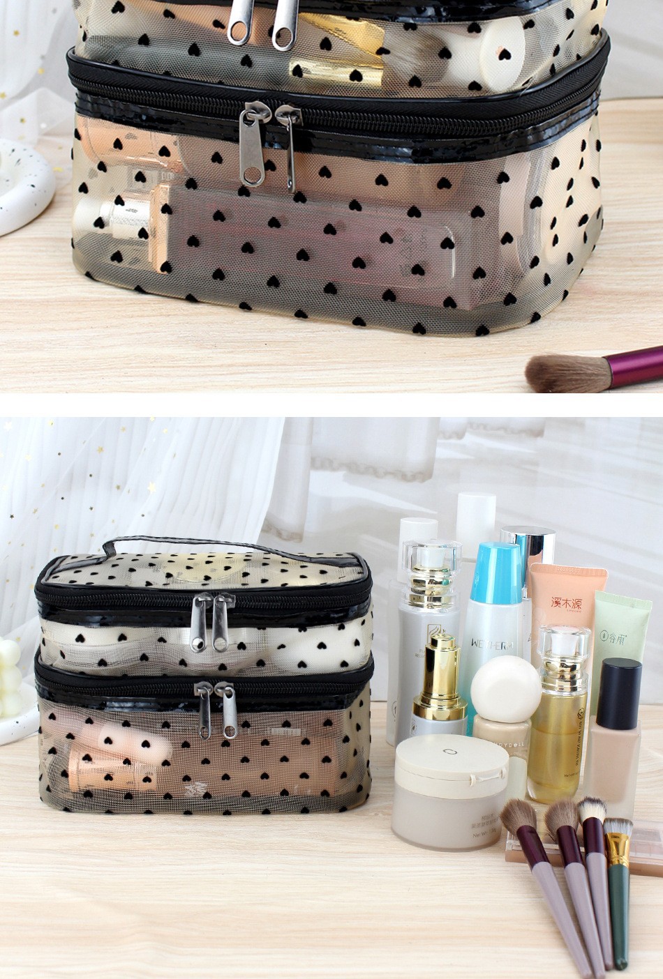 인스 메쉬 하트 모양 세면도구 수납 휴대용 여행용 대용량 화장품 가방 통기성 이우 가방 제조업체 도매