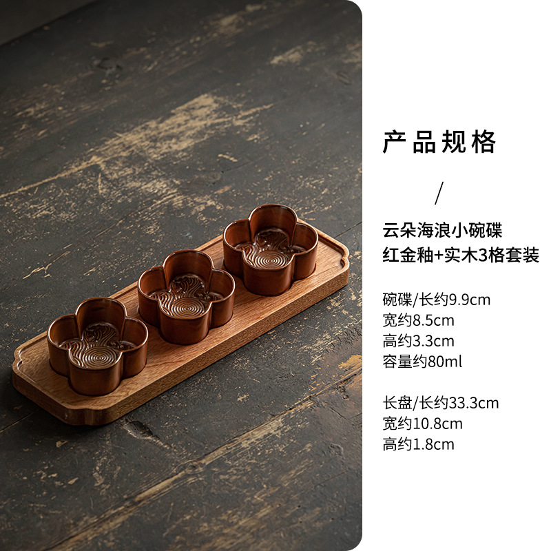• 구름과 파도 작은 접시 - 레드 골드 유약 + 원목 3칸 세트