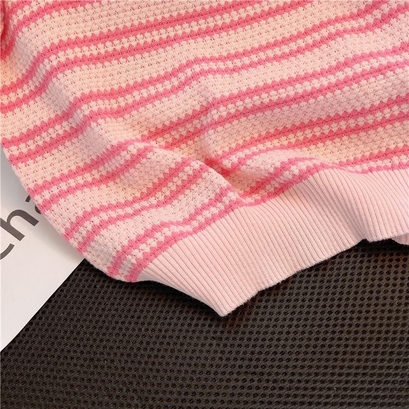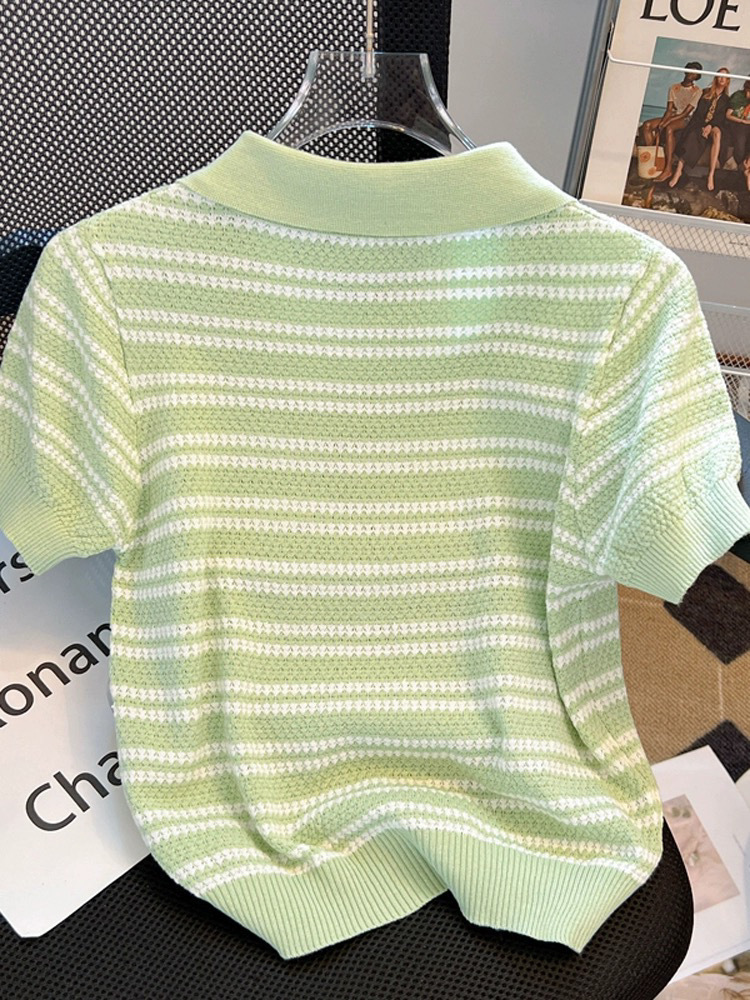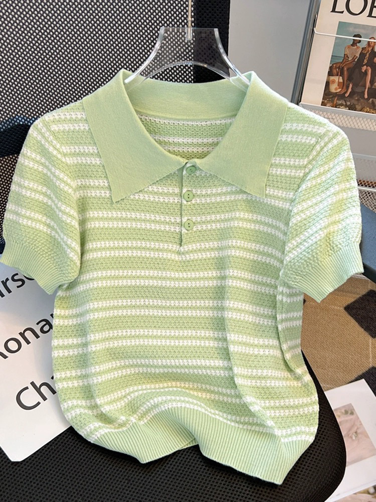 아이스 실크 반팔 여성용 스트라이프 탑 여름 대비 컬러 디자인 슬림 셔츠