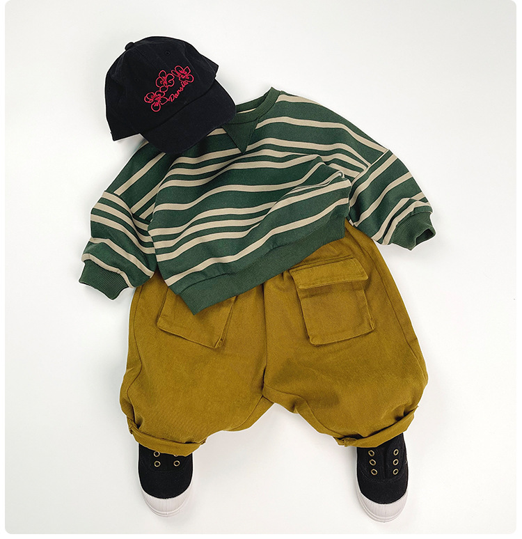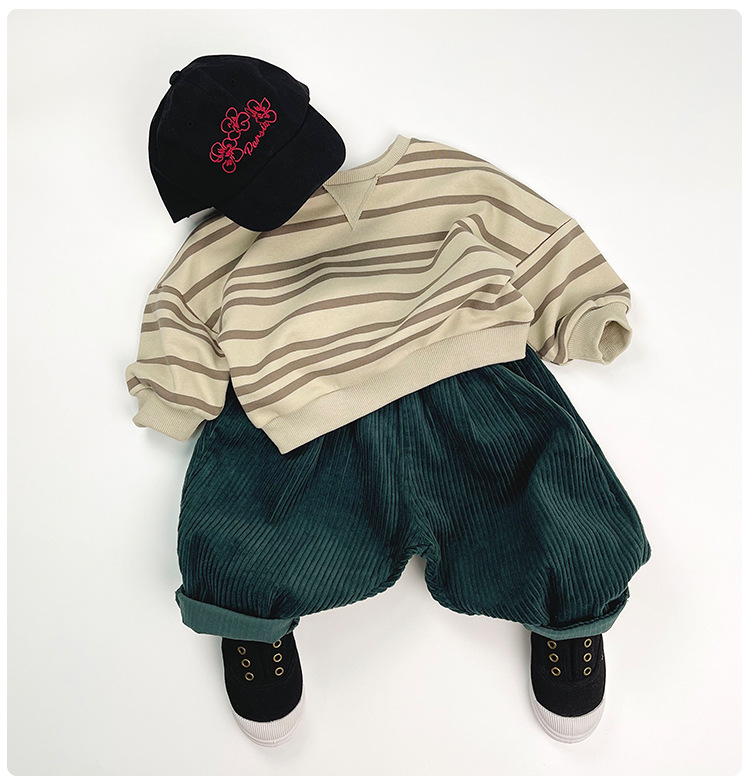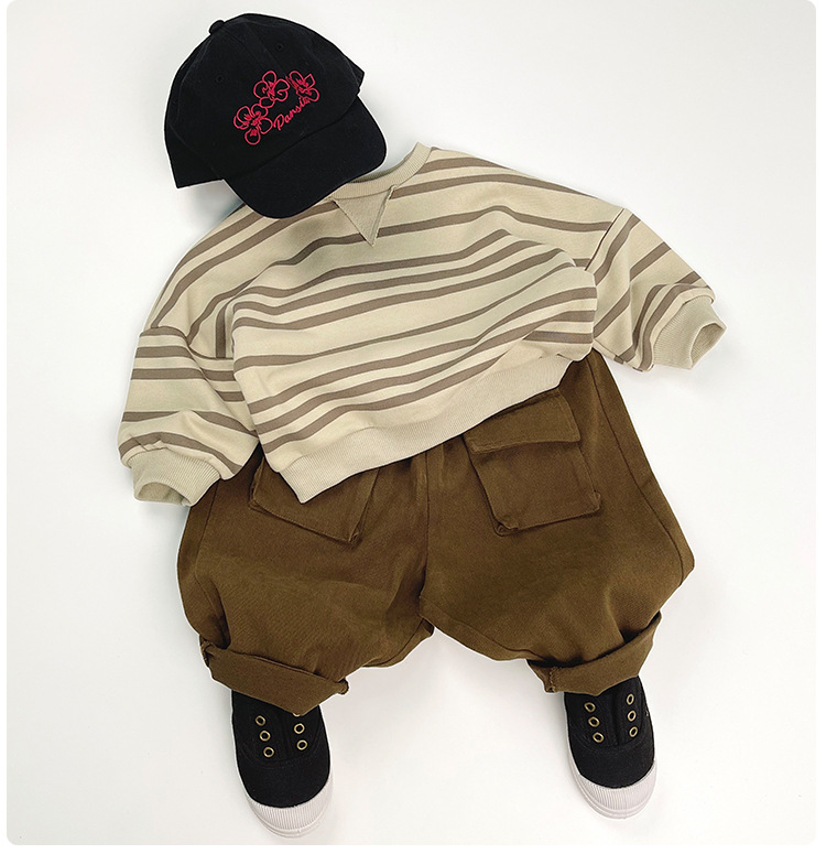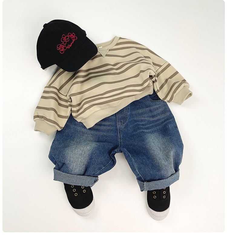우유색 스트라이프~ 봄철 아동용 래글런 코튼 스웨트셔츠 남녀공용 한국 스타일 캐주얼 루즈핏 유아 신상품