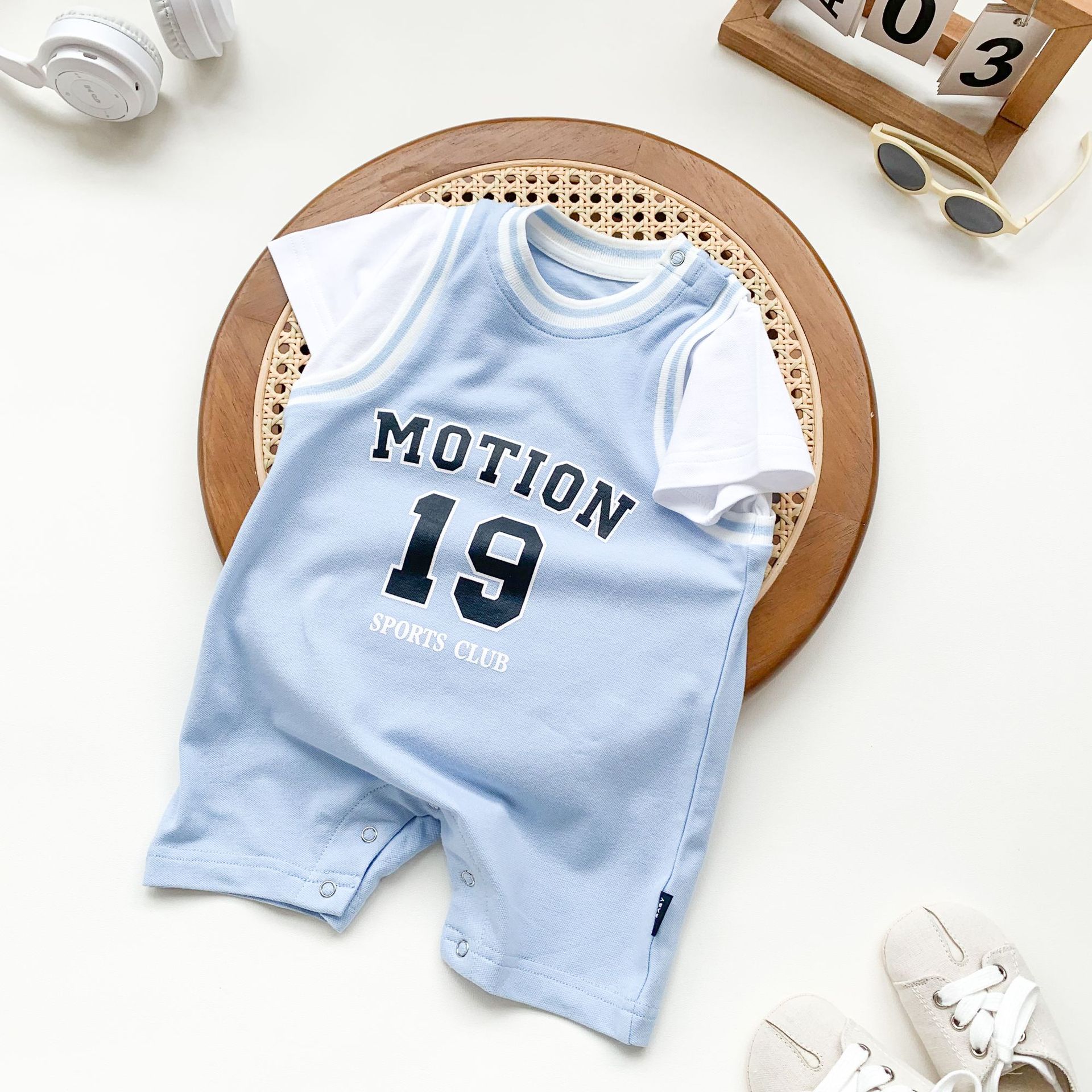 Ins Baby Jumpsuit 2024 여름 가짜 투피스 디자인 농구 모자 소년 소녀를위한 아기 등반 옷