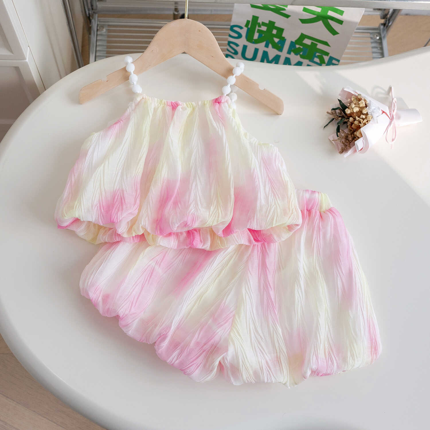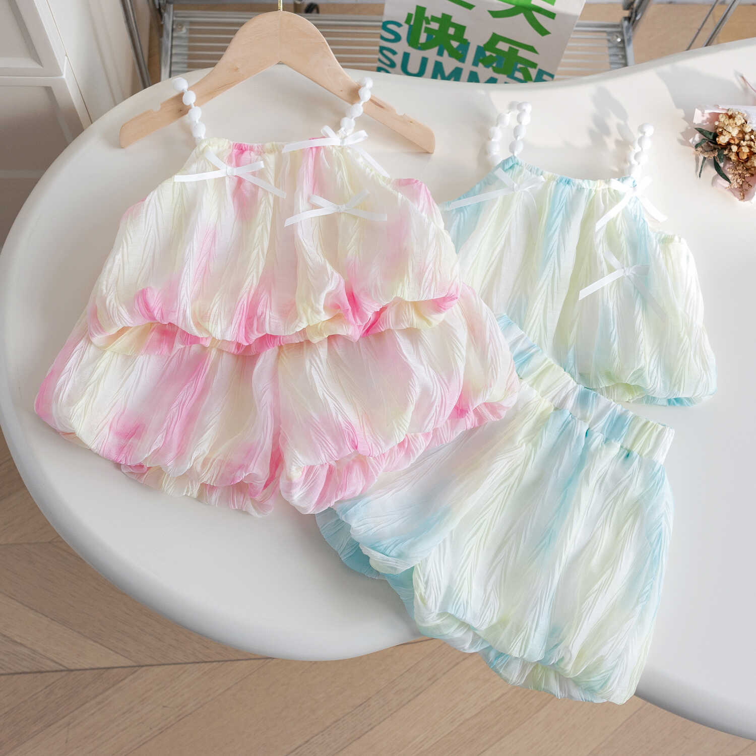 한국 스타일 소녀의 여름 원피스 세트 2024 새로운 어린이 반바지 슬링 투피스 세트 여름 서양식 아기 소녀