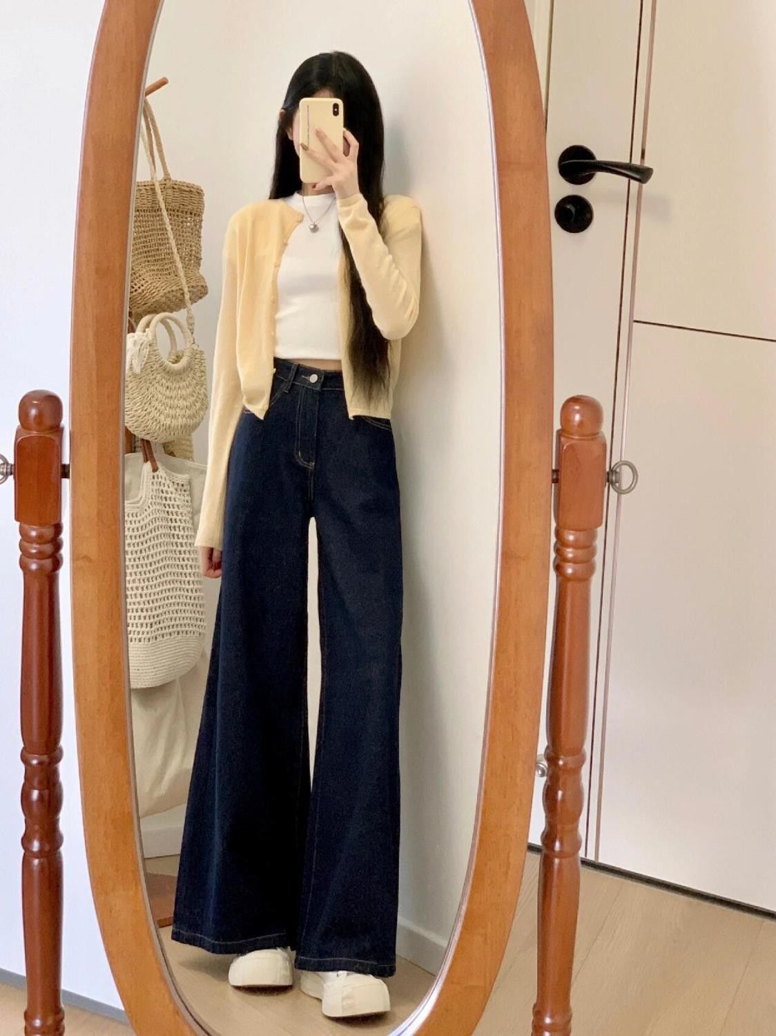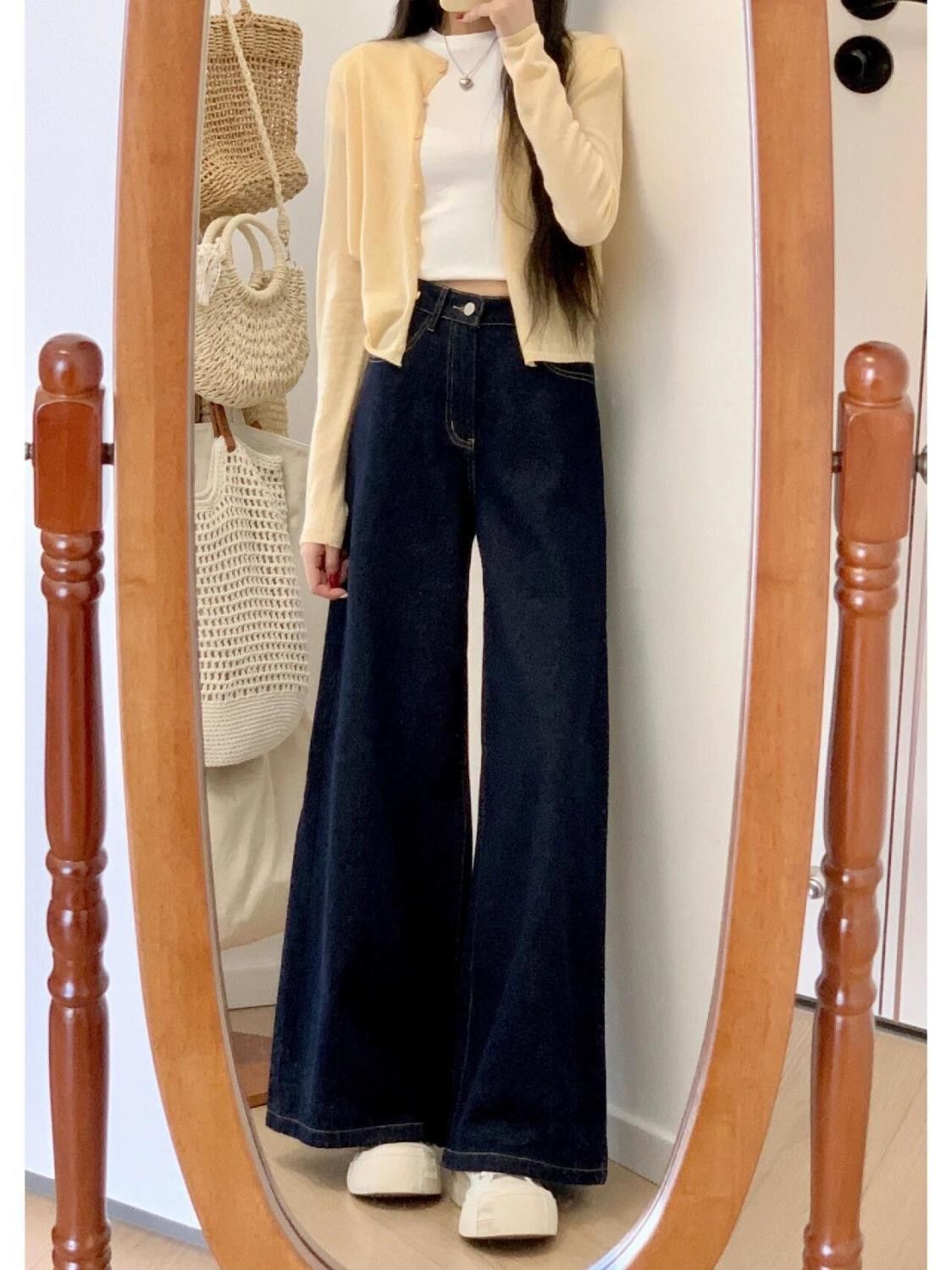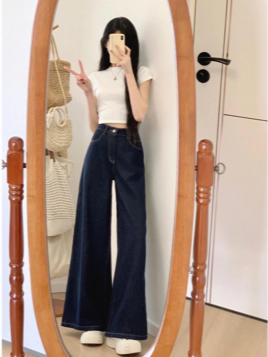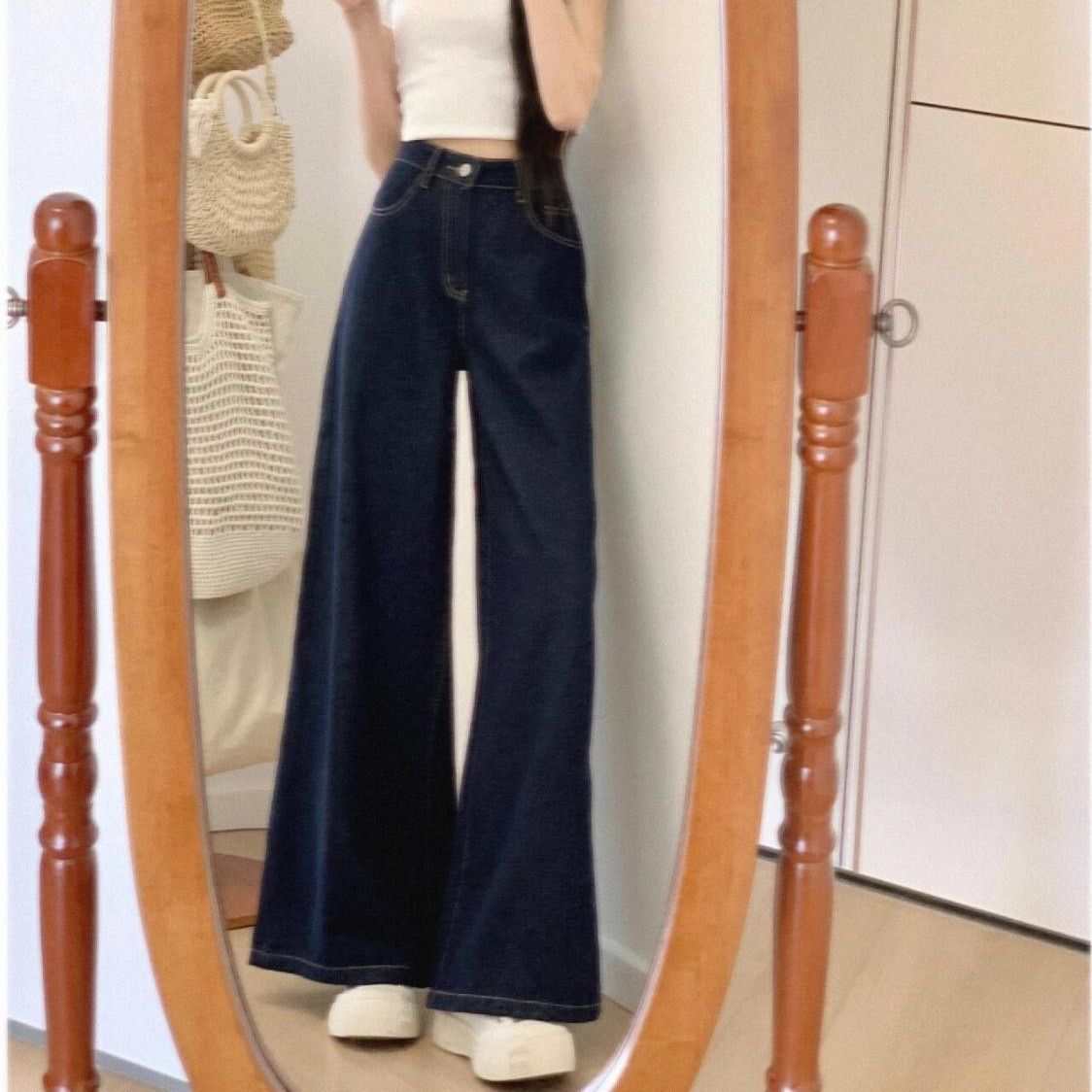플러스 사이즈 빈티지 홍콩 스타일 높은 허리 청바지 여성의 여름 느슨한 넓은 다리 바지 배 모양의 몸 통통녀 슬리밍 바지스토어 가기